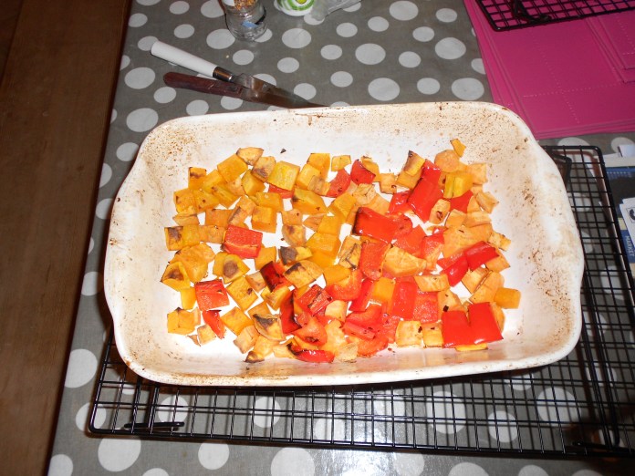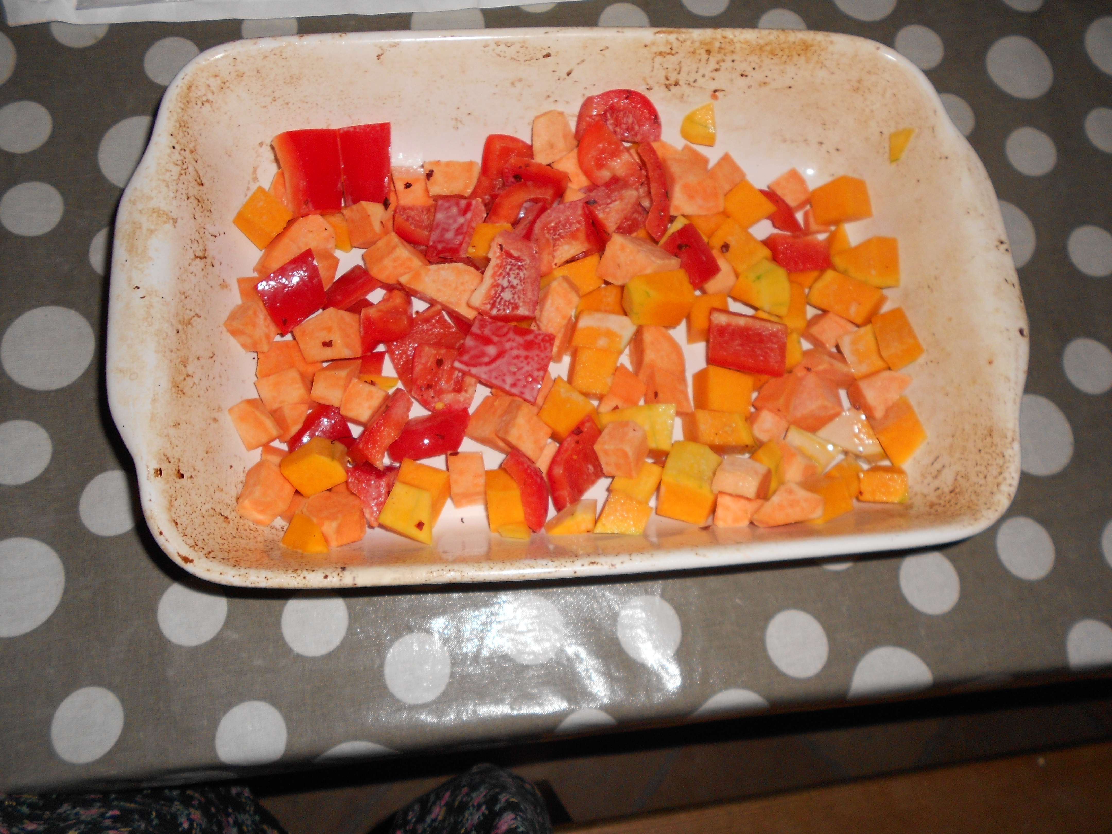 Switch the oven on to around 200°C. Peel and chop the butternut squash and sweet potato and chop the red pepper into small 1cm pieces. Put the veggies on a roasting tray sprinkle with the chilli flakes and garlic and chilli salt. Drizzle with olive oil or spray with fry light and put this in the oven for approx 20 minutes.