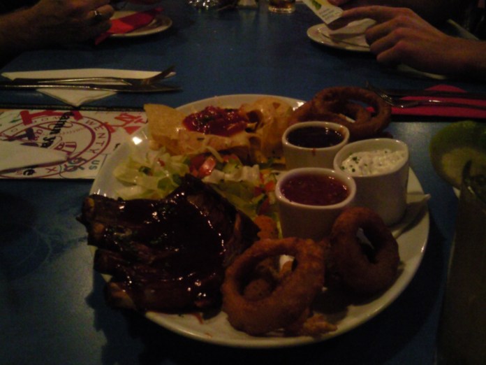 To start off with a few of my work friends and I got the combo starter which included onion rings, nachos, mozzarella sticks, tempura prawns and ribs: