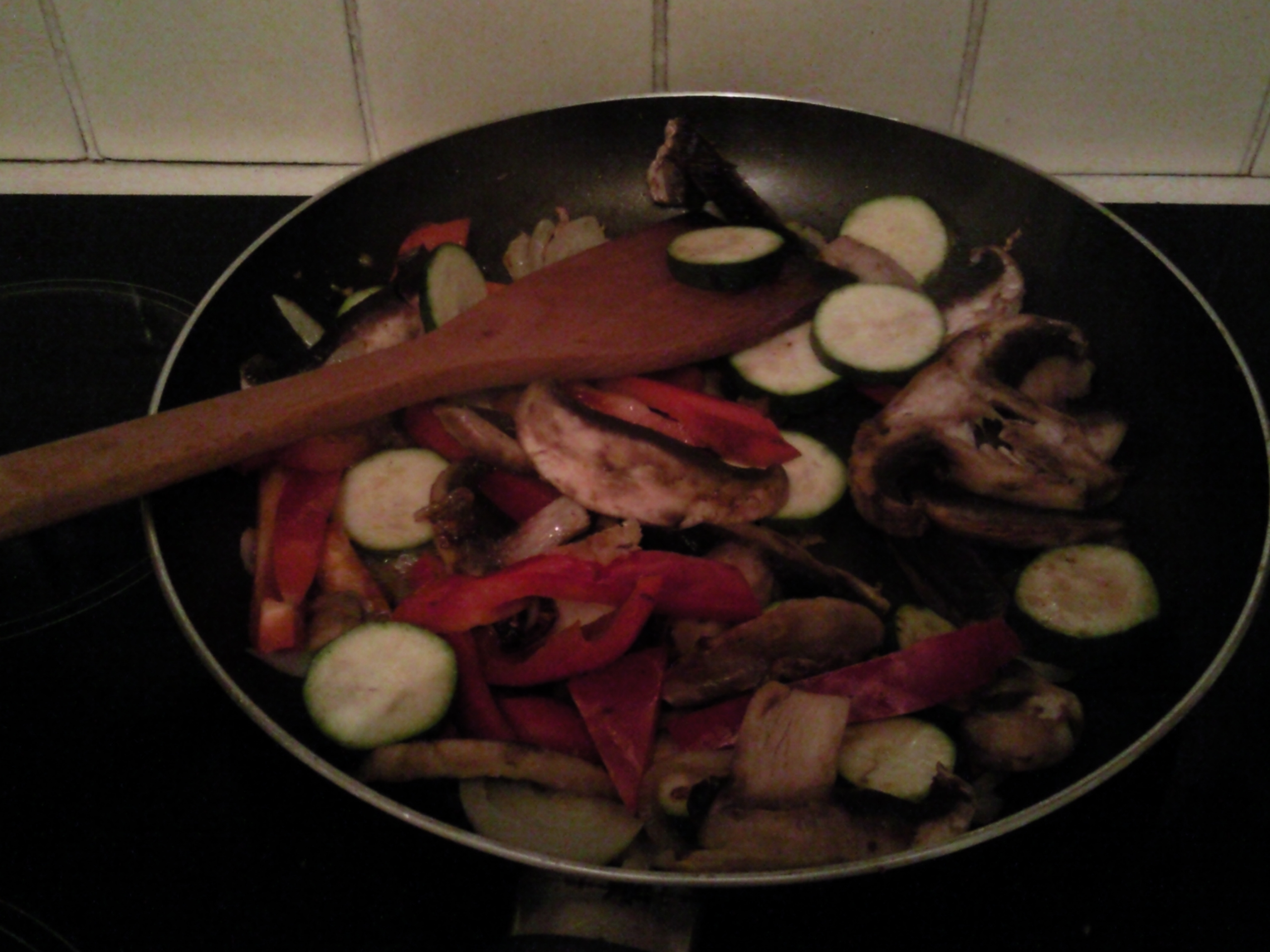 Heat the oil in a large frying pan, add the onion and garlic on a medium heat until they are golden brown and soft. Add the rest of the vegetables and fry for a few minutes until they look partially cooked and the mushrooms have reduced in size.