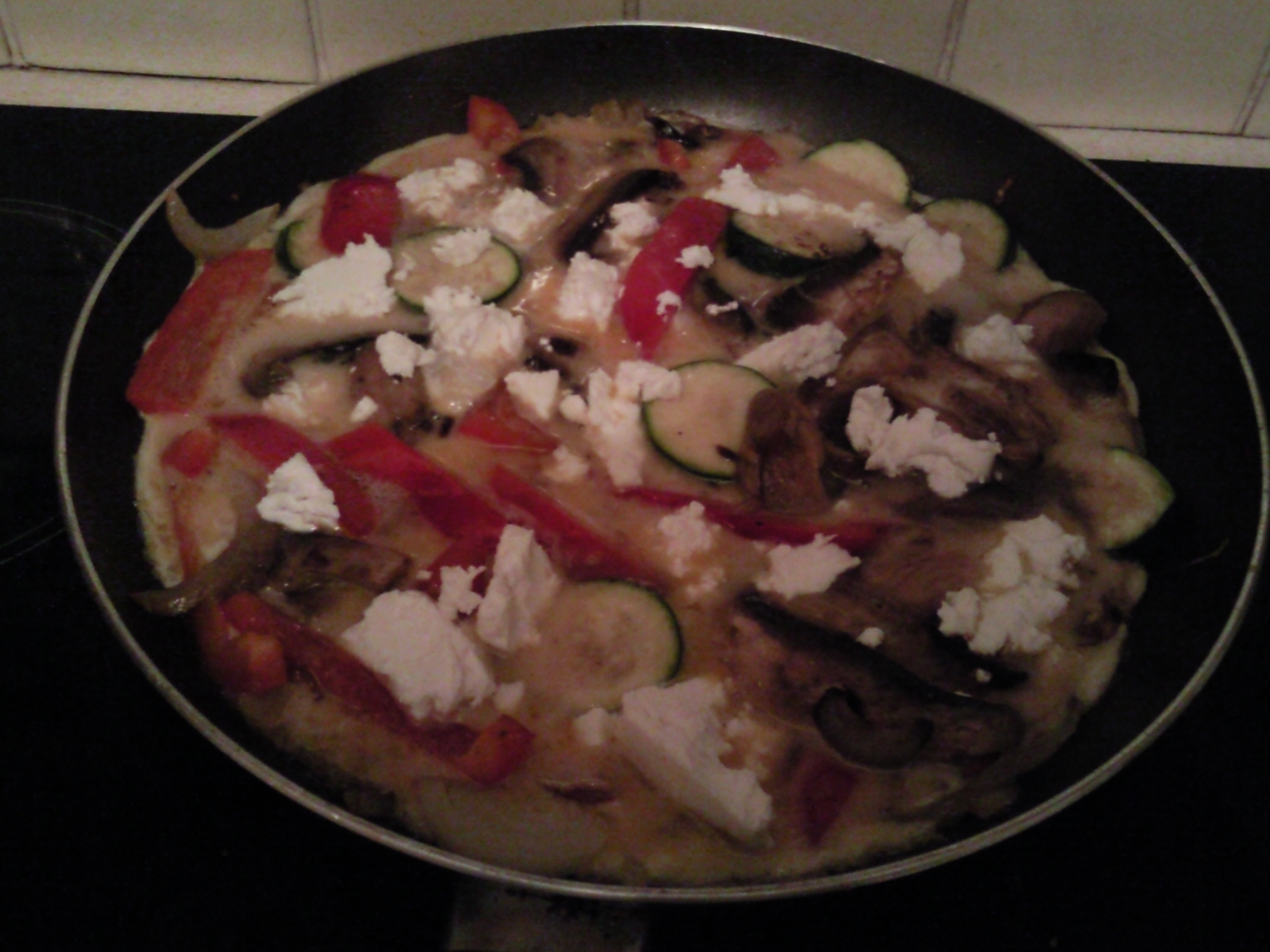 Pour over the egg mixture and let the eggs cook for a couple of minutes. Add blobs of goats cheese as you want through the omelette (or you could add another type of cheese, cooked bacon, ham or chicken). Leave the egg mix at this point unless you love scrambled egg with vegetable bits in it. When the egg is mostly cooked you will need to flip the omelette.