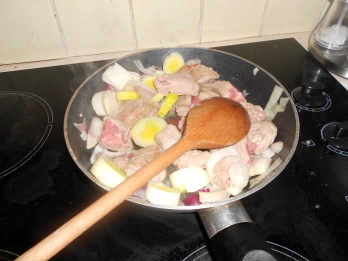 The night before you plan to eat the stew chop your shallots/onions (I cried my eye make-up off doing this bit and spent the rest of my evening looking racoon-esque), slice your garlic and leeks. Chop your lamb into pieces; you can leave it whole if you want though, when I use lamb chops I don’t cut them up. Heat the oil and butter, fry the shallots, leek and garlic until soft and throw in the lamb and fry just long enough so that the lamb browns to add some flavour.