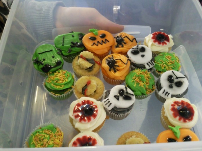 Well ladies and gentlemen, as one of my friends would say, I have been riding the sugar wave today. Aside from the tiffin made in the previous post I have eaten a large amount of treats I bought for trick or treaters that never appeared and cake. Possibly the mostly beautiful and gory Hallowe’en cakes I have ever seen. These babies were made by my work friend Miss M who I asked very nicely for permission to show to you guys.