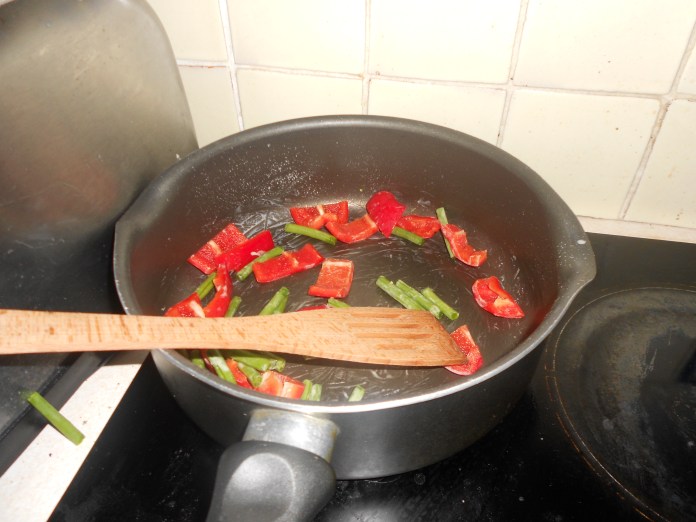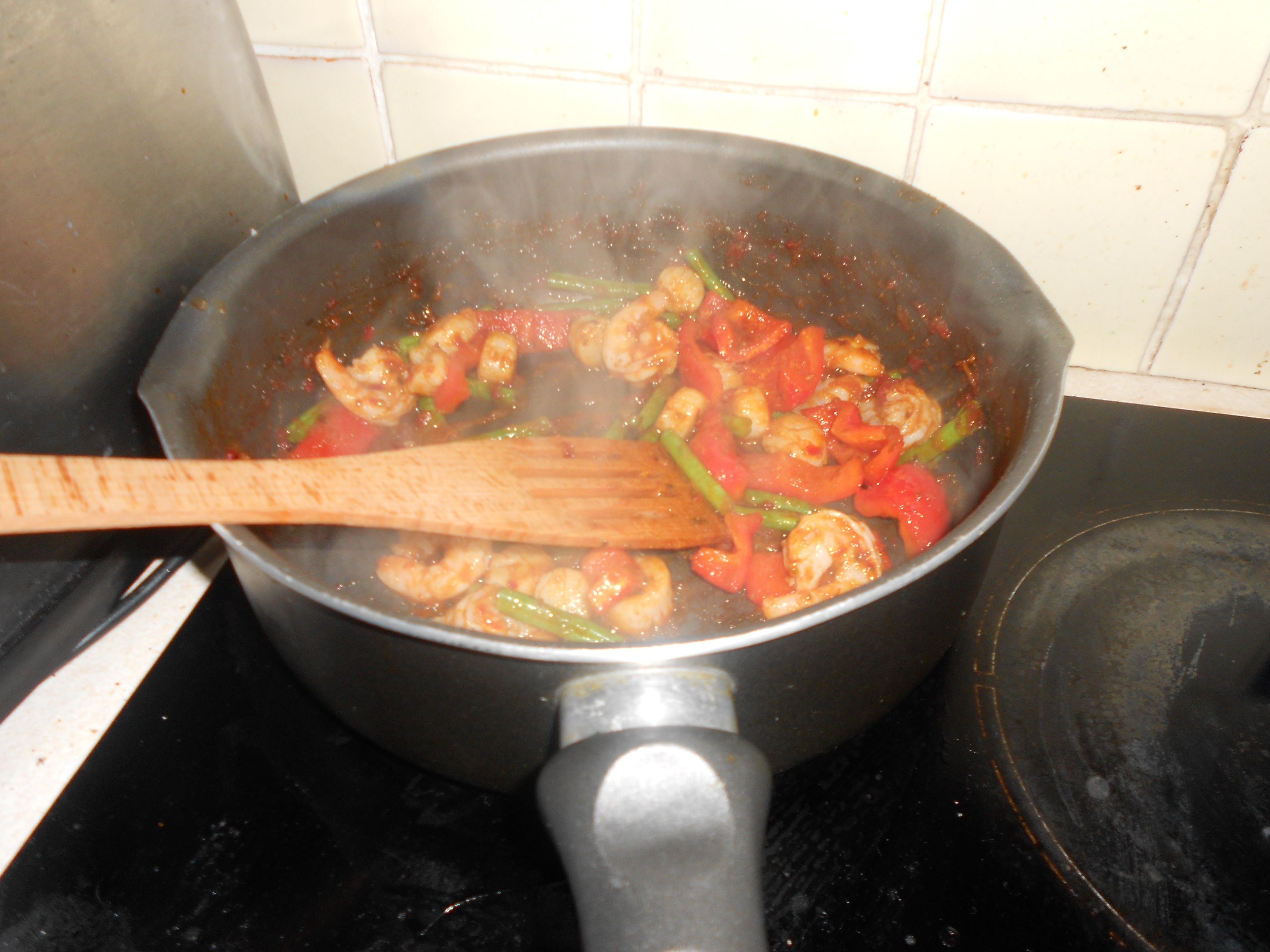 Chop the pepper and green veg into bitesized pieces. Butterfly cut the prawns – a trick my Dad showed me where you slice them almost in half which makes them cook more consistently. Put these to one side keeping the fish and vegetables separate.