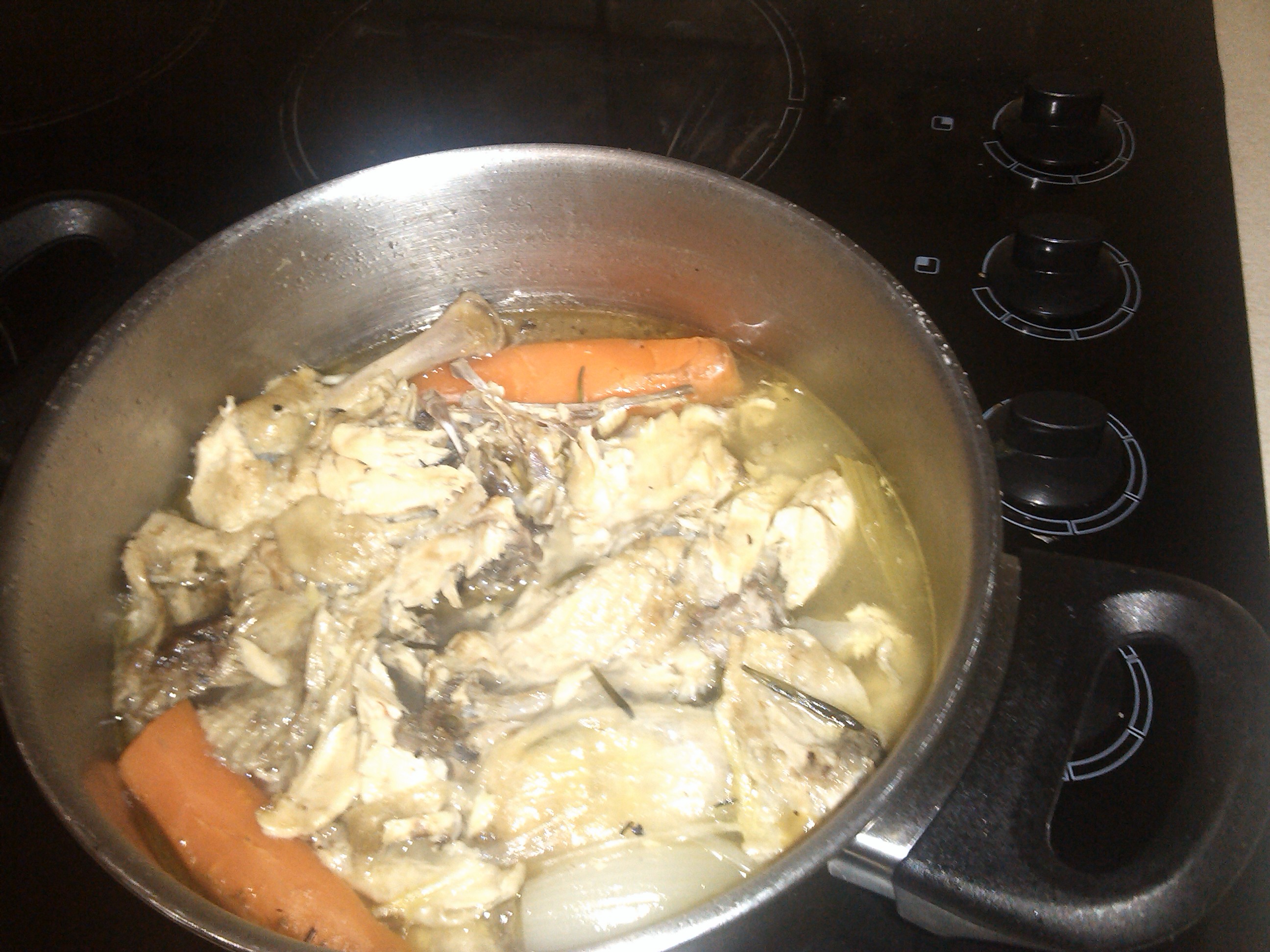 Pick the bones clean of any remaining chicken you want to eat. Keep back skin (if you like skin, I personally don’t) as this adds some flavour.