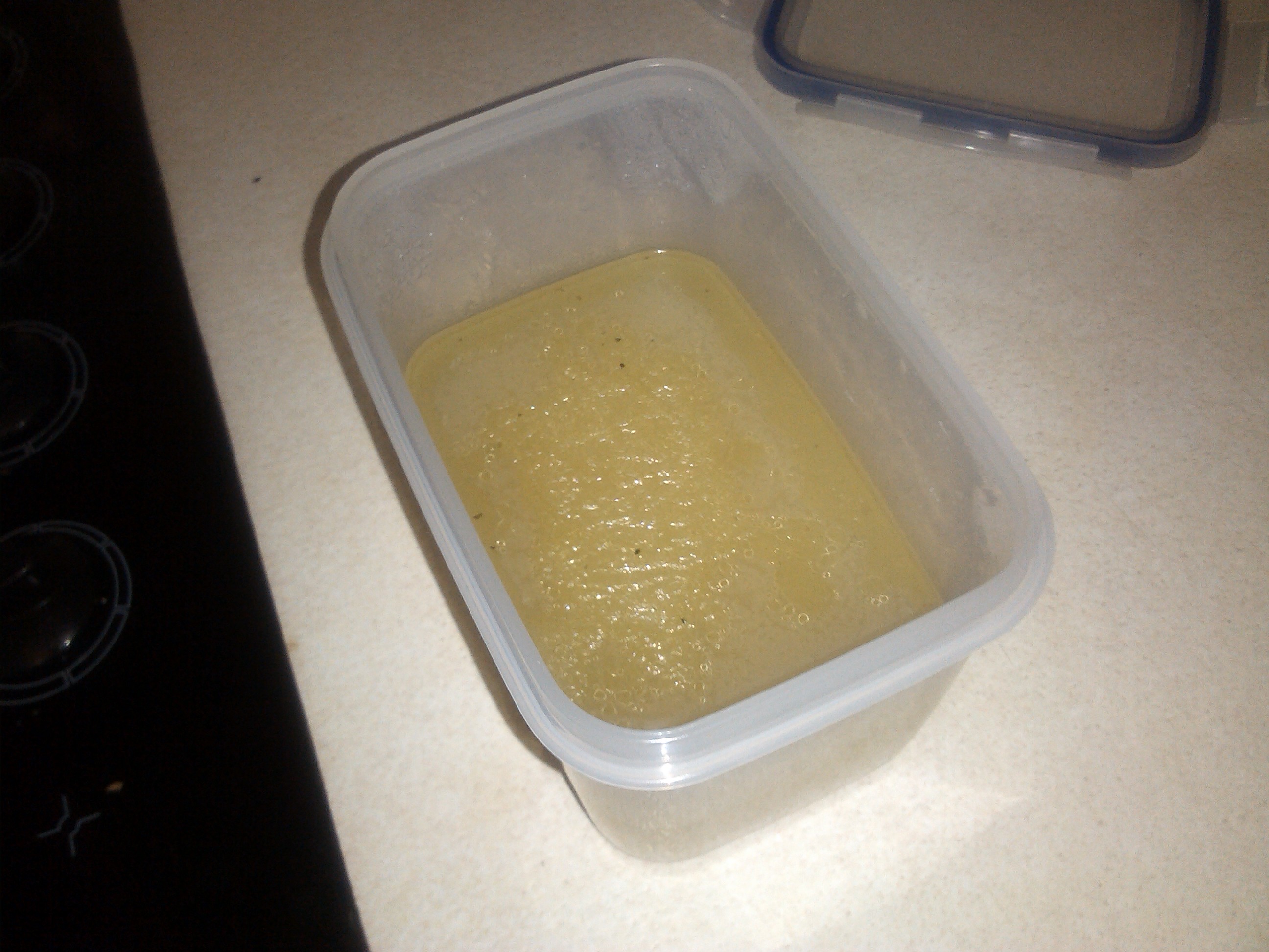 When you think the stock is tasty and ready use a sieve to strain the liquid from the chicken bones and vegetables into your desired container. Leave to cool and skim the far from the top.