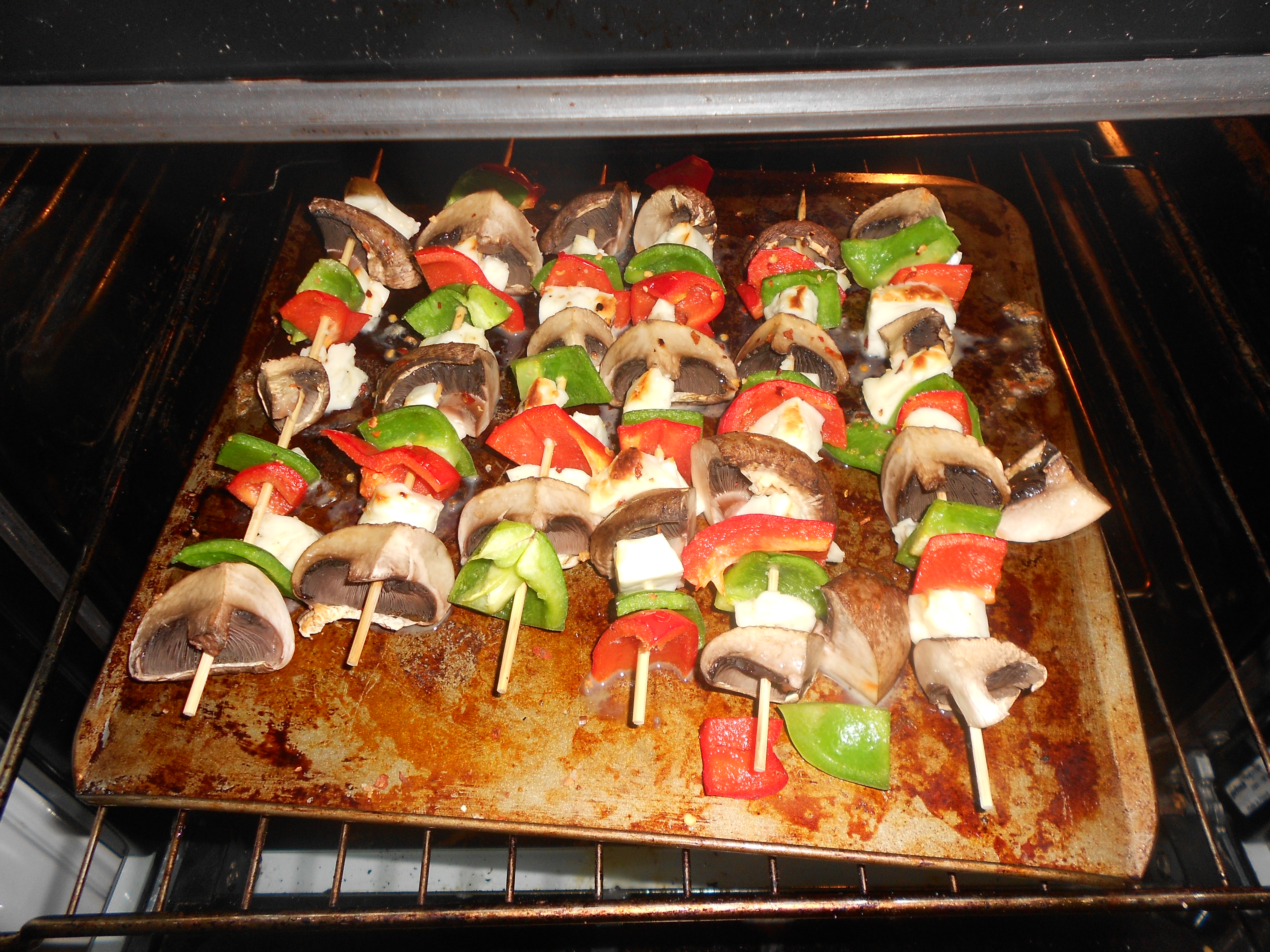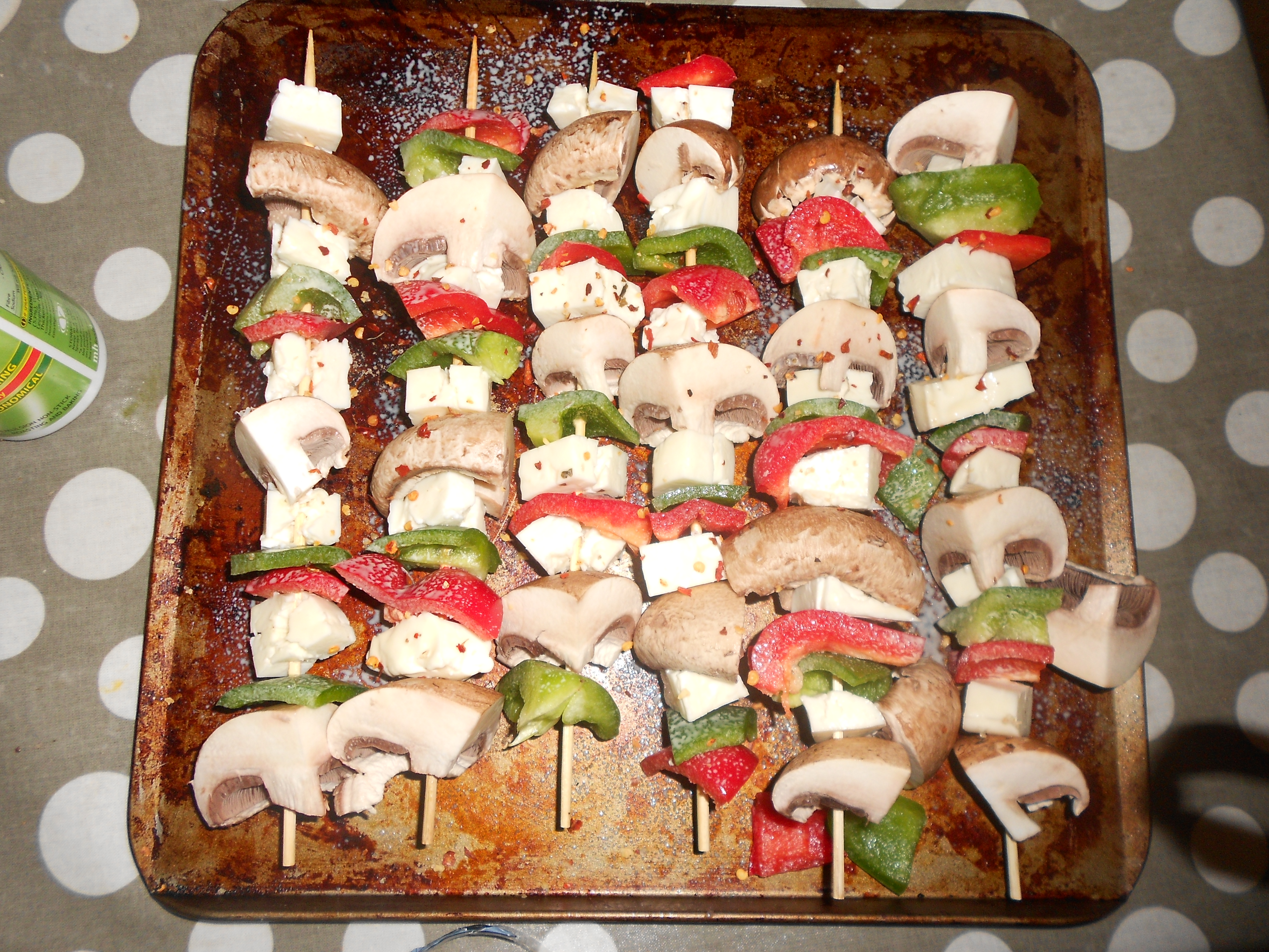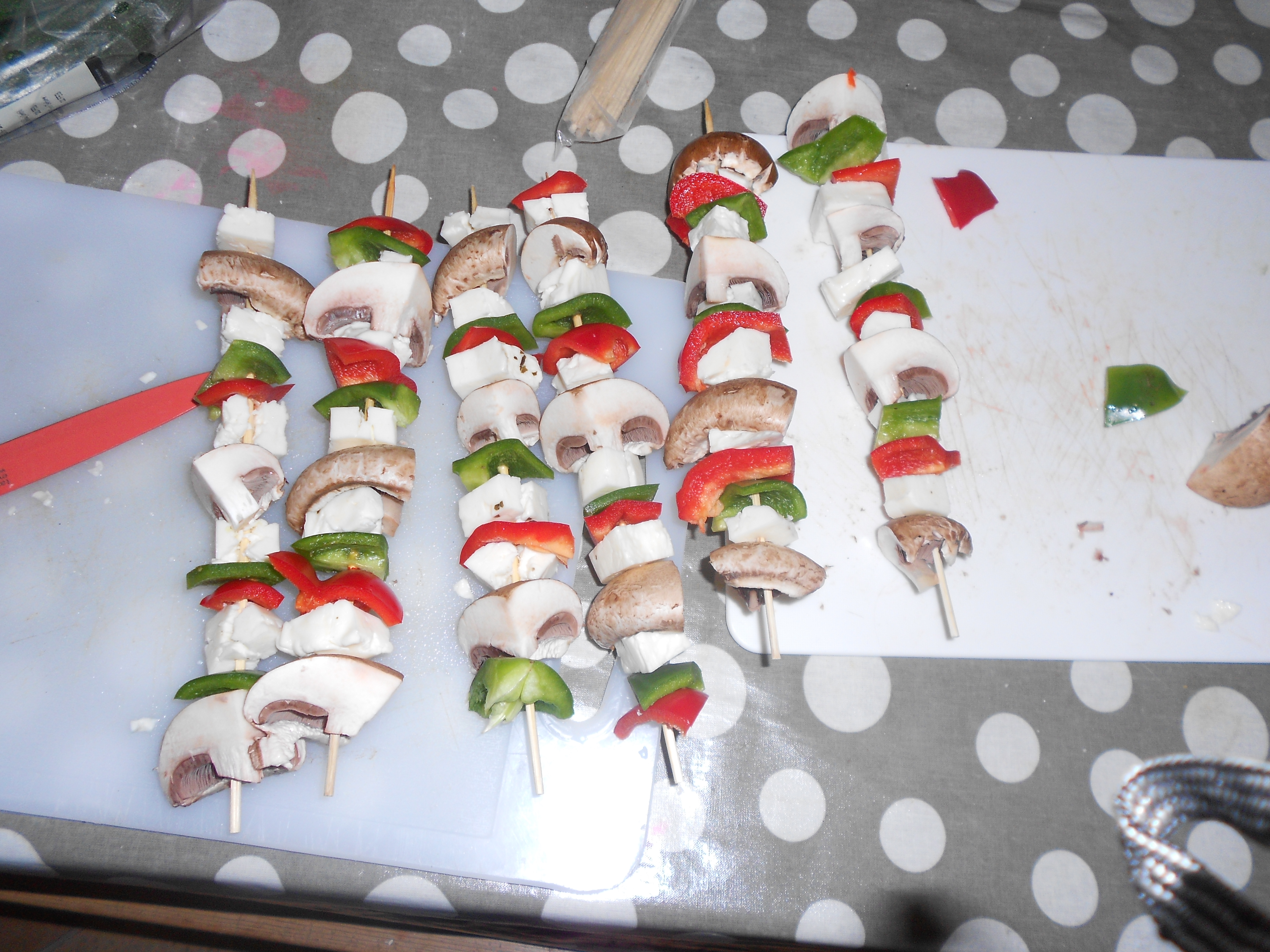 Thread your vegetables and cheese onto your skewers in whatever order you fancy. If you have some pieces of pepper or mushroom leftover just grill them alongside the skewers.