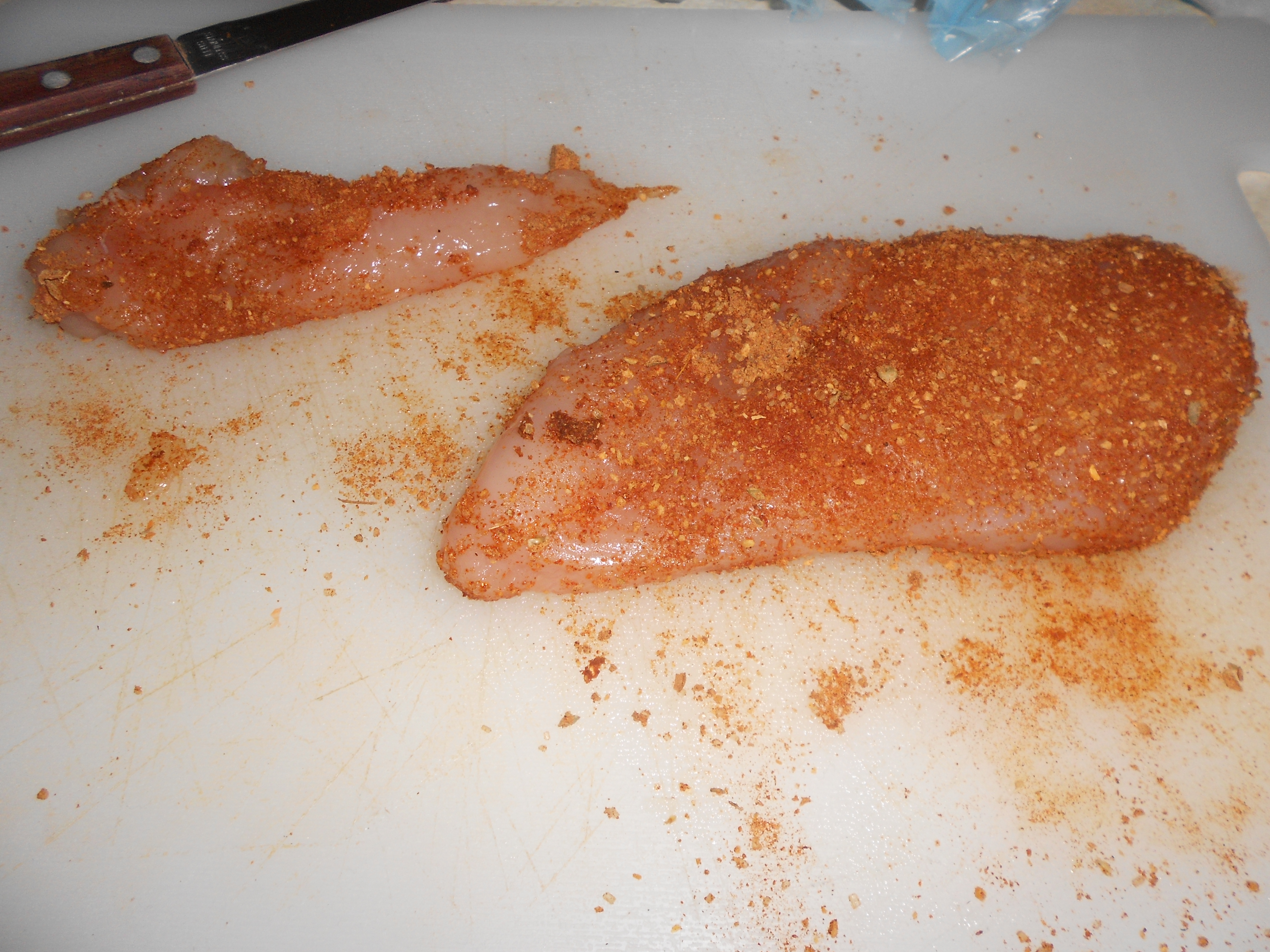 Take the chicken breast and pour your seasoning on. Lightly press the seasoning onto your chicken breast. This will form the spicy “crust” during cooking. Remember to wash your hands after handling chicken. (It really goes without saying but I’d hate for somebody to get food poising attempting this!
