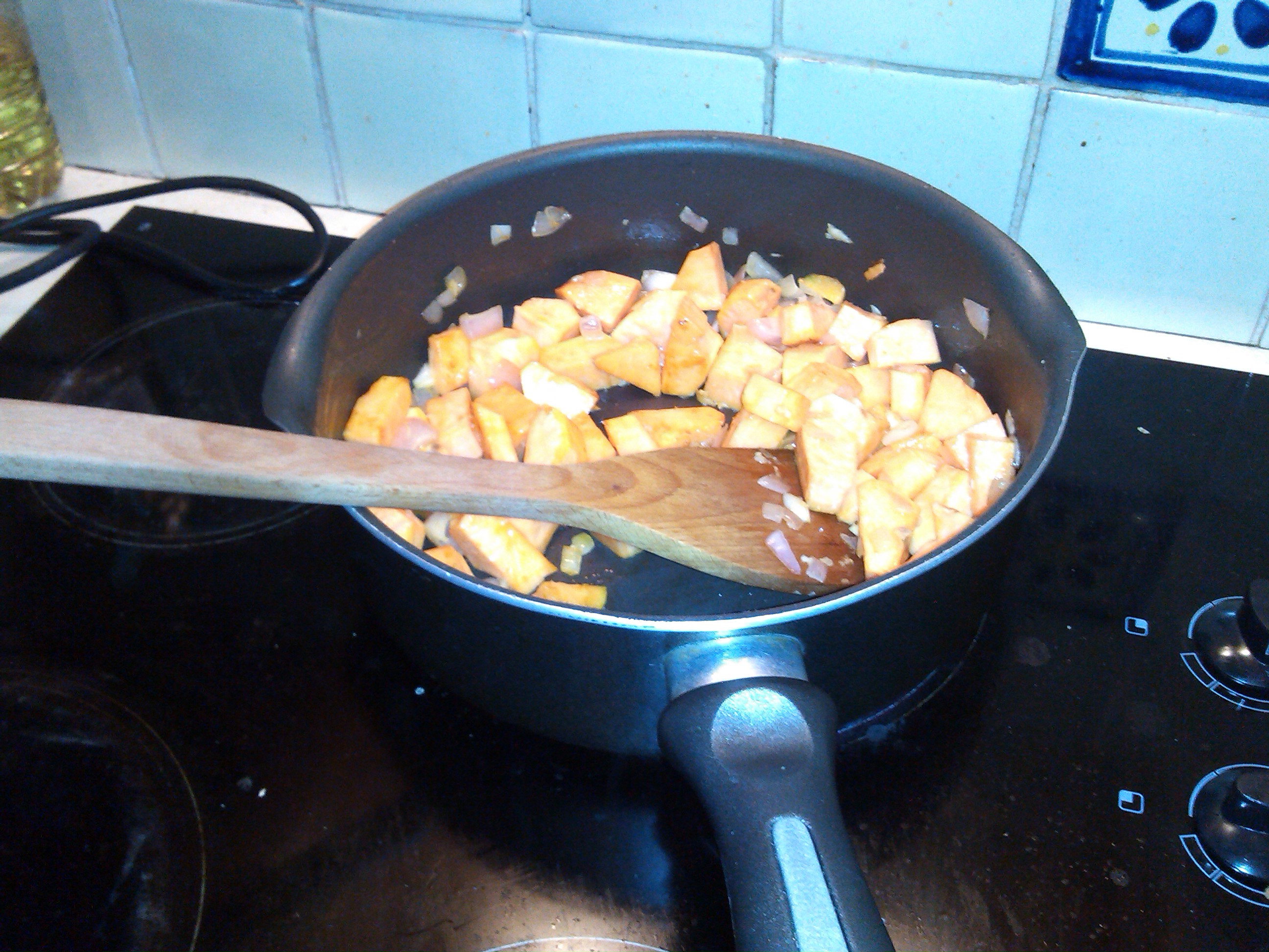 Add the sweet potato and fry until the sweet potato is golden brown in parts.