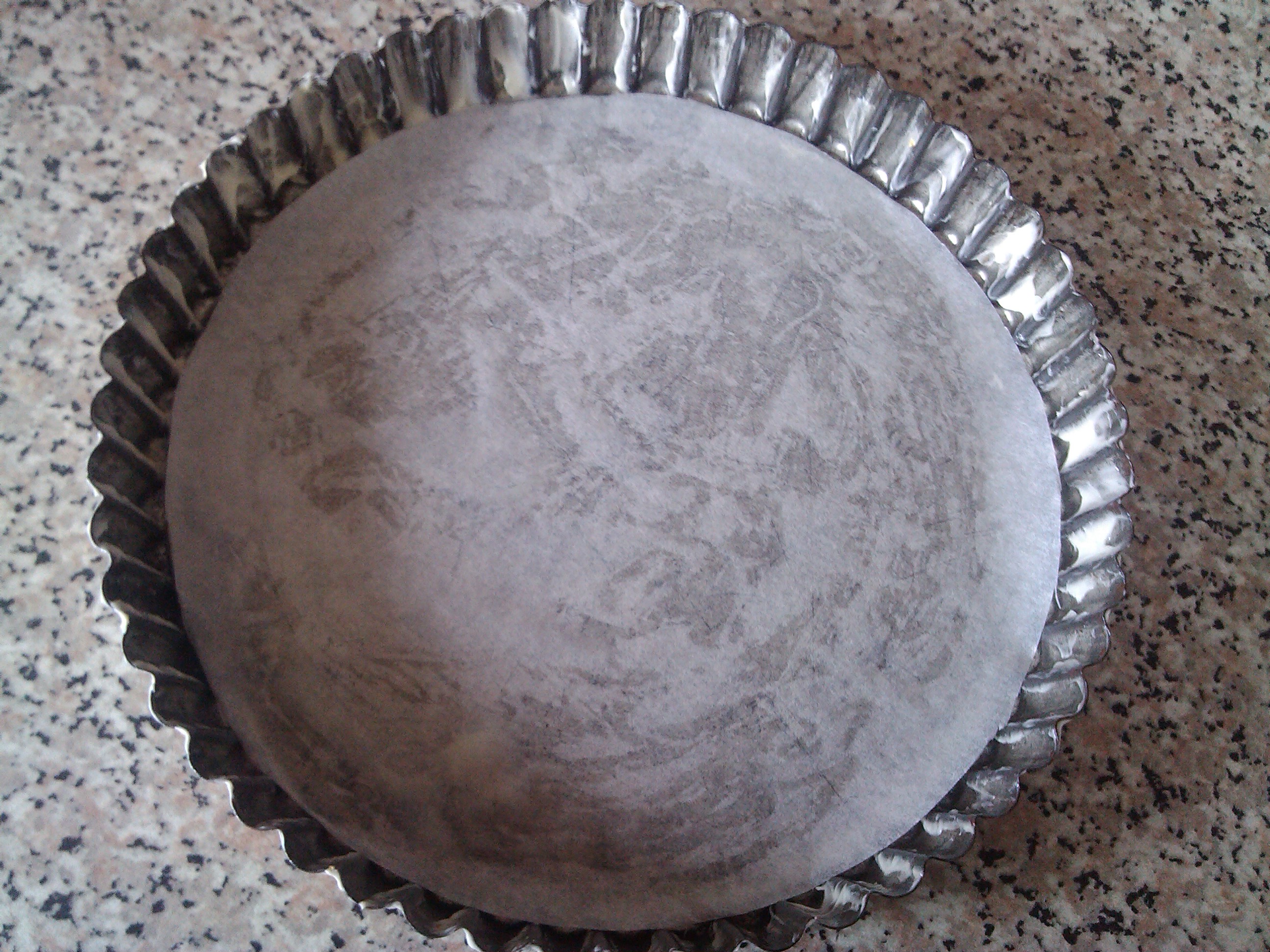Switch on your oven to 180°C. Grease a loose bottomed tin that can go into the oven (I used my Dad’s flan tin that was approx 20cms and was the perfect size really). Line the tin with greaseproof paper.