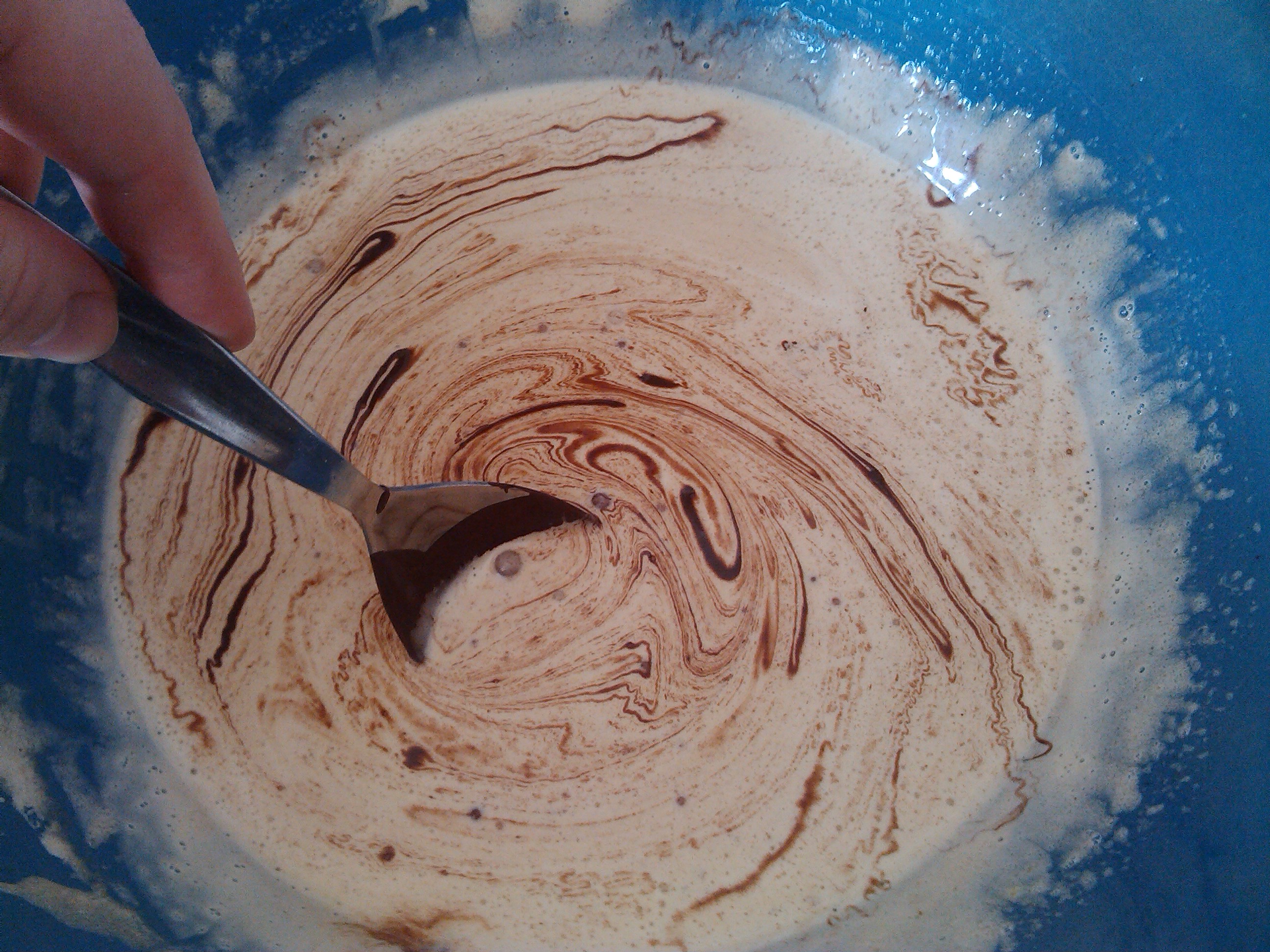 Stir the egg whites into the chocolate mixture a bit at a time.