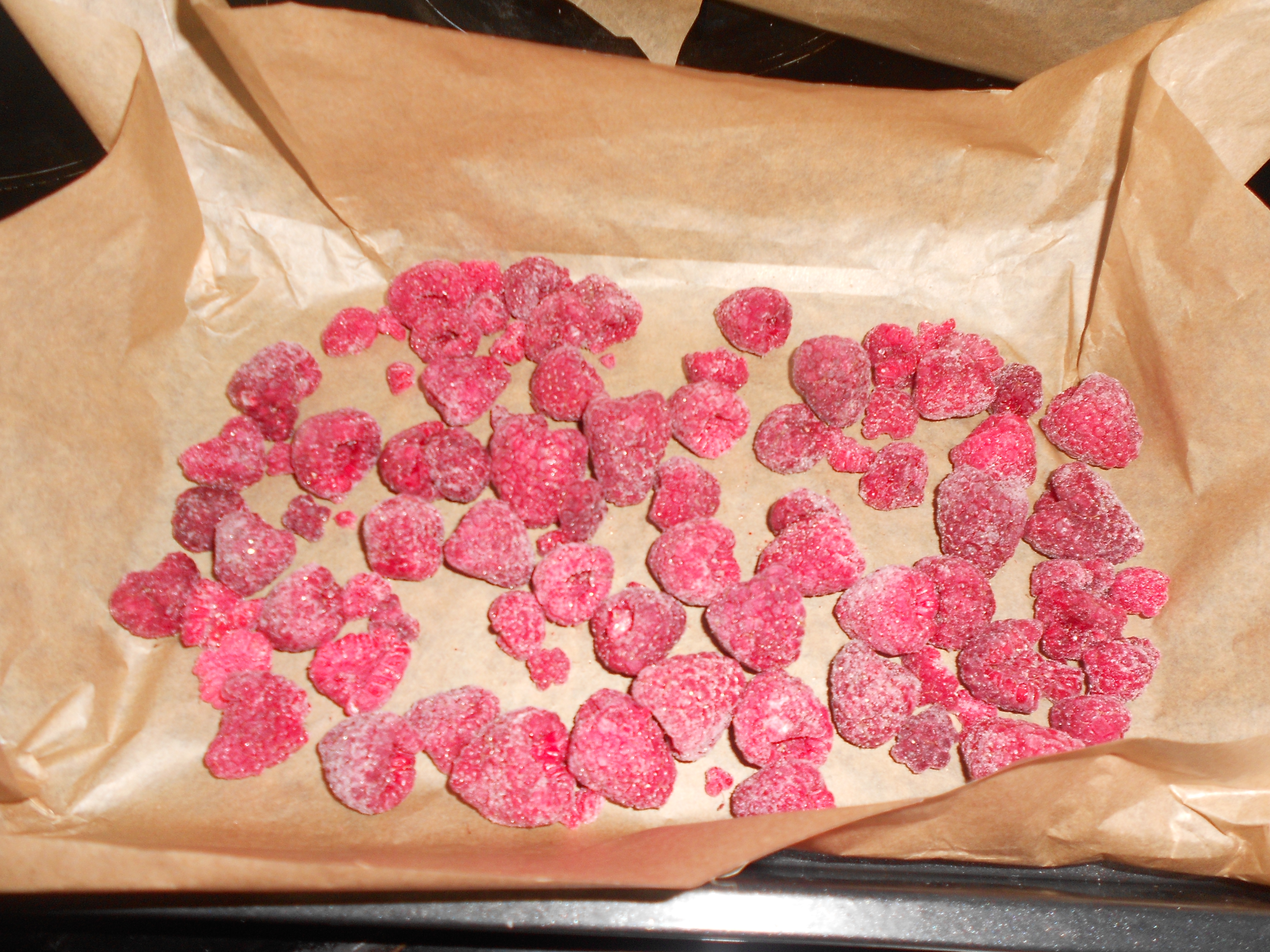 Preheat the oven to 180°C. Line a small baking tin with grease poof paper or baking paper. Add your raspberries to the paper. This will help weigh down the baking paper.