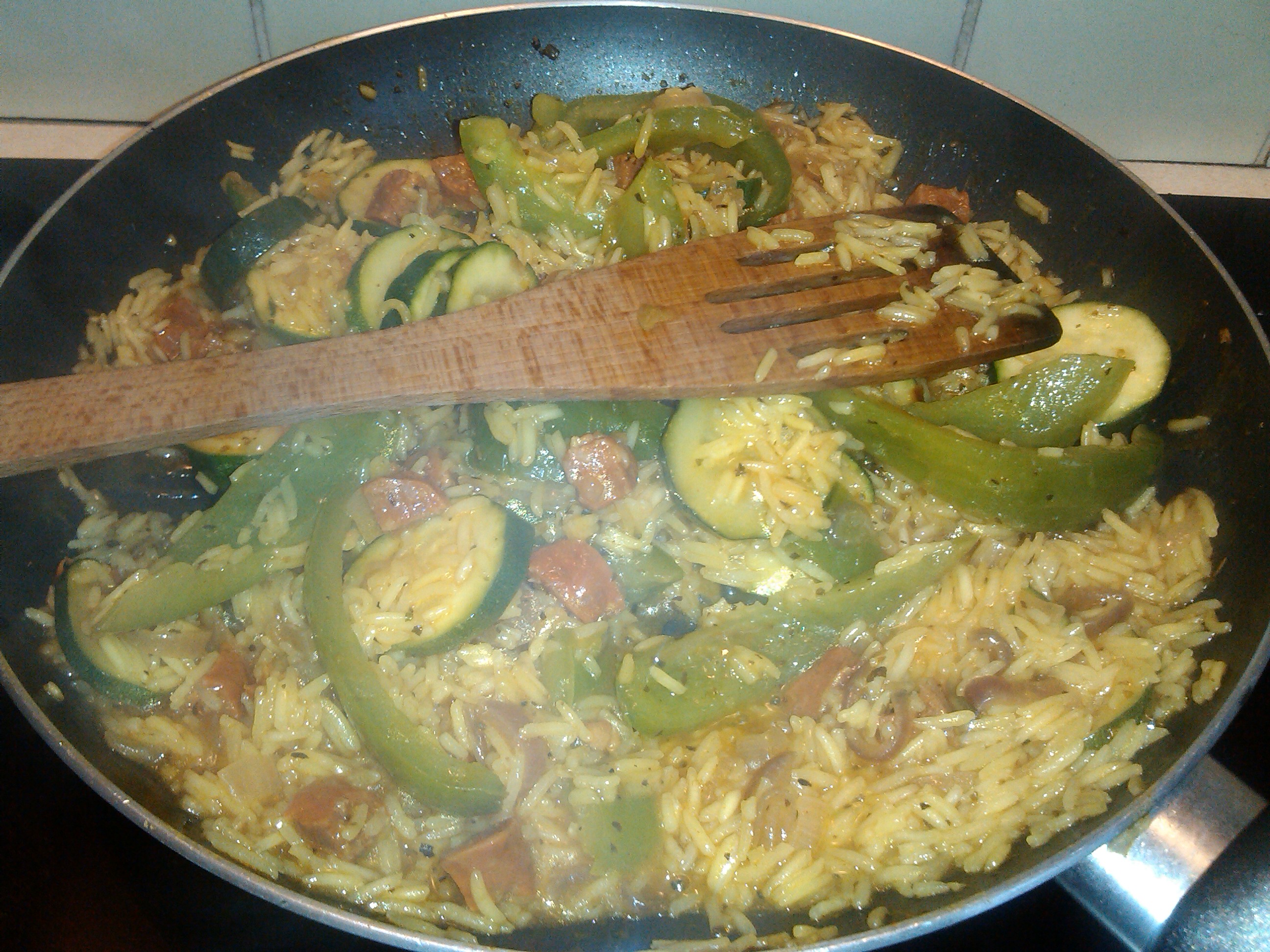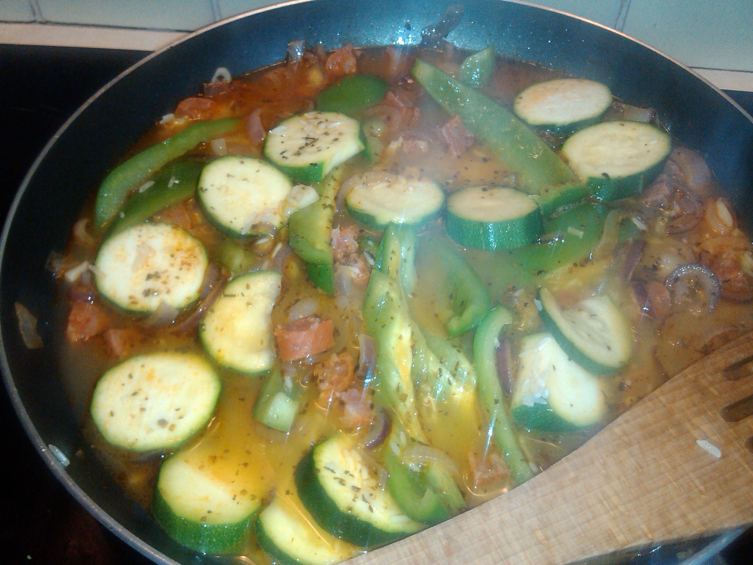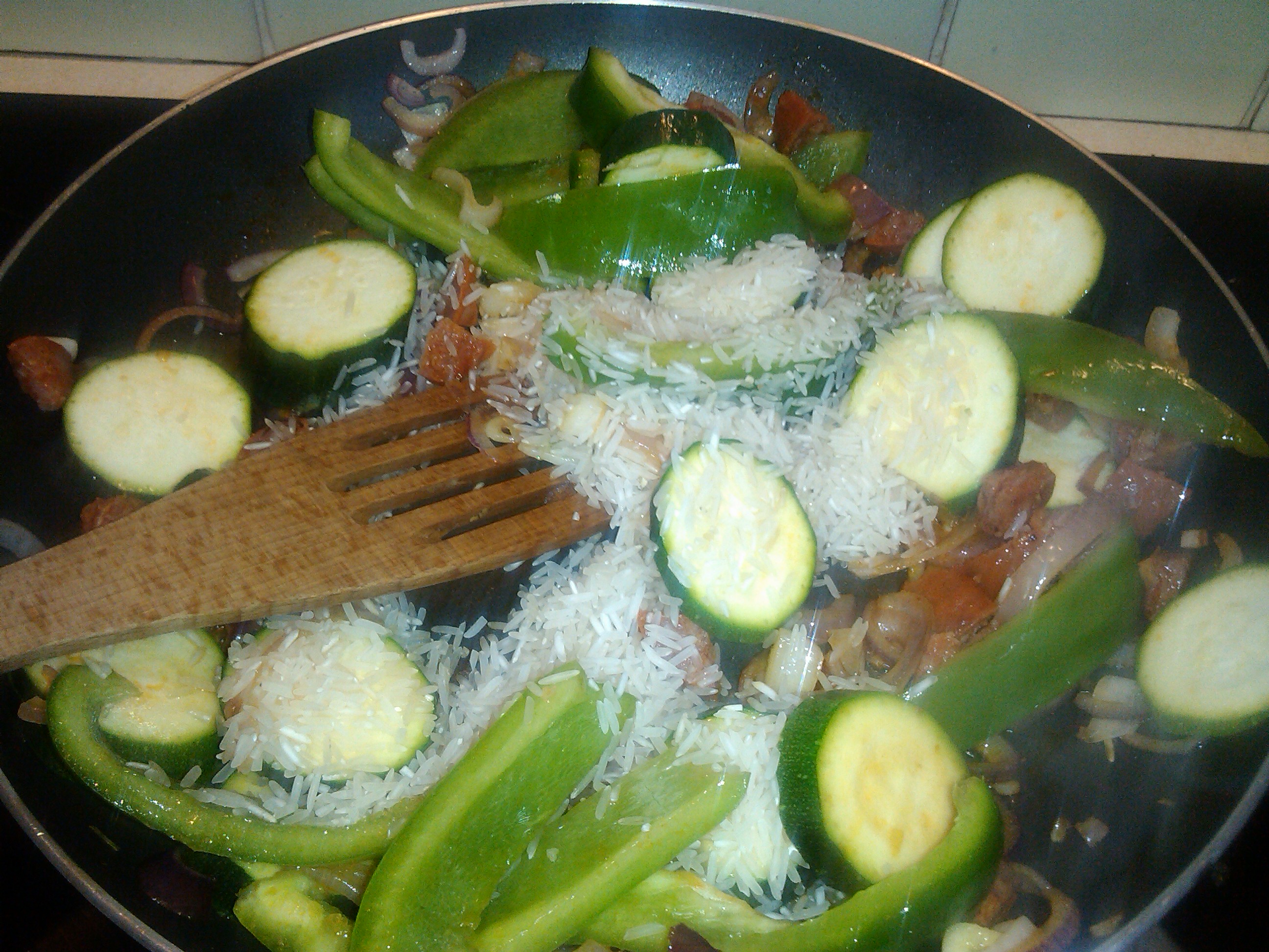 Add the courgette and green pepper and fry until the vegetables look slightly cooked. They should go orange because of the chorizo oil.