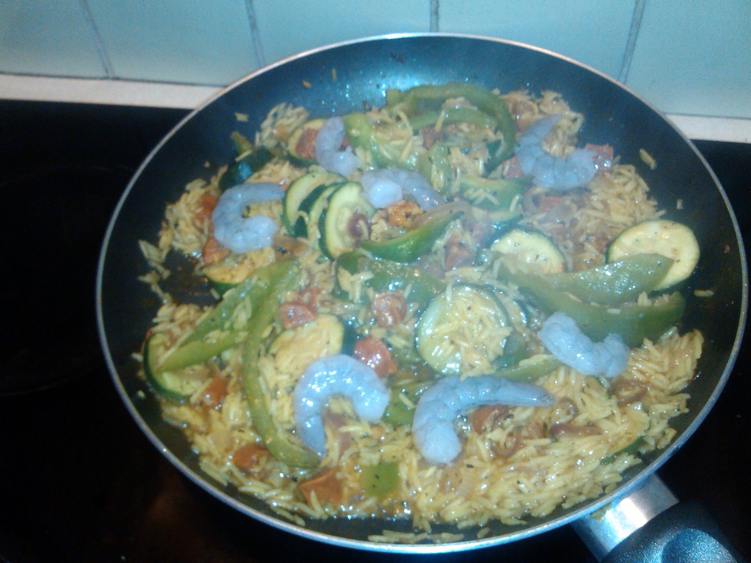 This recipe could also be made with chicken for people who dislike seafood, or white fish (if you hae a shellfish allergy like J’s mum). Just add the chicken at the start or add the fish just before the rice starts to look fully cooked.