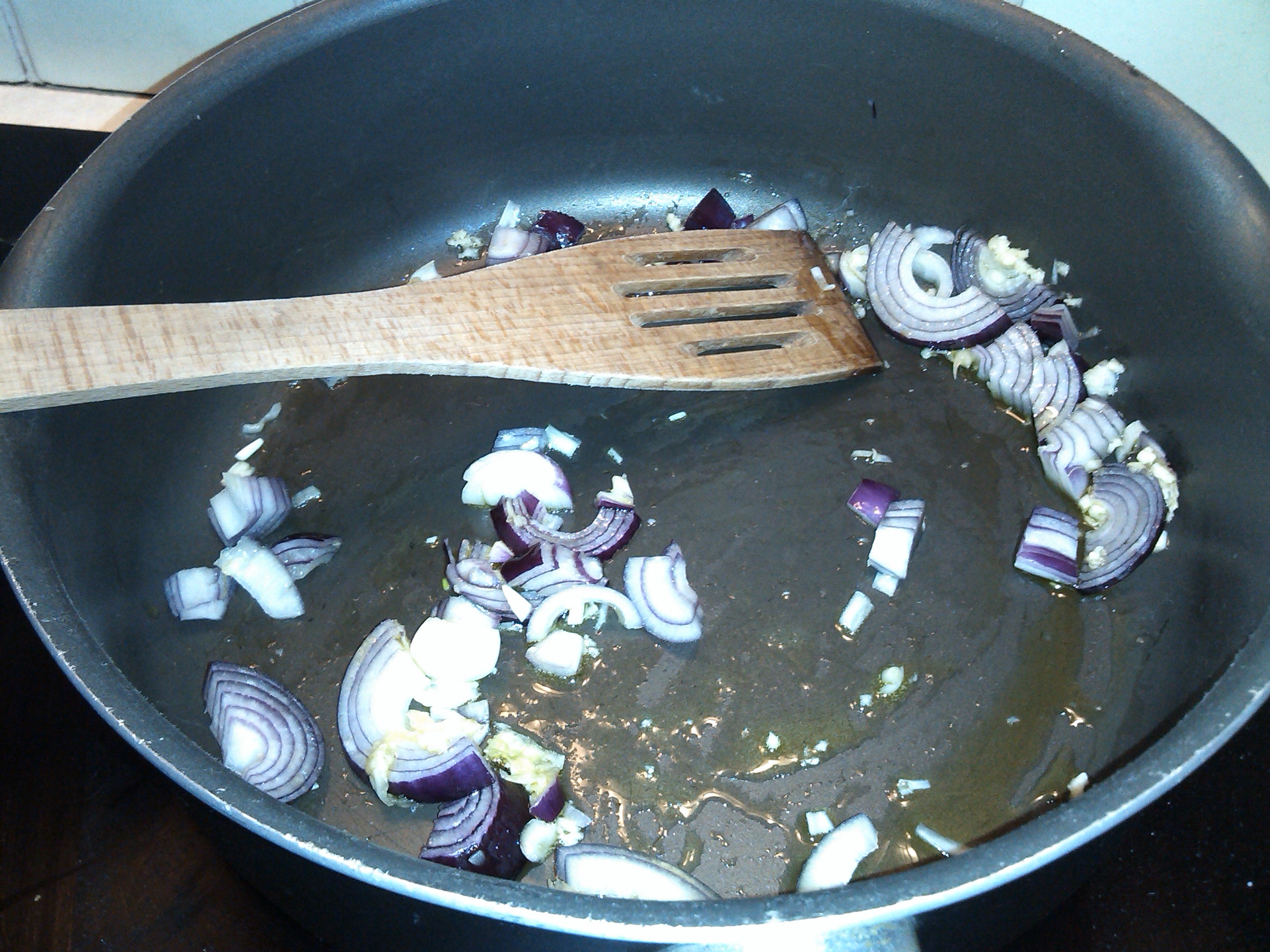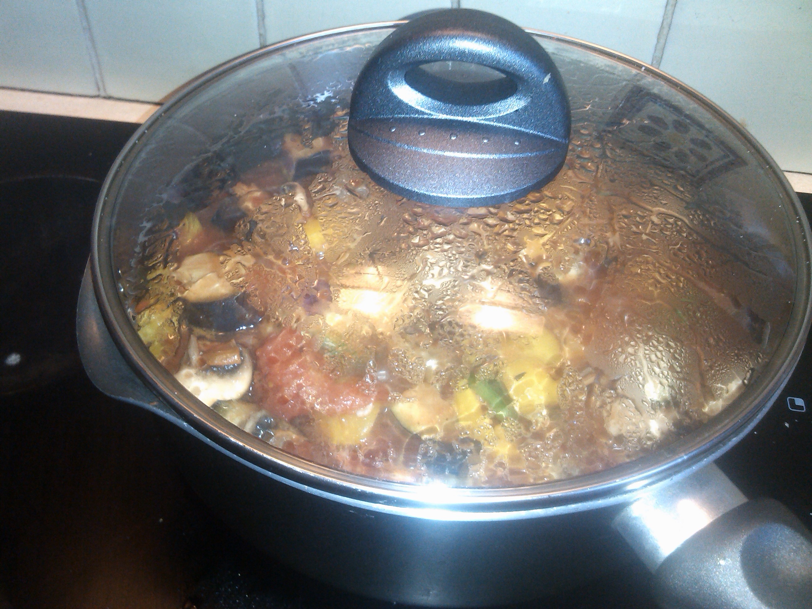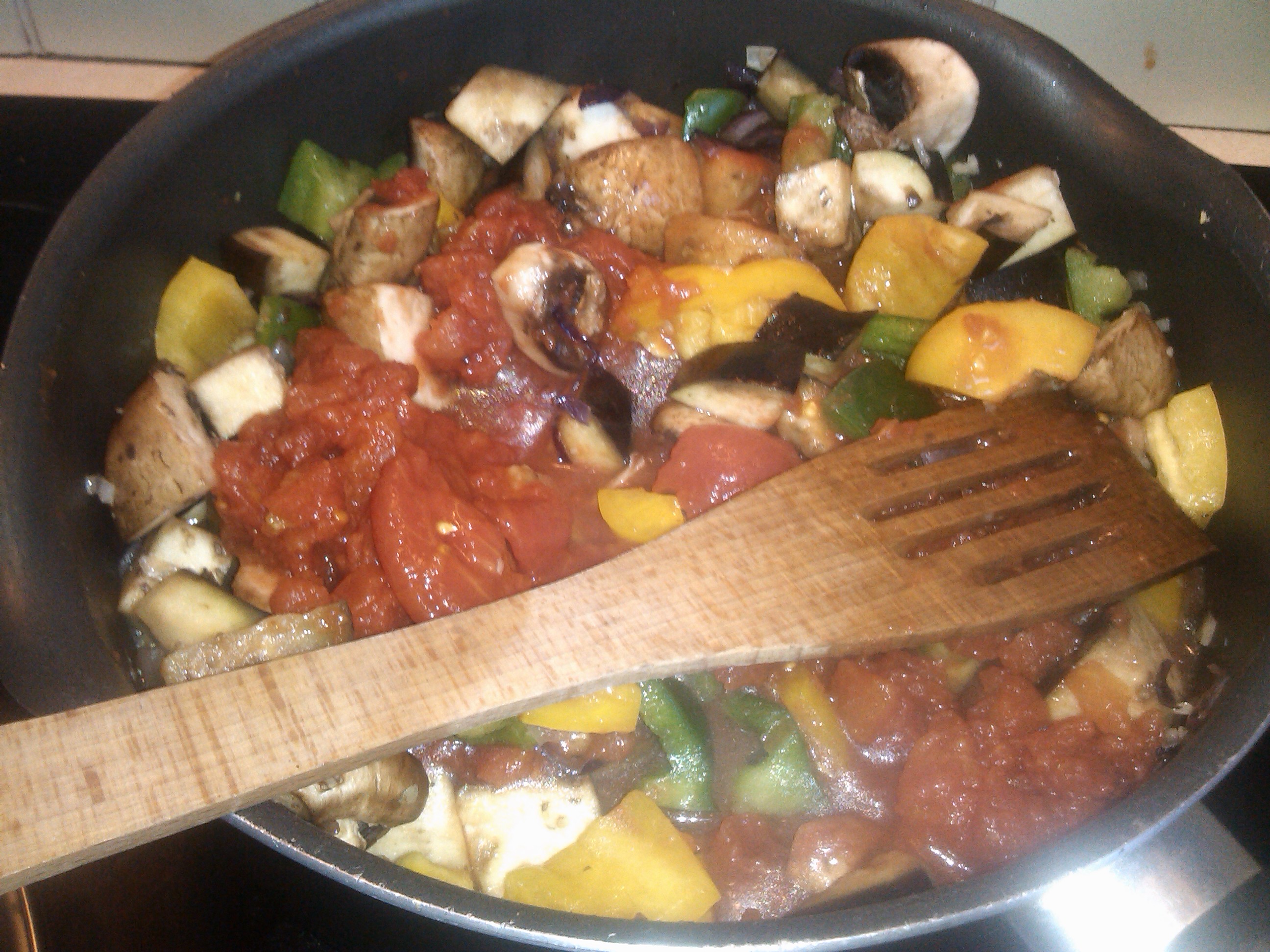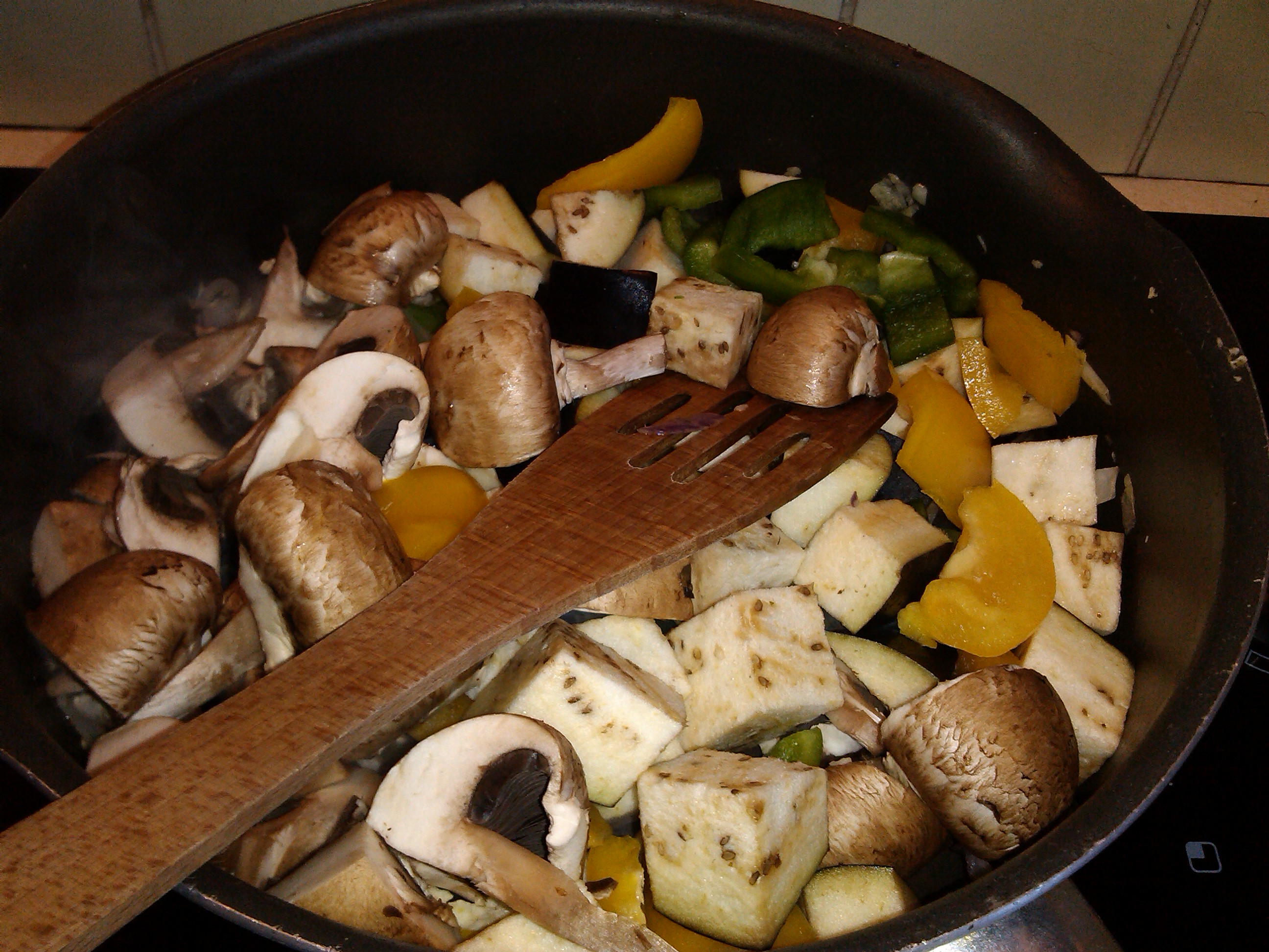Wash and quarter your mushrooms, dice the aubergine, slice and quarter the courgettes, remove the seeds and chop up the peppers. Put the vegetables to one side. Peel the onion/onions. Dice one half of the onion(s) and slice the other half. Crush the garlic. Heat the oil in a deep pan and fry the onion and garlic until soft.