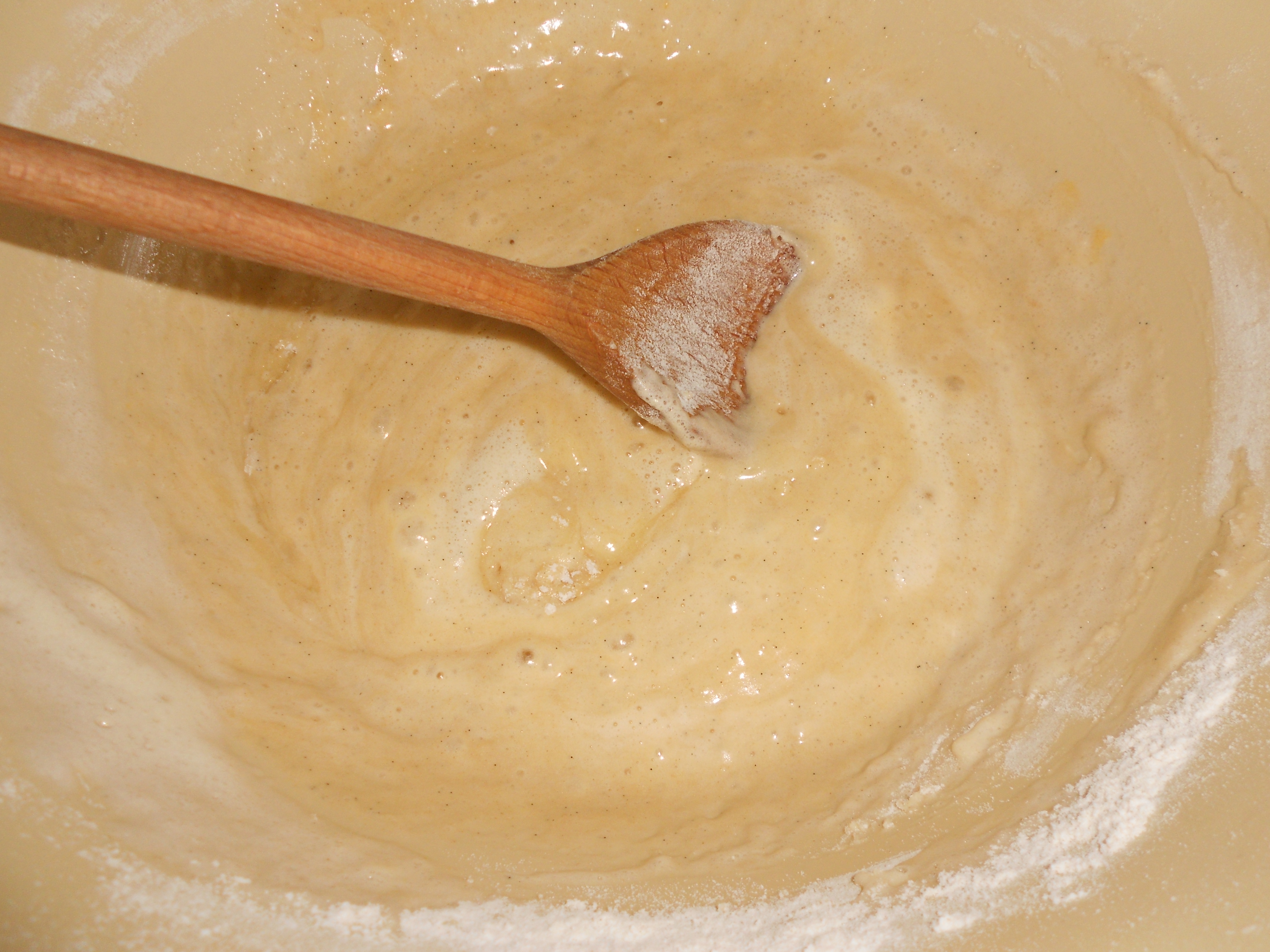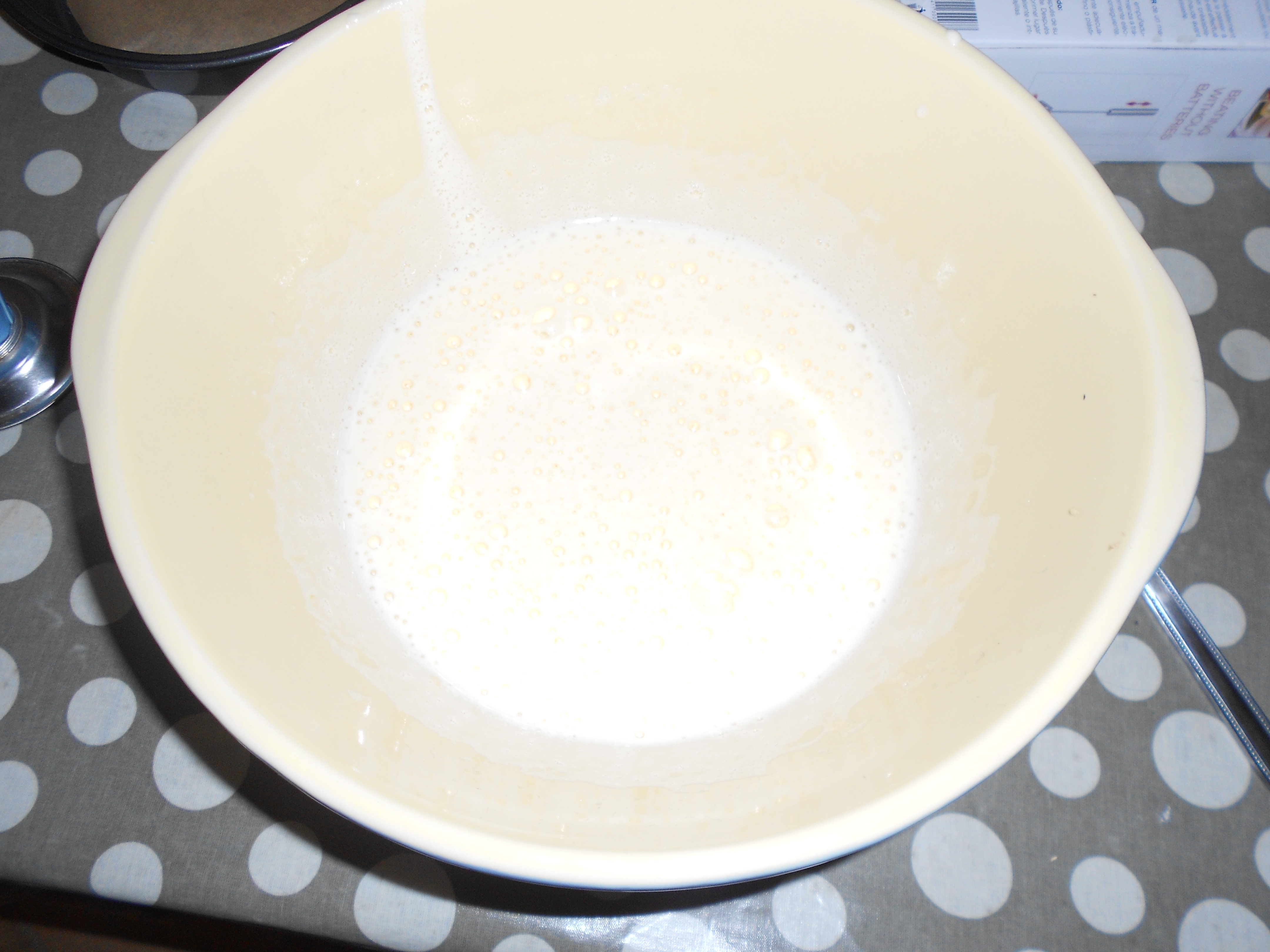 In a separate mixing bowl, whisk the eggs and sugar together until pale and thick enough to leave a trail on the surface of the sugar egg mix.