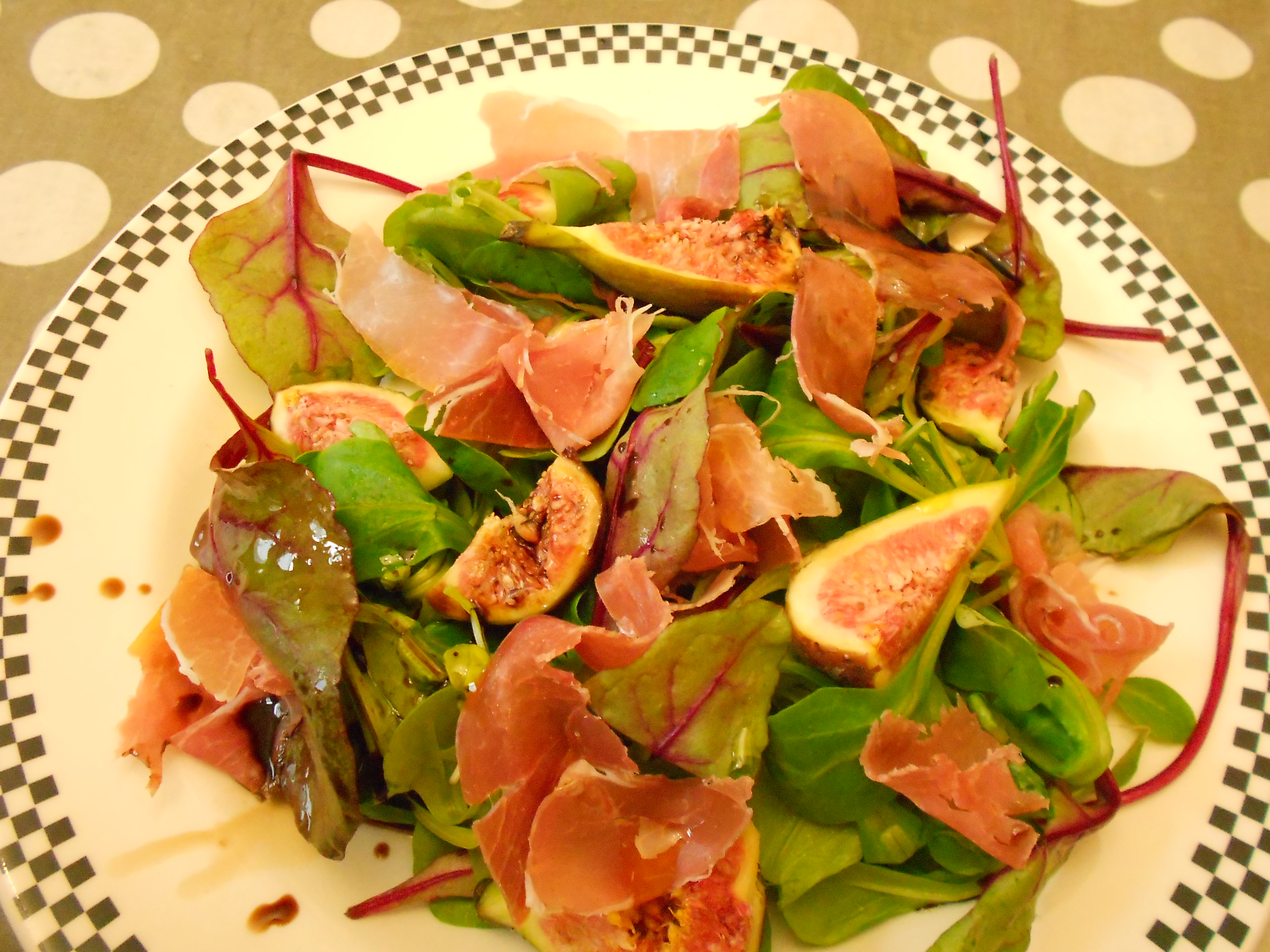 Arrange your salad leaves onto a plate. Quarter the figs and arrange on the plate. Tear up the ham and arrange on top of the figs and leaves. Add a splash of oil and balsamic vinegar and serve.