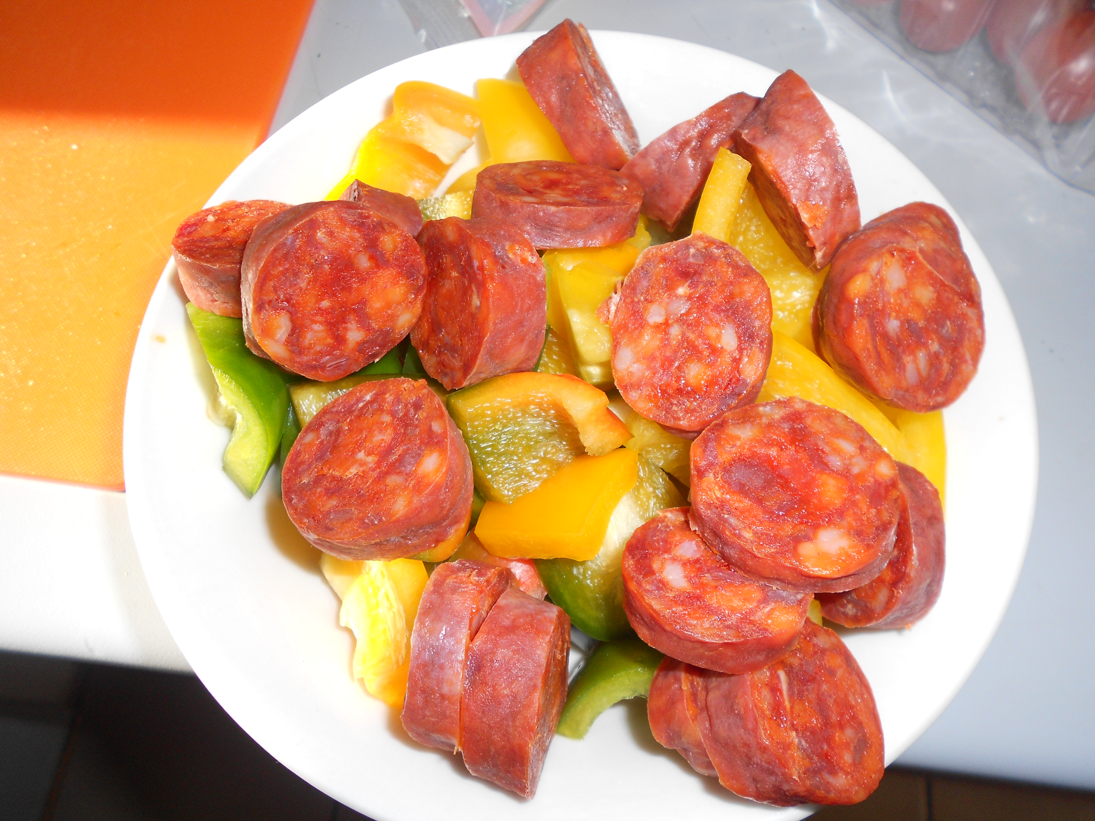 While the prawns were marinating slice your chorizo and cut the peppers up into bite sized pieces.
