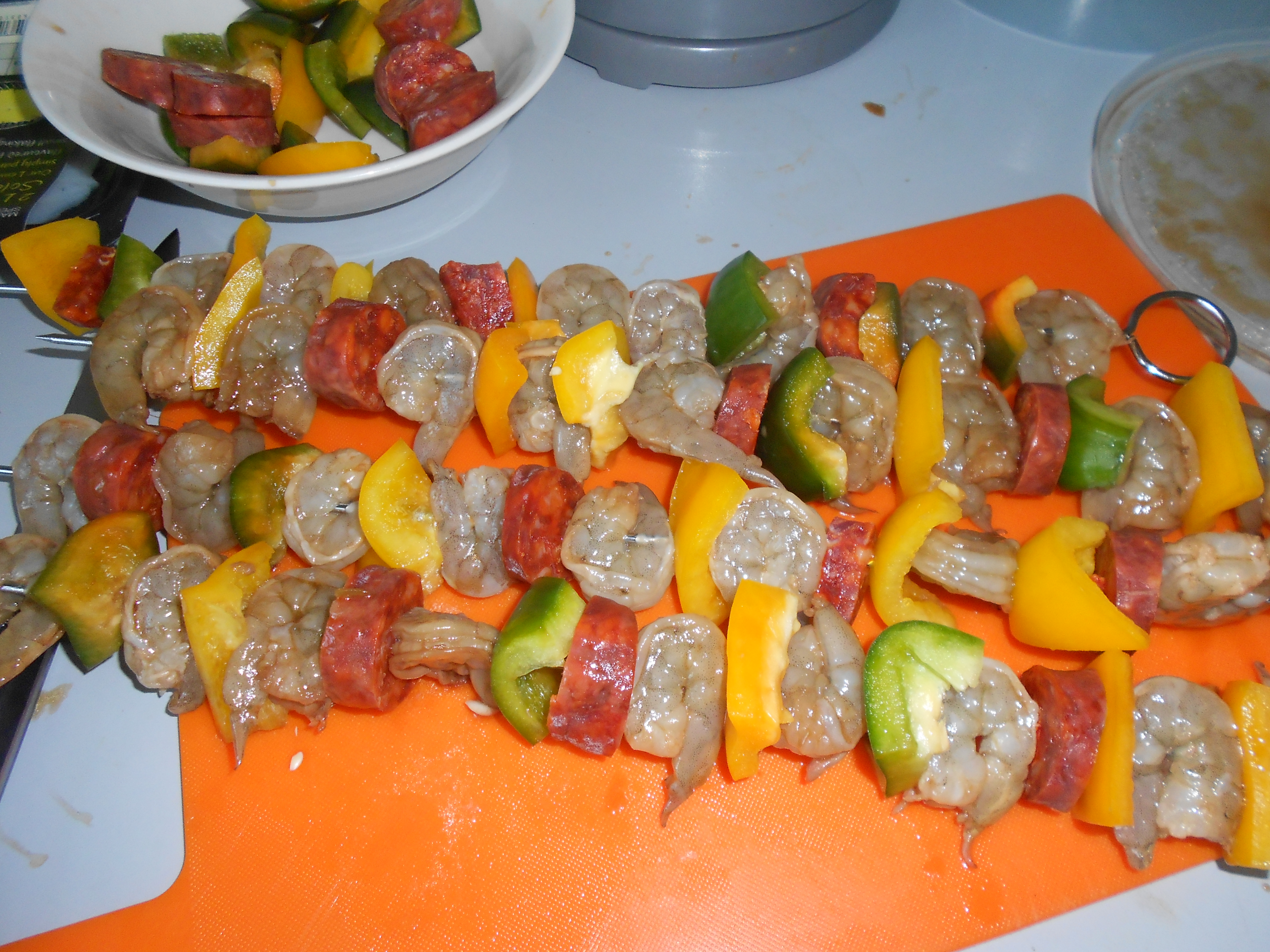 Thread the prawns, chorizo and peppers onto the skewers. We used 4 long metal skewers but you could use bamboo skewers and make more (just remember to soak the bamboo skewers in water so they don’t burn during cooking)