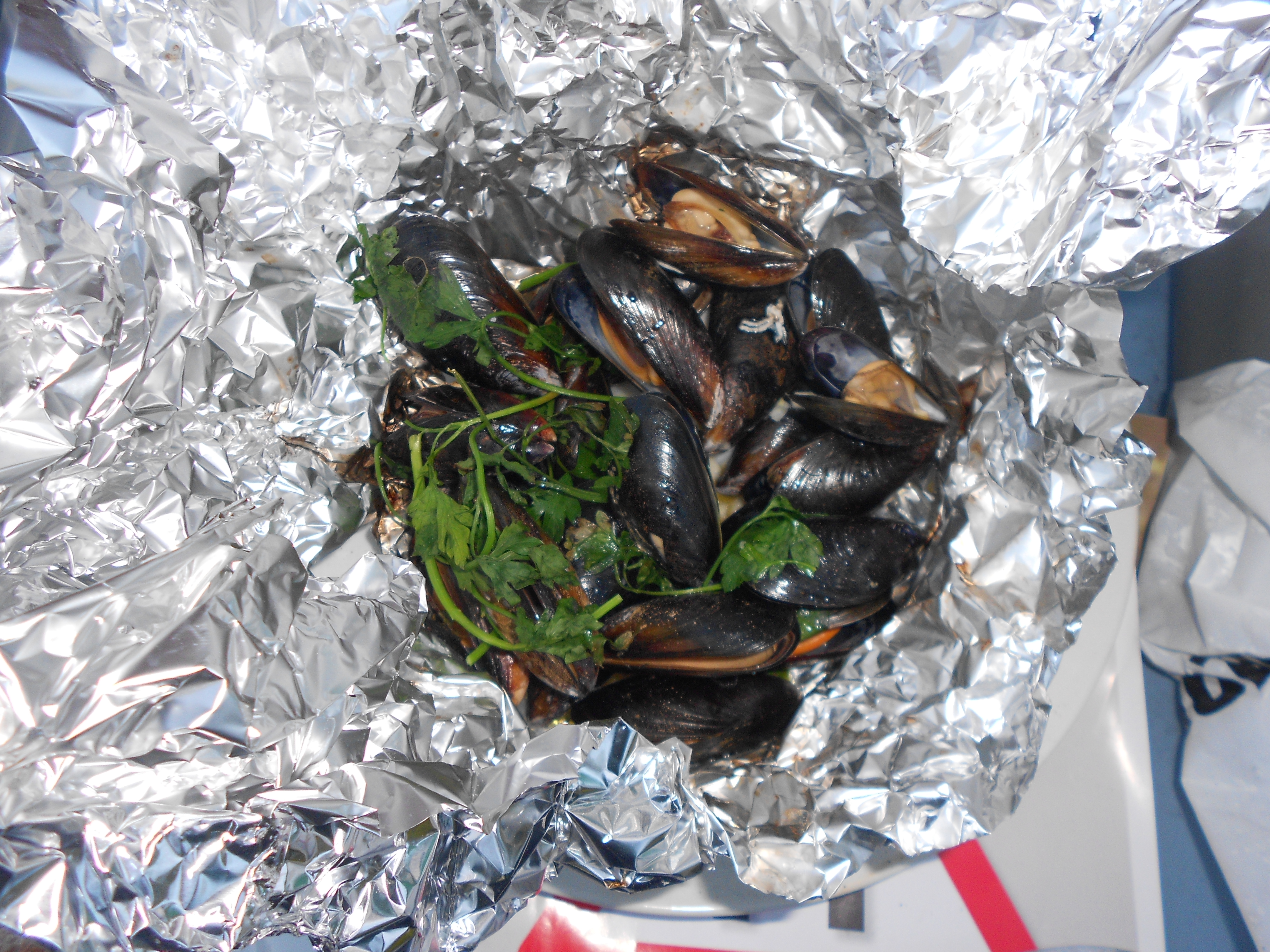 Top each mussel parcel with the parsley and the garlic butter. Wrap the foil parcels up but not too tight.