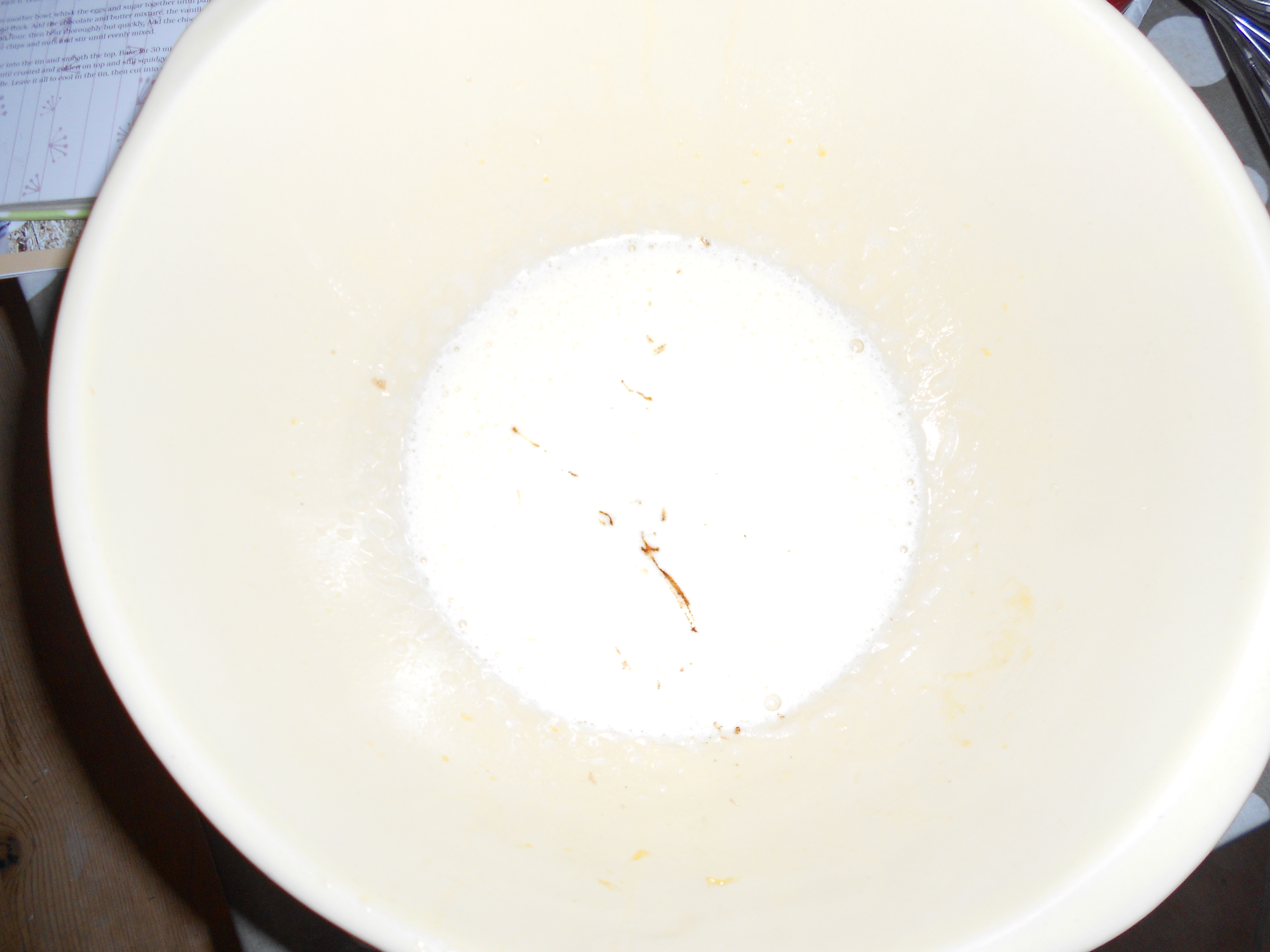 Whisk the eggs and the sugar together until they have a pale yellow consistency and the mixture is very fluffy.