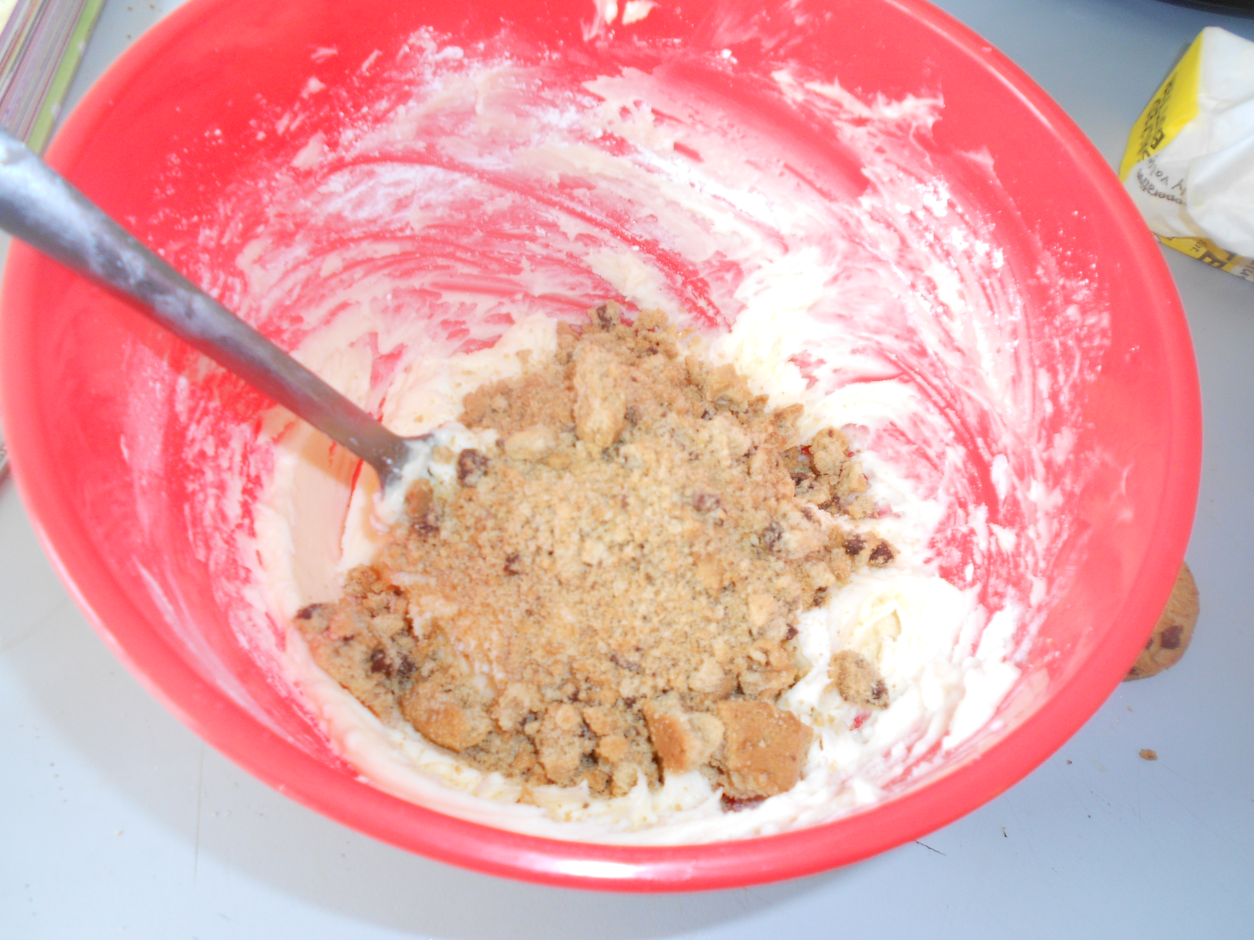 Once the buttercream is smooth, crush your cookies (take any frustrations you have out on them). Add the cookies to the buttercream. Loosen the mixture by adding the cream.