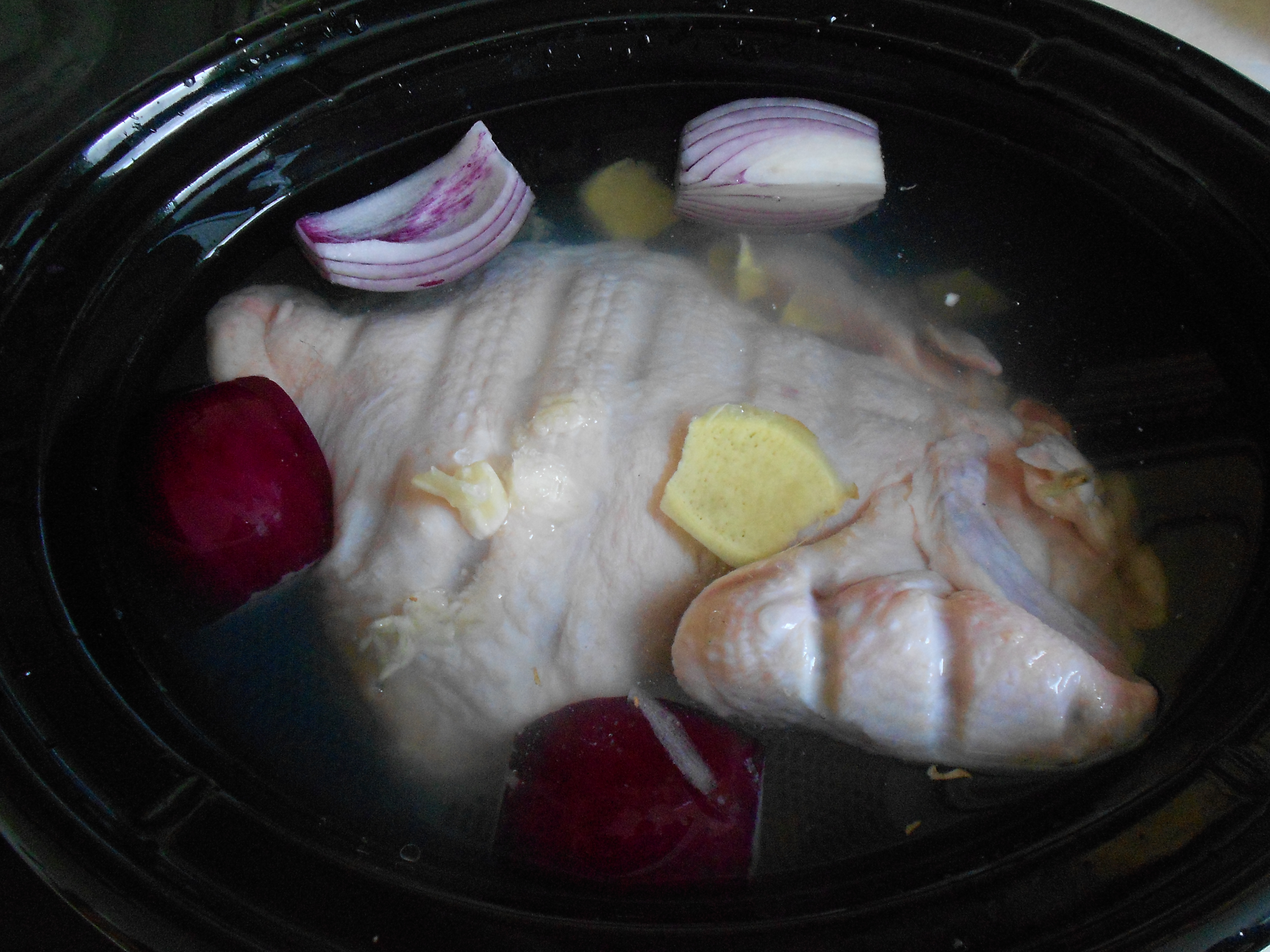 Peel and quarter your onion and peel and slice the ginger. Crush the garlic. Put the chicken upside down in the slow cooker and add the onions, ginger and garlic. Season with the salt and pepper. Pour over enough cold water to cover the chicken. Cover and cook on a low heat for 6-8 hours.