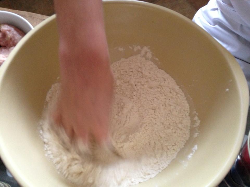This week, in line with the Great British Bake Off we made different types of pastries. The main (and by far most delicious) thing we made was a big savoury short crust pie. This pie is a wonderful thing to bake as the weather gets colder and wetter and you want something warm and filling for your evening meal. The pastry can be made in advance, or you could use ready made pastry – I think there is something nice about making your own though. This pie isn’t exactly quick to make, so you might want to make it when you have a few hours free. The sensational flavour and texture of the pie makes it well worth waiting for though (and your kitchen will smell wonderful).