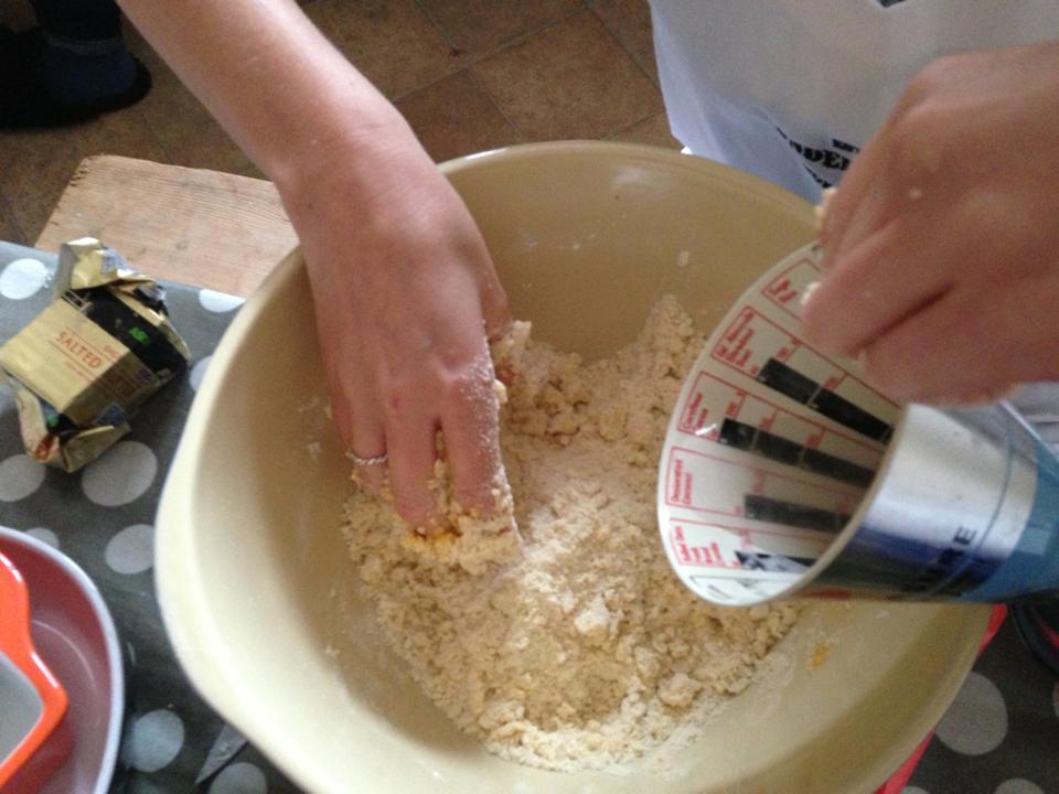 Put the flour, butter and salt into a large mixing bowl and rub together to form breadcrumbs.