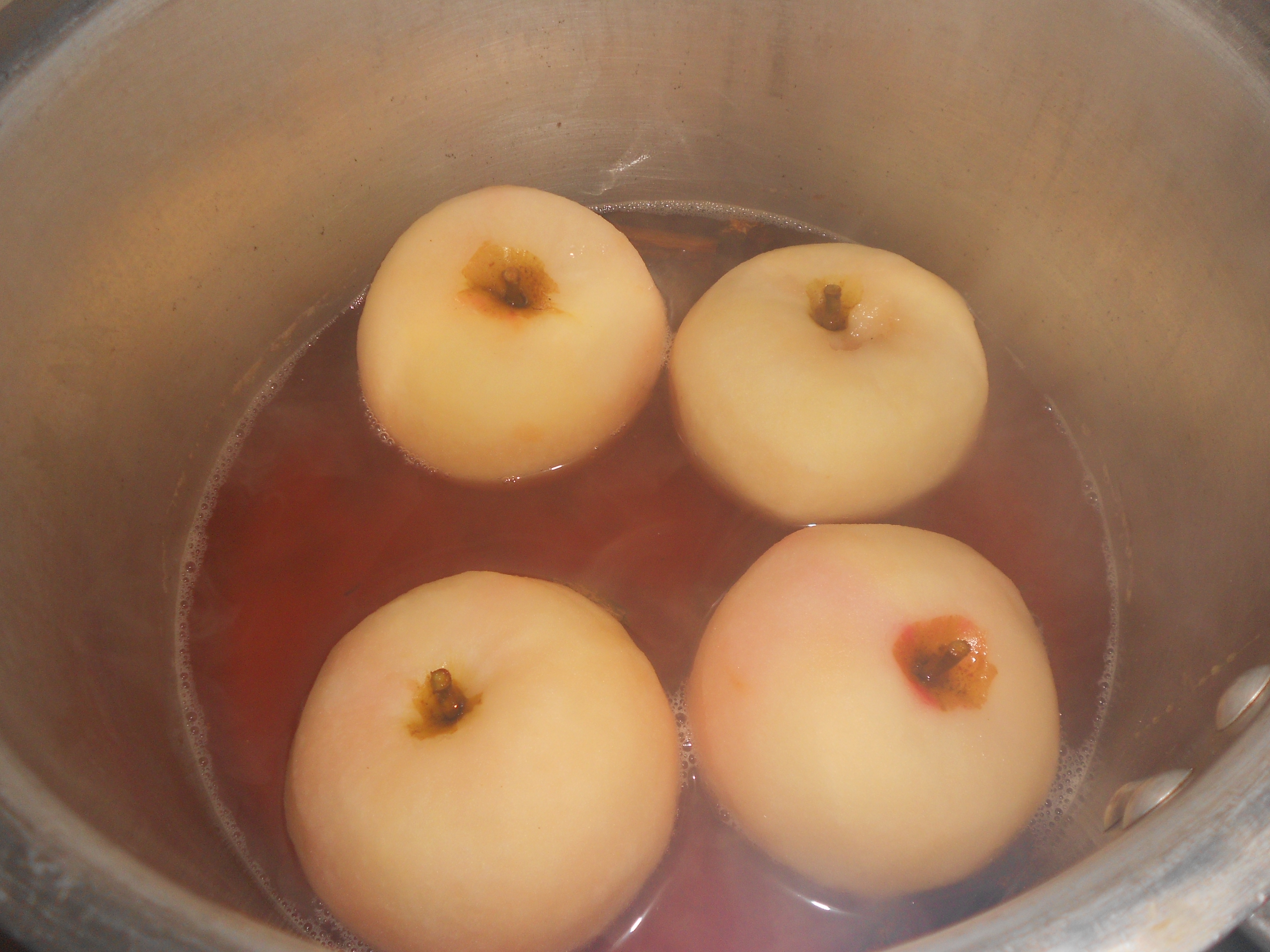 Place the apples into a saucepan with the cider. While you’re peeling the apples cover each one with a little fruit juice to prevent them from browning. Add the cinnamon and honey to the cider. Simmer the apples on a low heat and prevent the cider from boiling by turning the heat down if necessary. Turn the apples while they’re cooking to make sure they cook evenly.