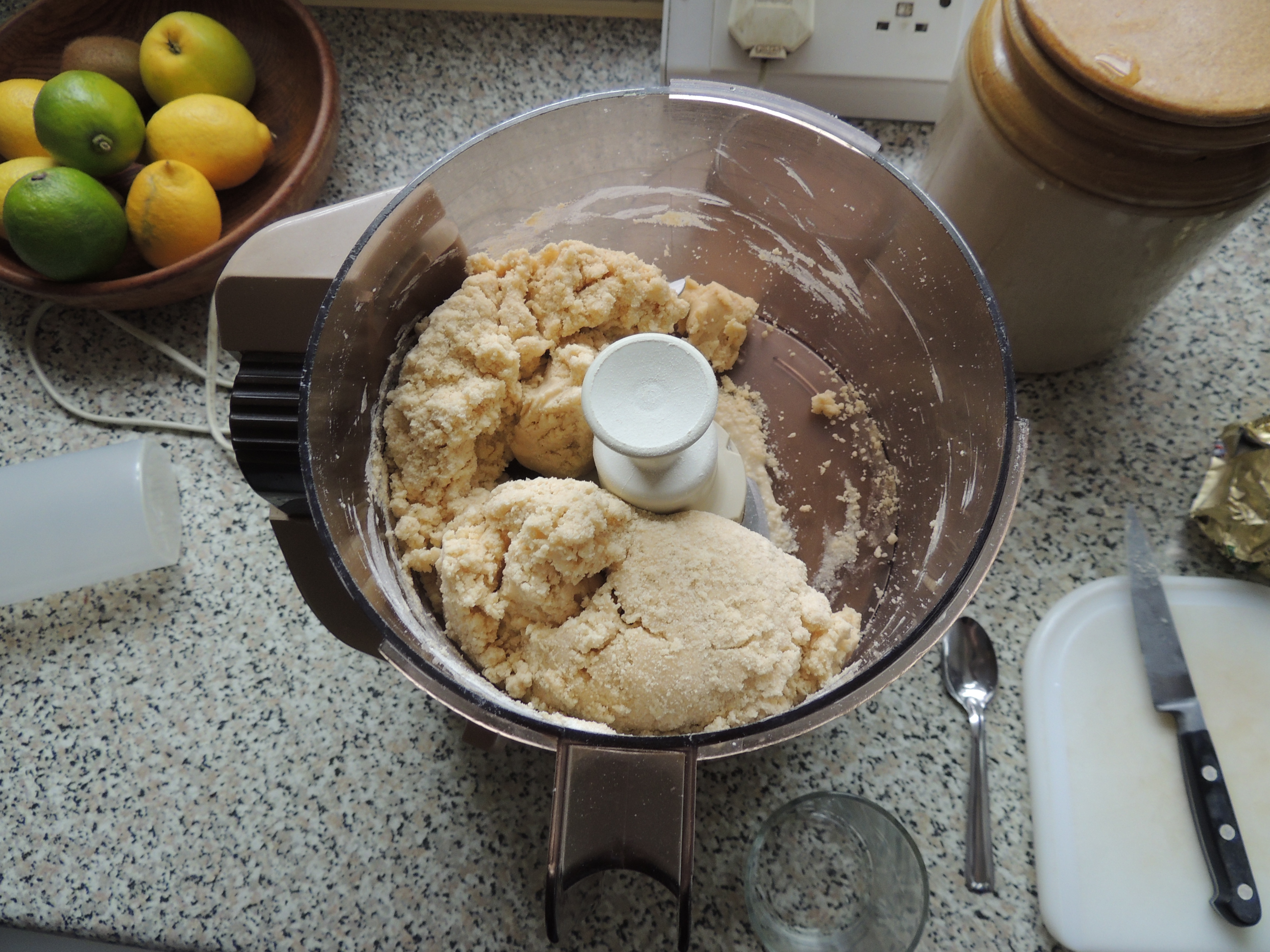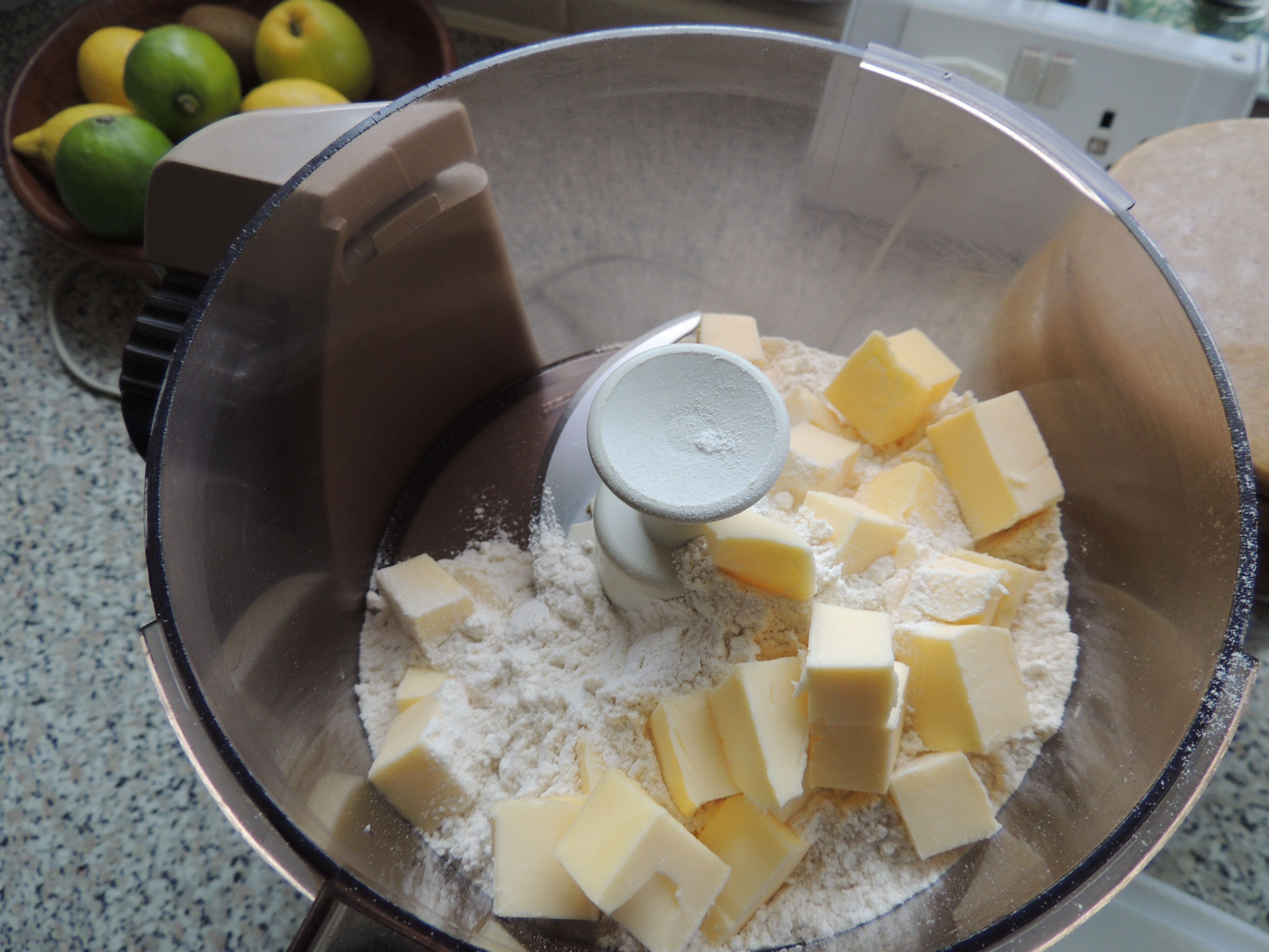 Put your flour, butter and eggs into your food processor (with the knife blade attachment) and mix until breadcrumbs are formed.
