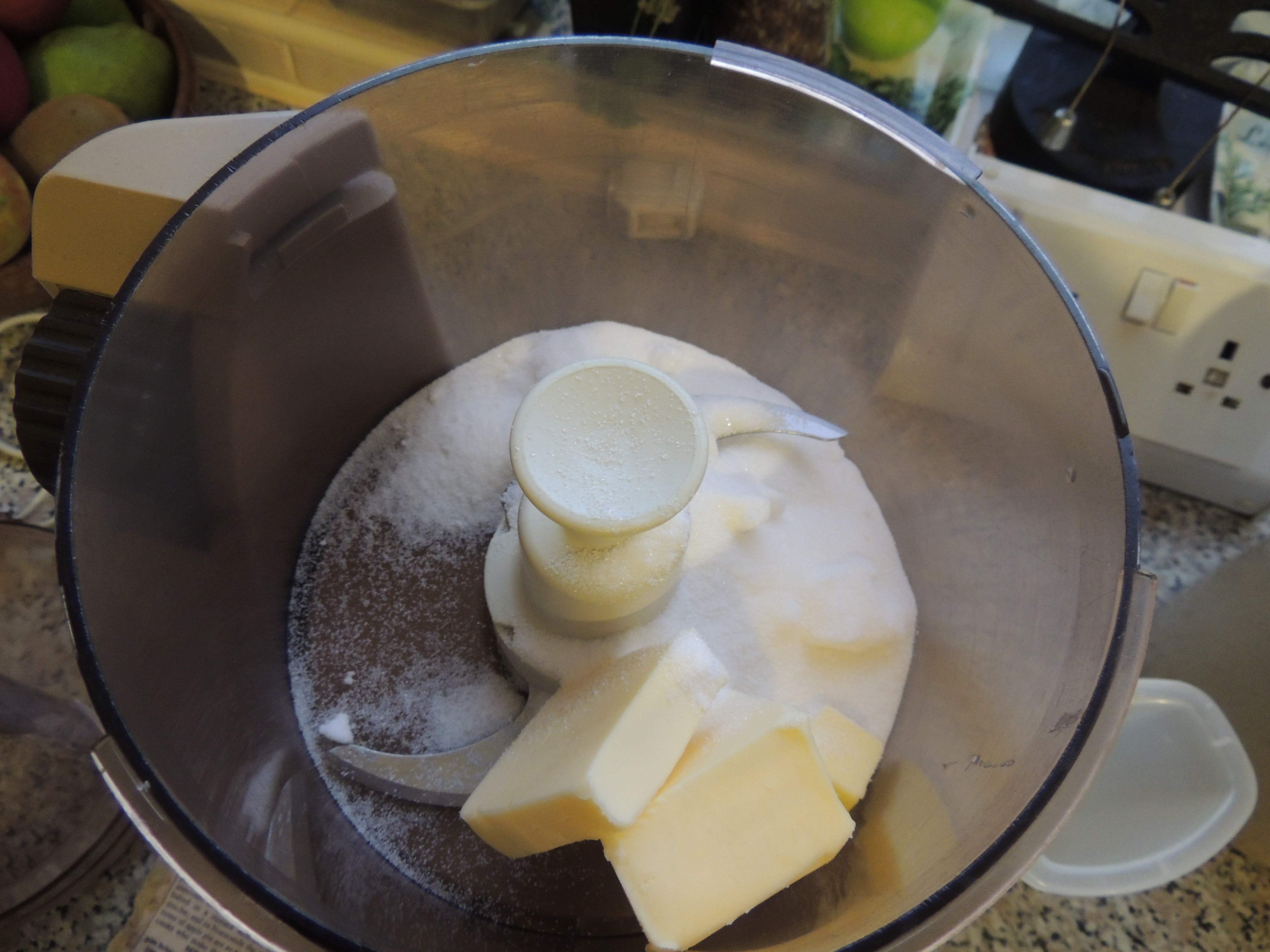 Preheat your oven to 200°C. To make your coconut frangipane put the butter and caster sugar in your clean food processor (apparently washing up as you go along while baking is a thing!). Mix until it looks pale and fluffy.