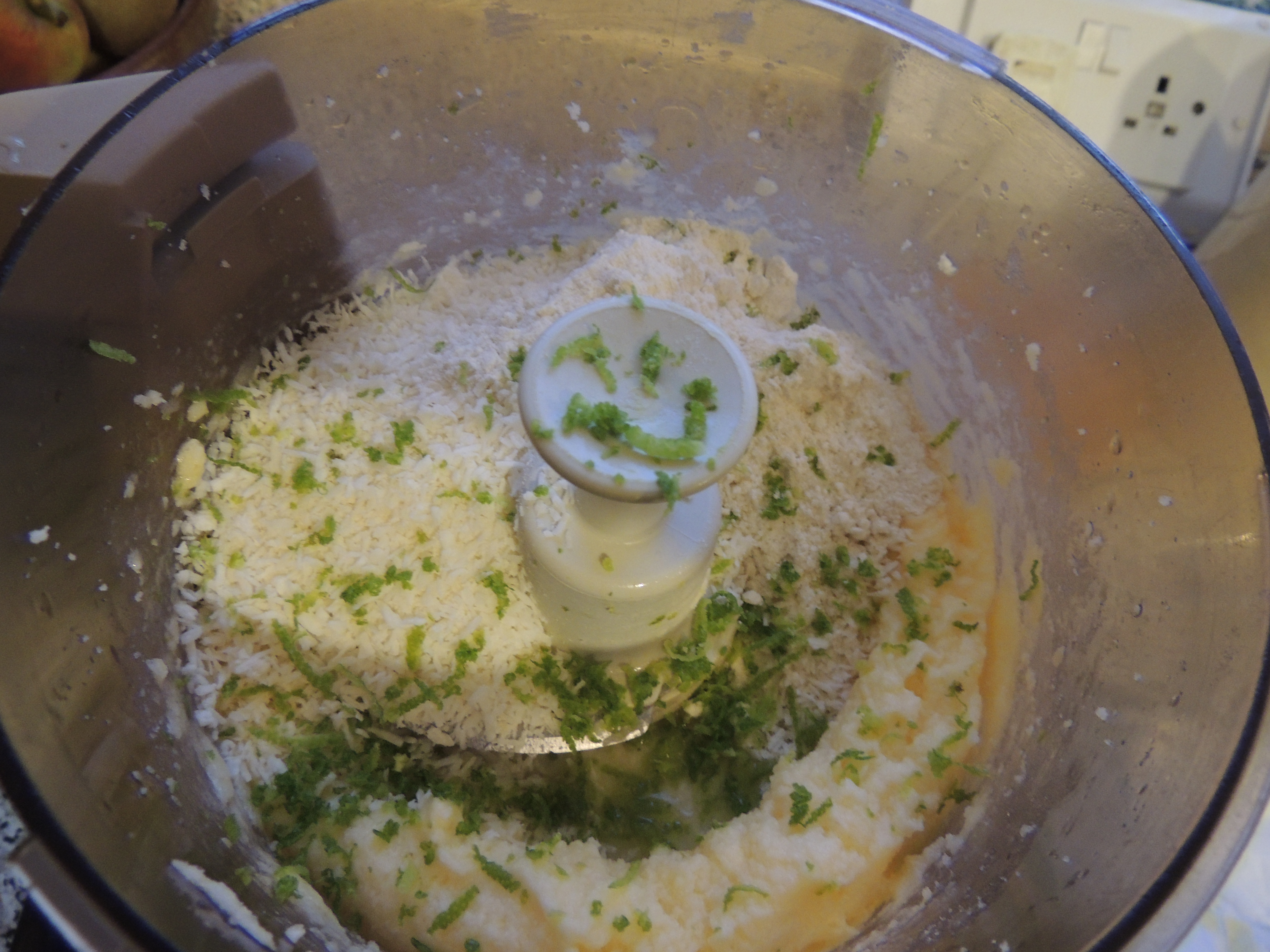 Add your egg and egg yolk to the mix. Then add your coconut and the lime zest and juice.