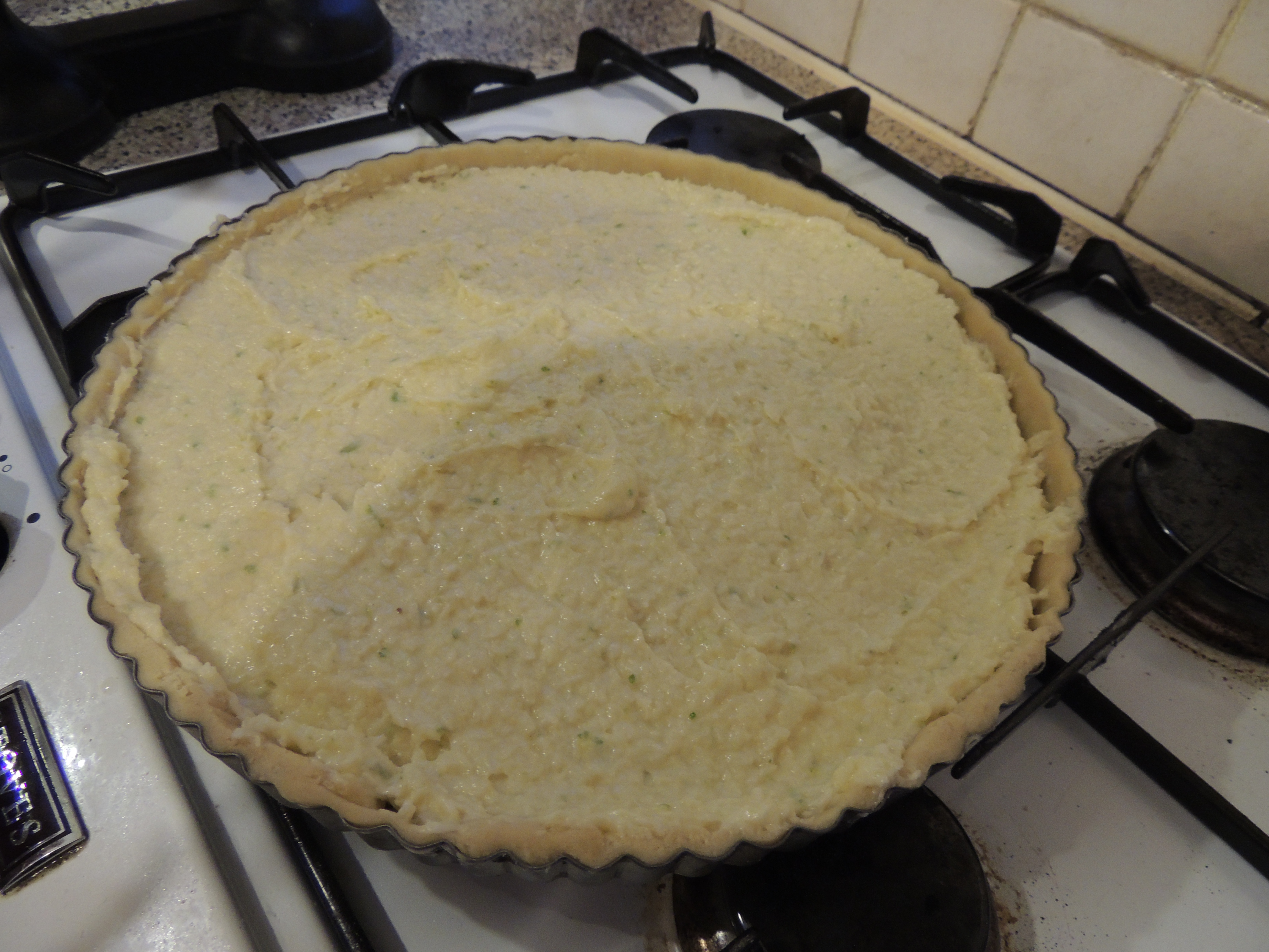 Roll out the pastry (you shouldn’t use flour for this step, the pastry is so cold it won’t stick much). It should take quite a lot of effort to roll the dough out as it is cold. If your pastry starts to stick to your board but it in the fridge to chill for a few minutes. Line your tart tin with the pastry and use a sharp knife to trip off any excess from the sides. If you have any bare patches in the tin press in some of your excess pastry and trim it. To prevent the pastry from rising when cracking use a fork to prick the base of the tart several times. Keep the remainder of the pastry back for your apple tarts.