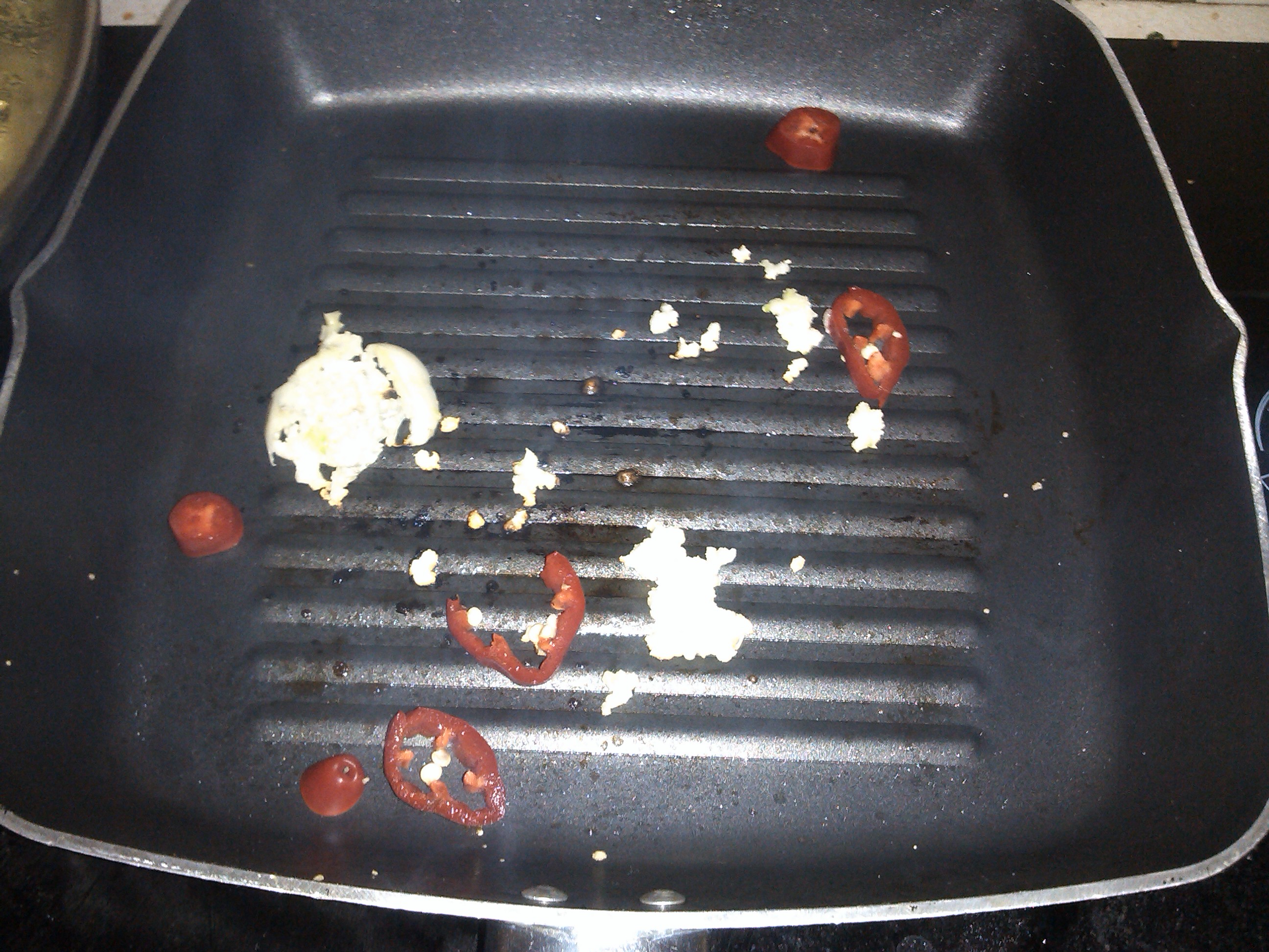 Put your griddle pan on a high heat. Spritz with your oil or fry light. Crush over your garlic clove and slice over the chilli and heat until both are fragrant.