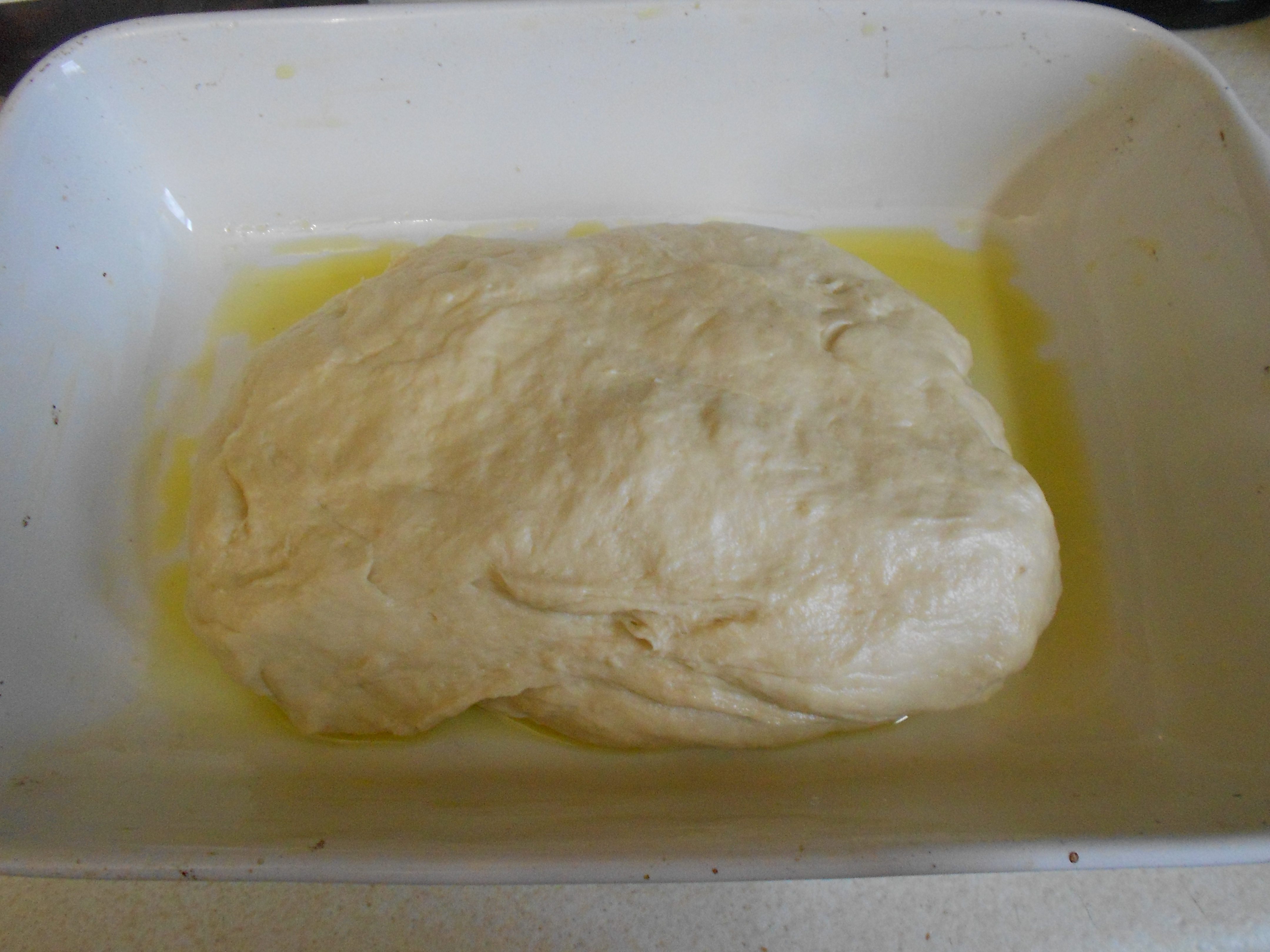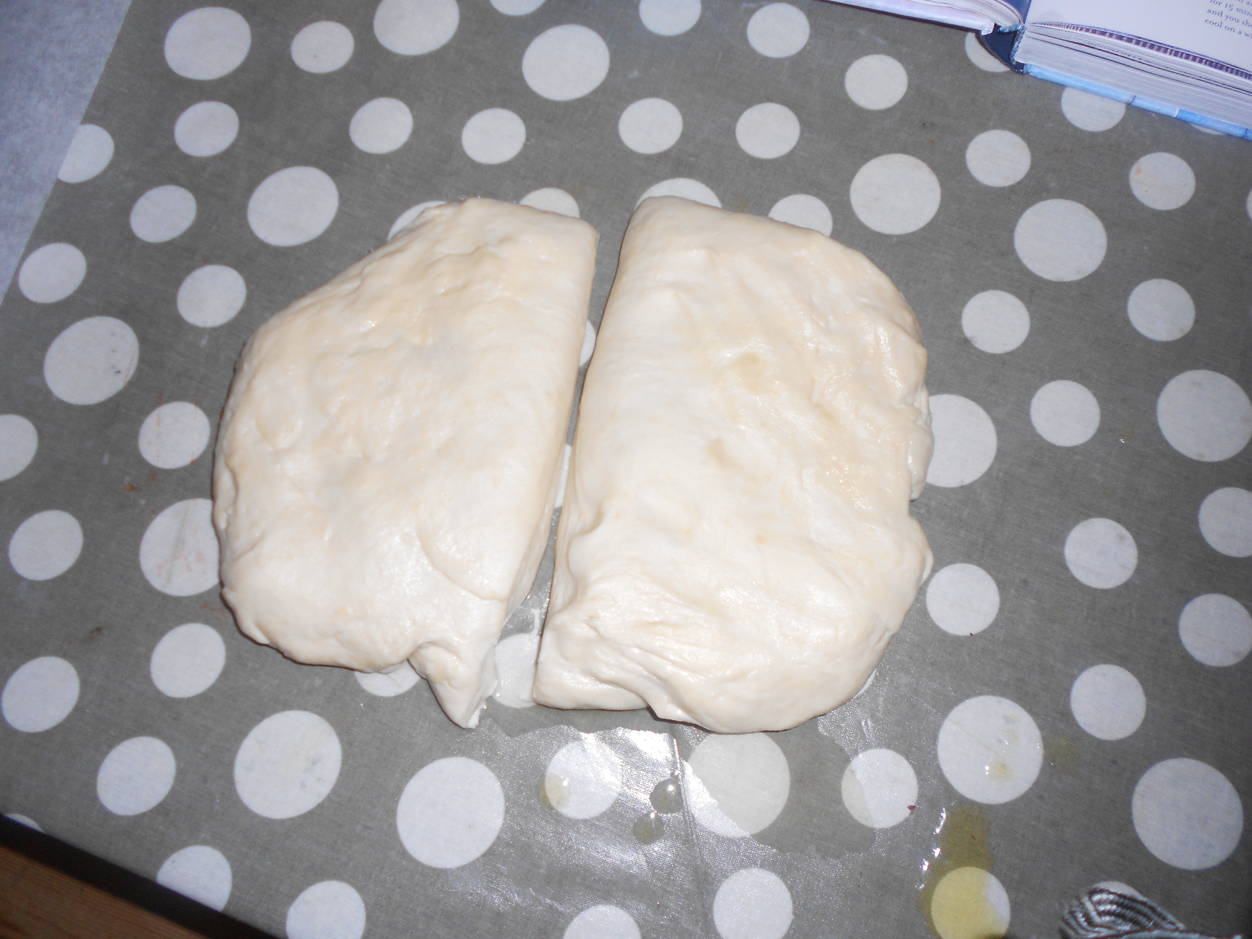Cover an appropriate surface with olive oil. At this point knead your dough until it is smooth and elastic. Don’t add more flour as this dough is supposed to be sticky (I ruined a washing up sponge clearing up after myself).