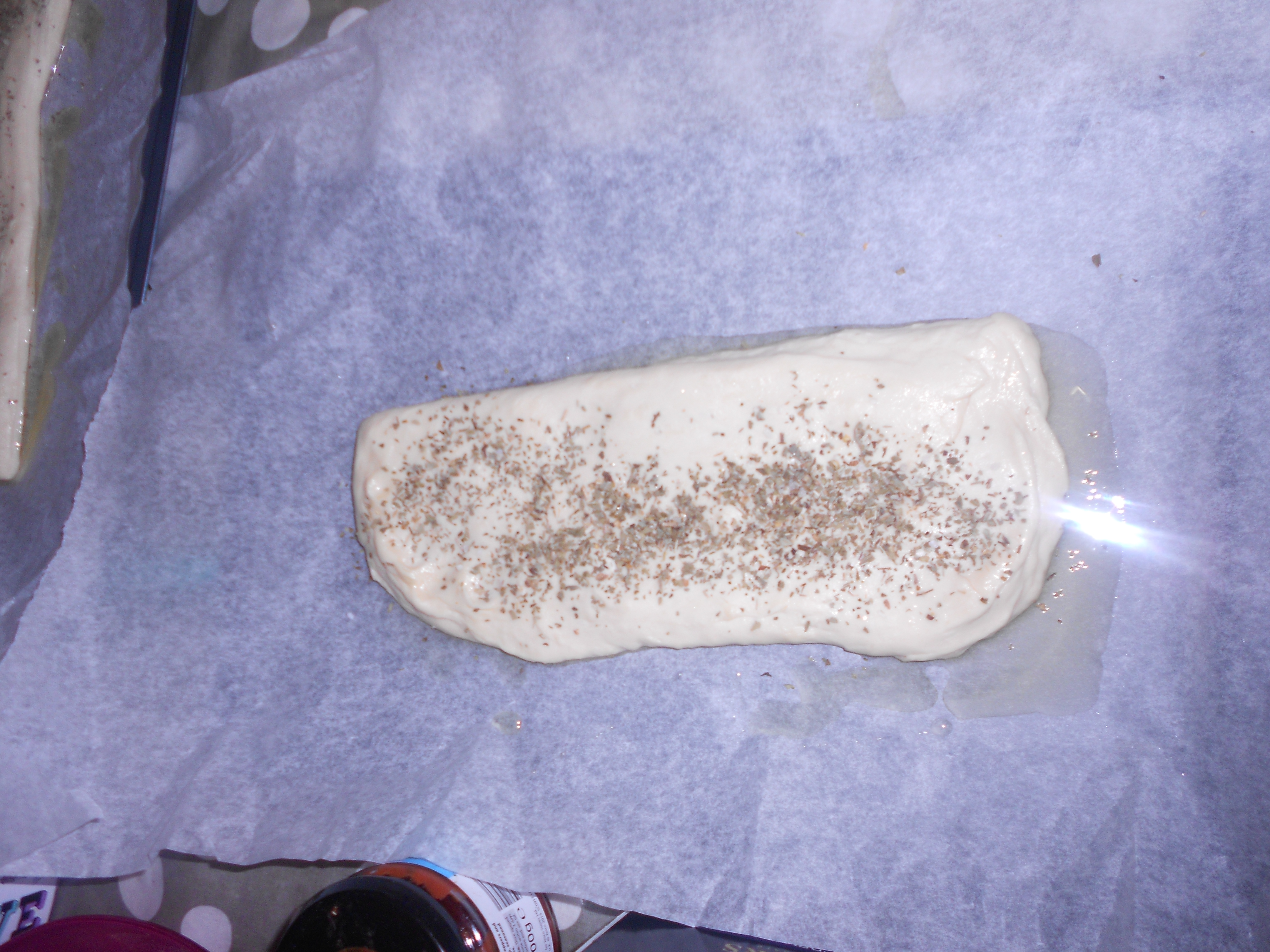 Line 2 baking trays with baking paper and drizzle with more oil. Divide your dough into 2 and shape into flat even rectangles. Do this carefully so that you don’t lose too much air. The texture of the bread is way more important than having perfect rectangles at this stage.Sprinkle your dough liberally with the salt flakes and dried oregano. Leave your trays in a warm (not hot) place to rise for another hour, until the dough springs back when poked with your finger. About 30 minutes into your proving time preheat your oven to 220°C.