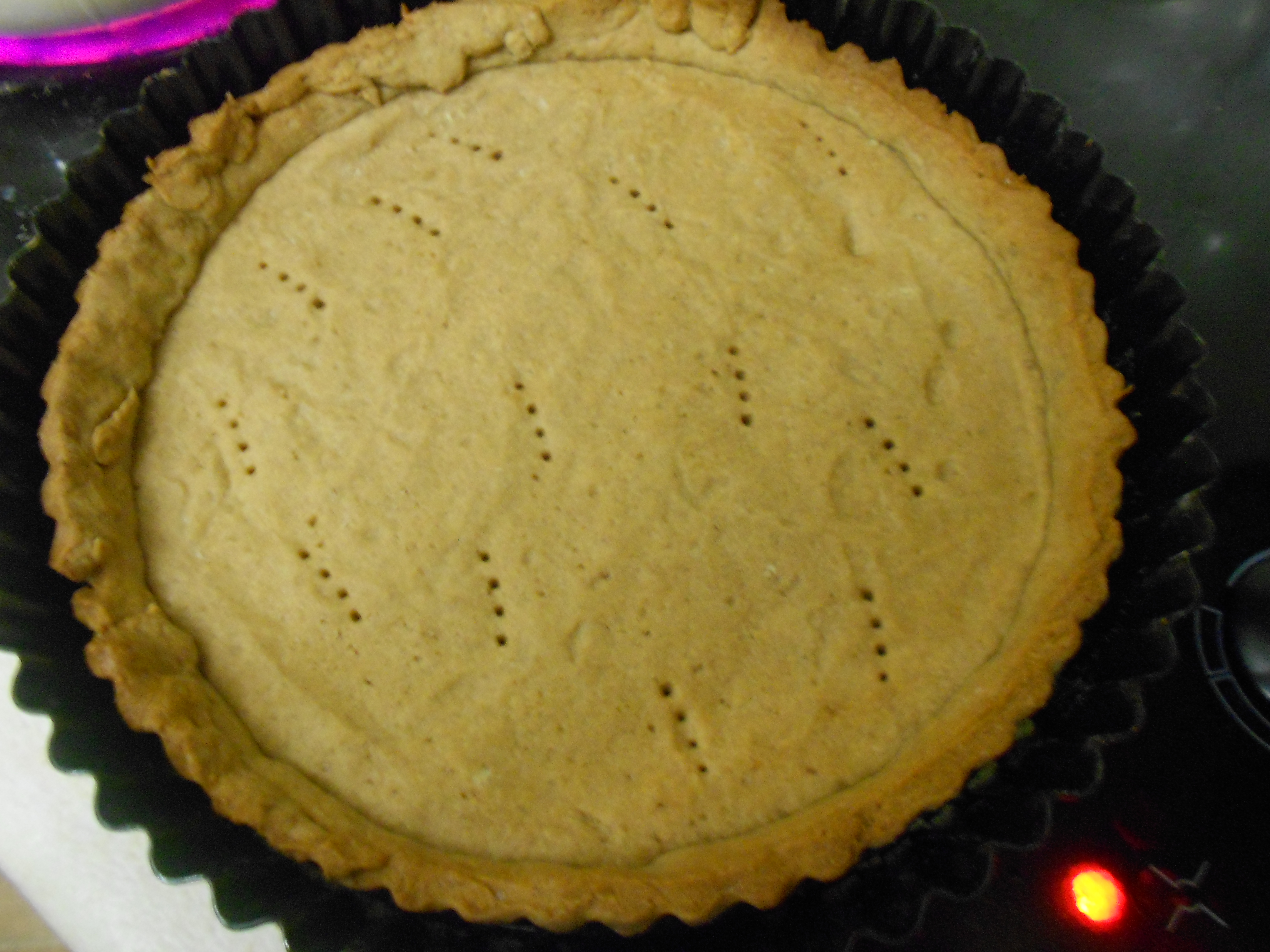Line your tin with greaseproof paper and baking beans and bake blind for 20 minutes. Remove the beans and bake for another 6 minutes.
