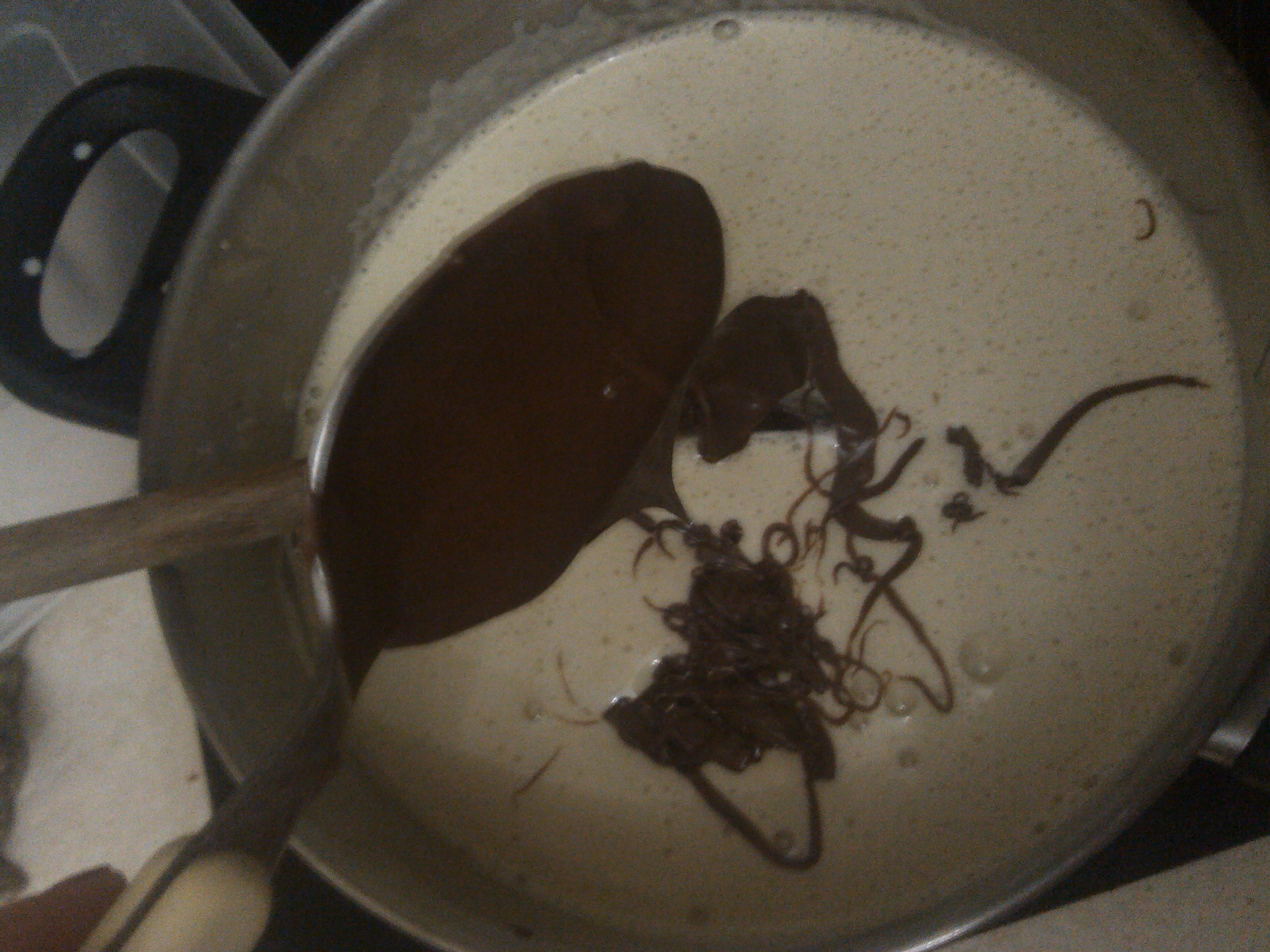 Pour your mixture back into the saucepan and heat on the lowest possible setting for 10-15 minutes. You want the egg yolk to cook slowly and thicken the mixture. Stir occasionally and check the consistency of the custard you are making, it should start to look ever so slightly thicker on the back of your spoon.
