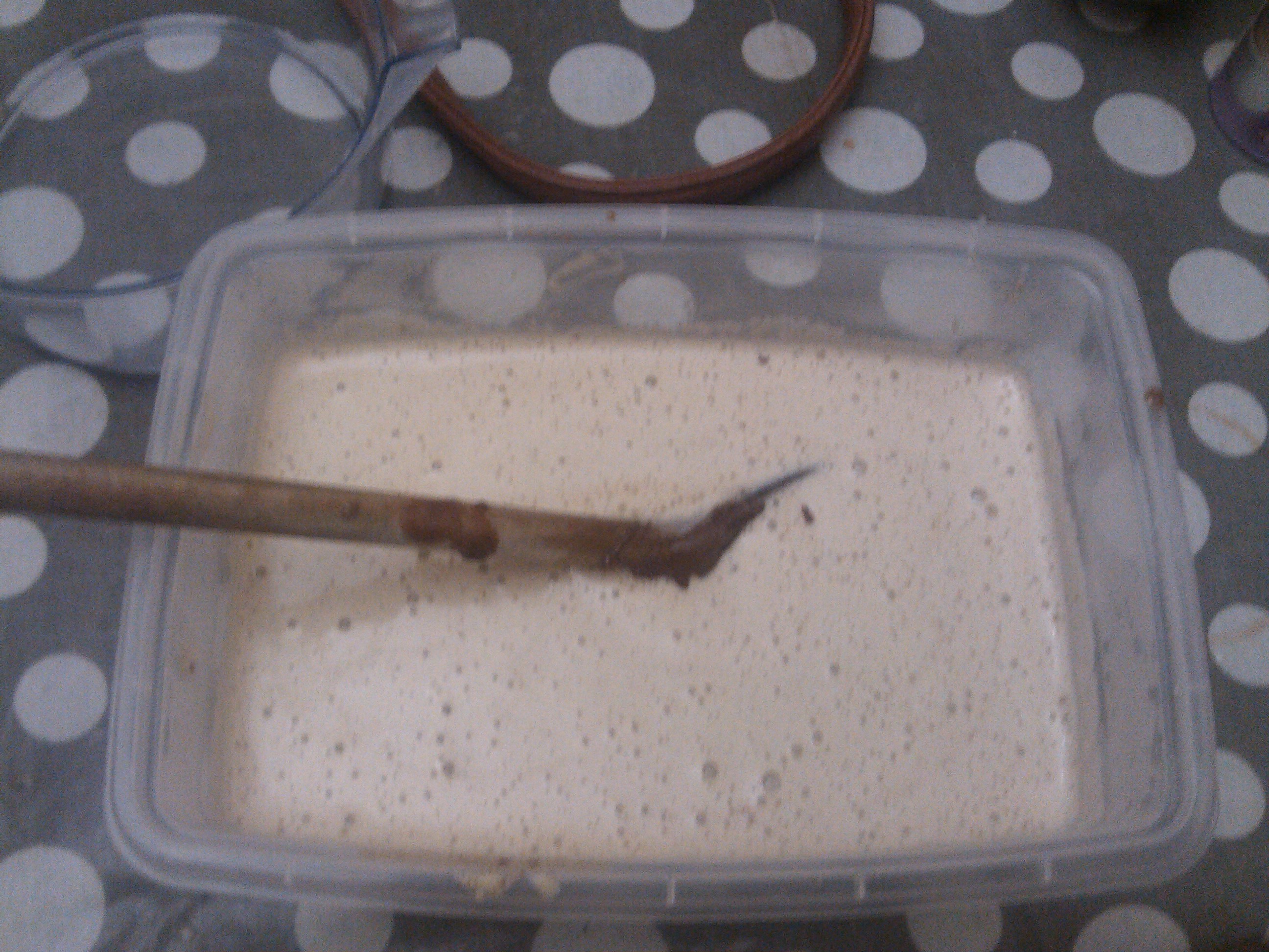 Refrigerate for 2 hours or until cold. At this point those of you who are lucky enough to have an ice cream maker can put it into that. Otherwise put it into your freezer and periodically (about every 30-40 minutes) beat the ice crystals from the edge of the container with a fork. When your ice cream has nearly frozen put it in your food processor or use a hand blender to break the ice crystals before freezing until hard.