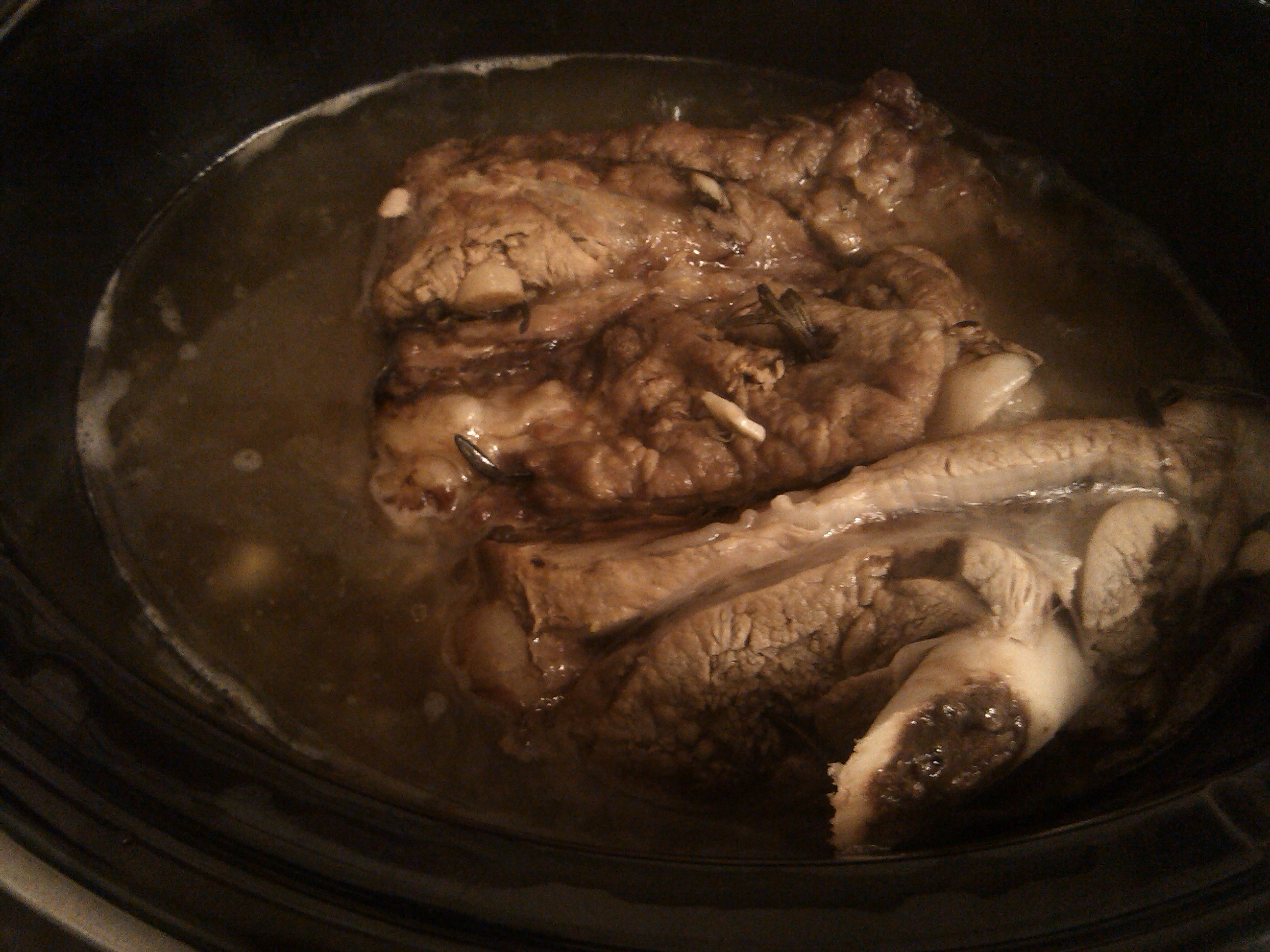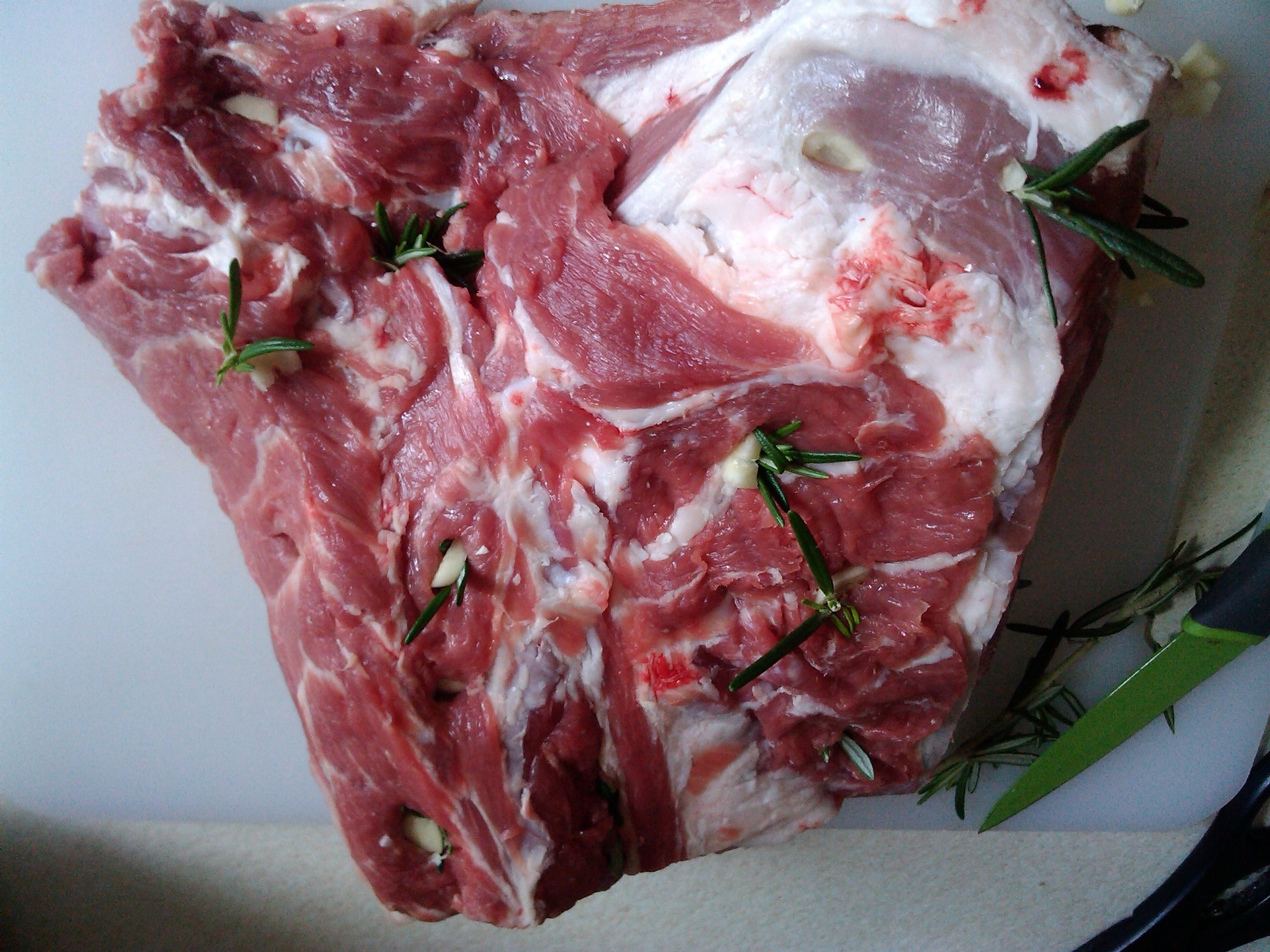 Heat a large frying pan and place your lamb in it fatty side down with any remaining garlic (add oil if there isn’t a particularly fatty side). Turn your lamb to ensure that it’s more or less browned all over. Place in your casserole dish or slow cooker. Cover with the stock and white wine and cook for 6-8 hours with a lid on your slow cooker/casserole dish. If you’re using the oven you want the oven around 100°C; if using the slow cooker it should be on low.