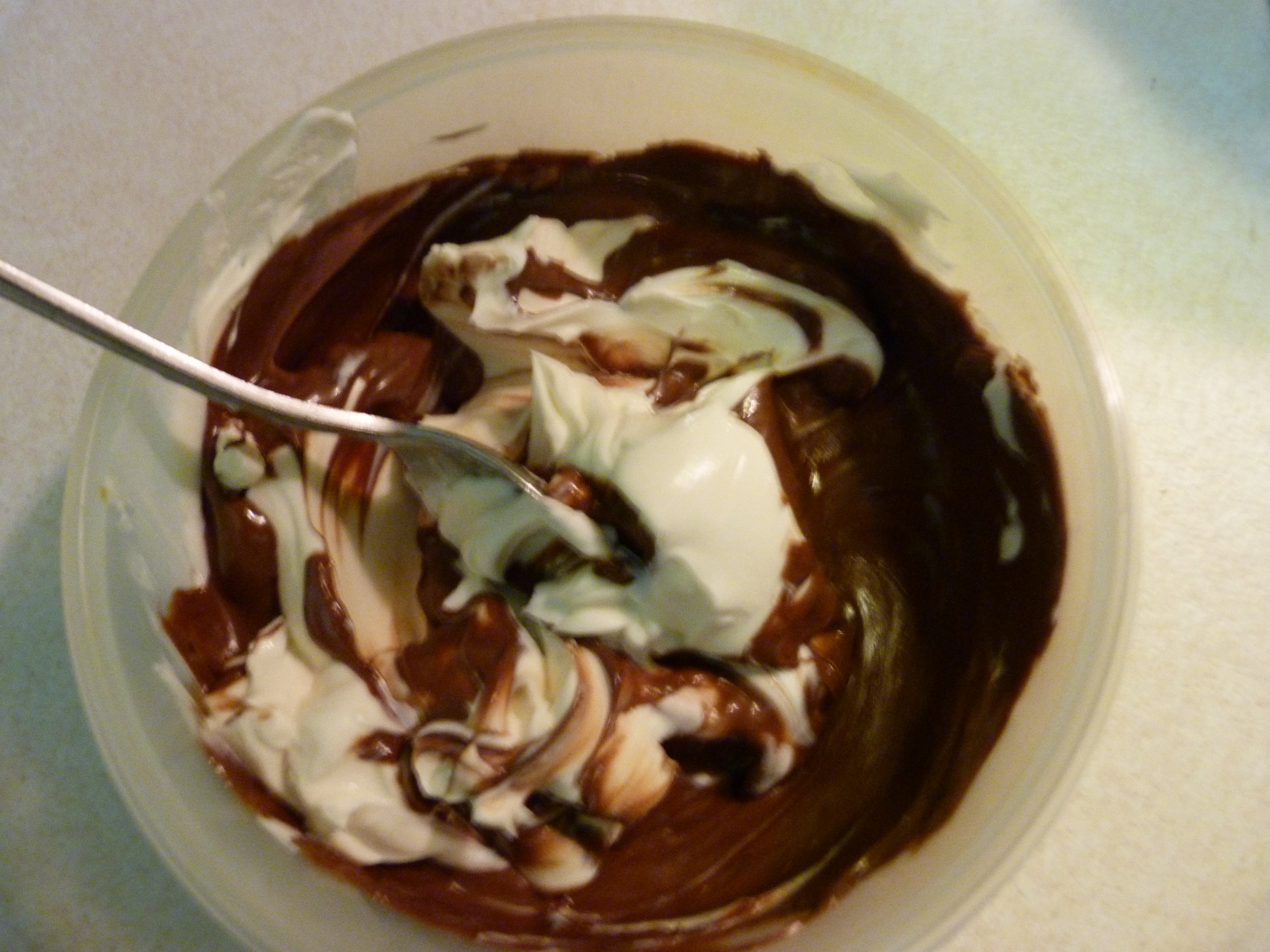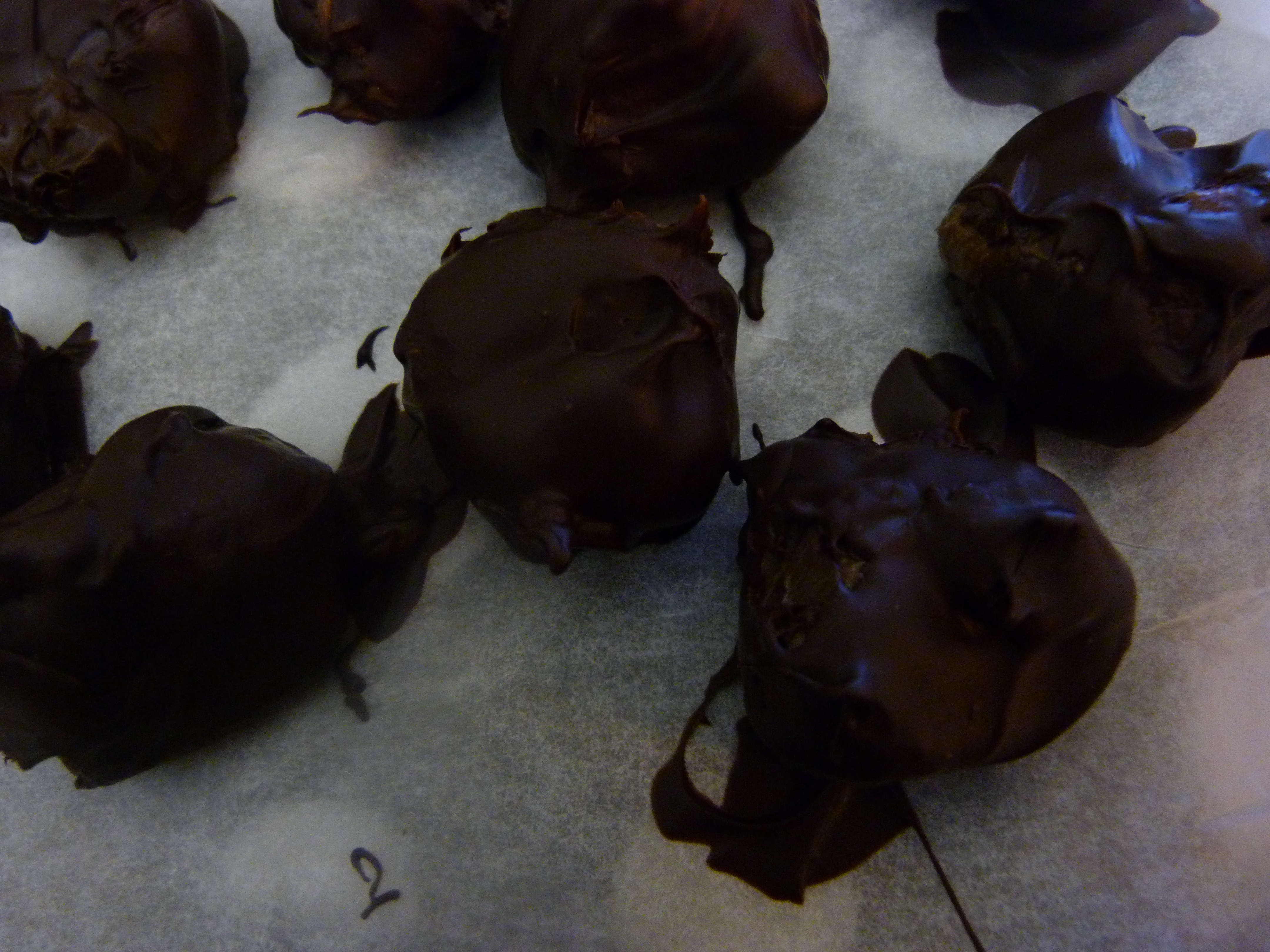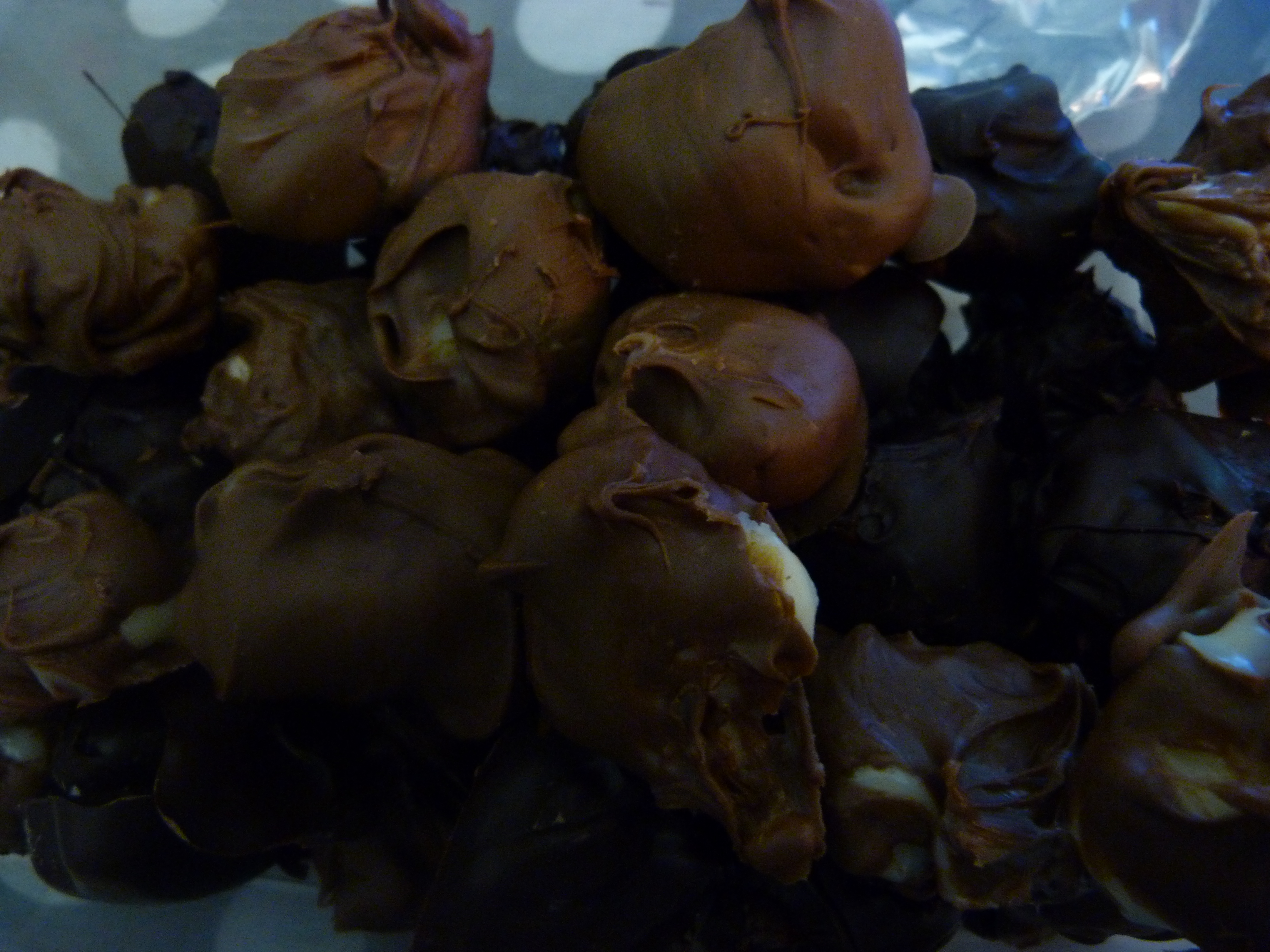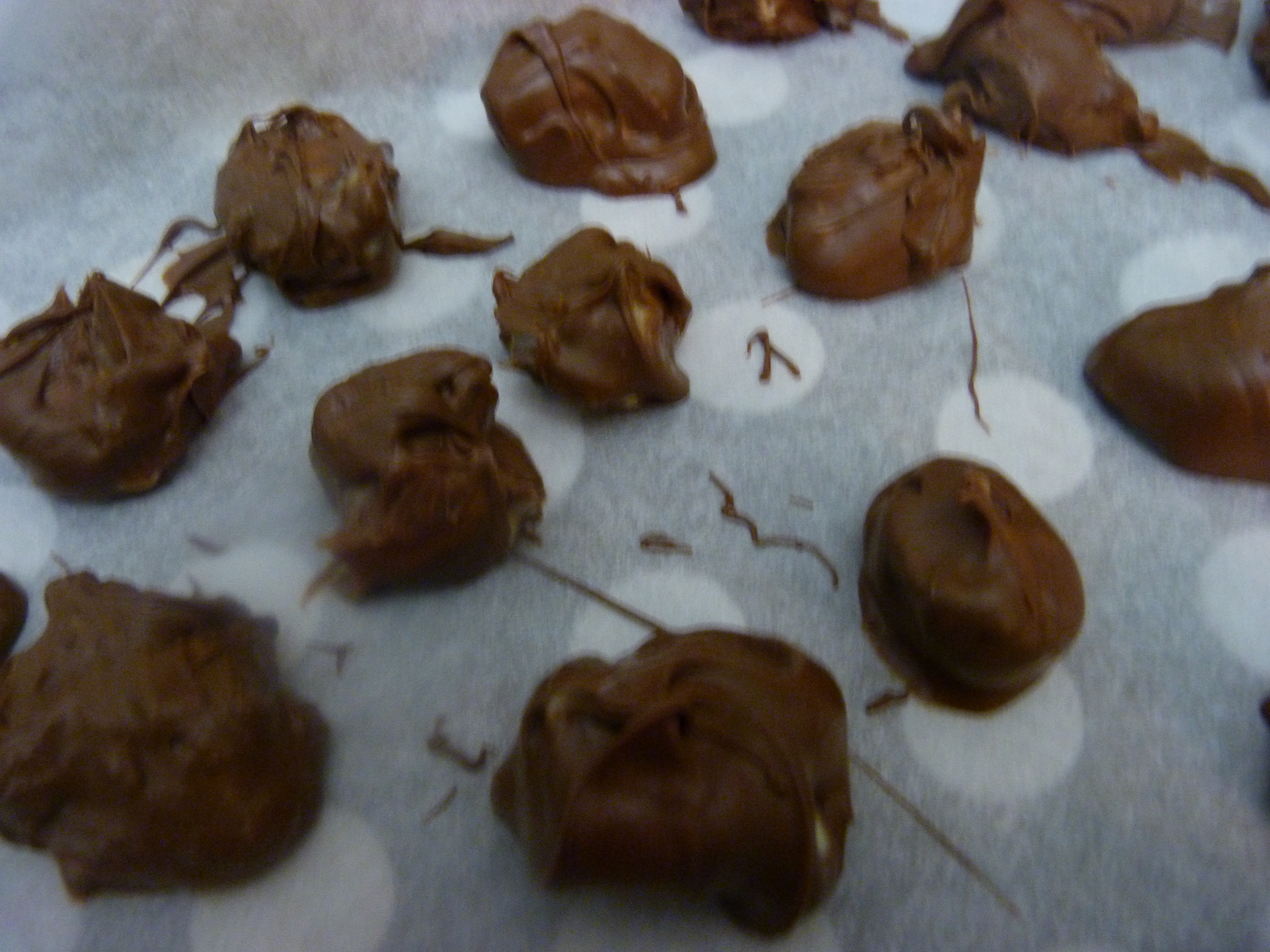P1040667Dip your Nutella chocolates in the dark chocolate to decorate. Allow to cool.