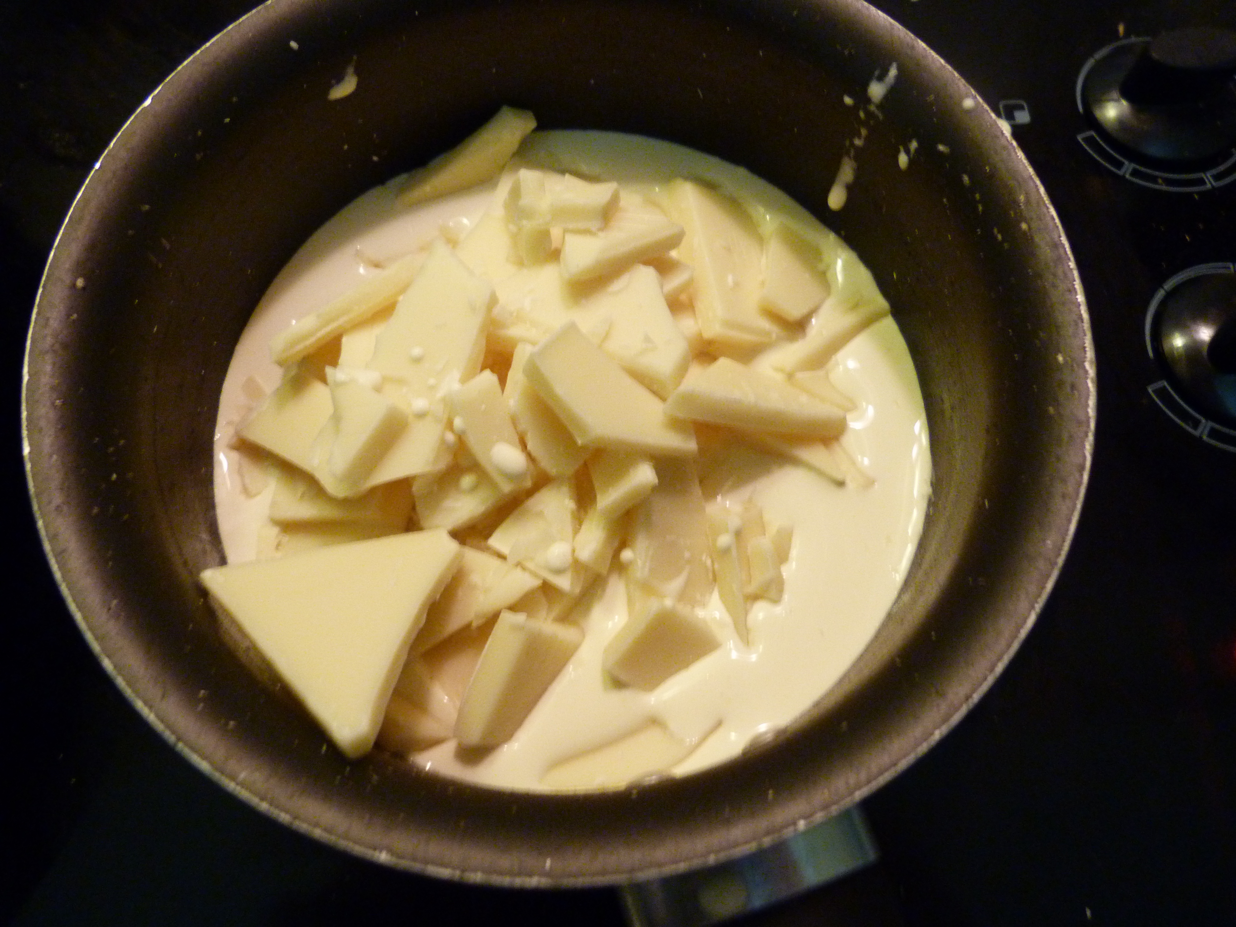 Anyway for the truffles with the white chocolate filling you need to break up your white chocolate and heat it gently with the cream until the chocolate has fully melted into the cream and the whole thing has slightly thickened. Cool this in the fridge for an hour and then transfer to the freezer for several hours as white chocolate ganache tends to be more challenging to handle than milk or dark chocolate ganache.