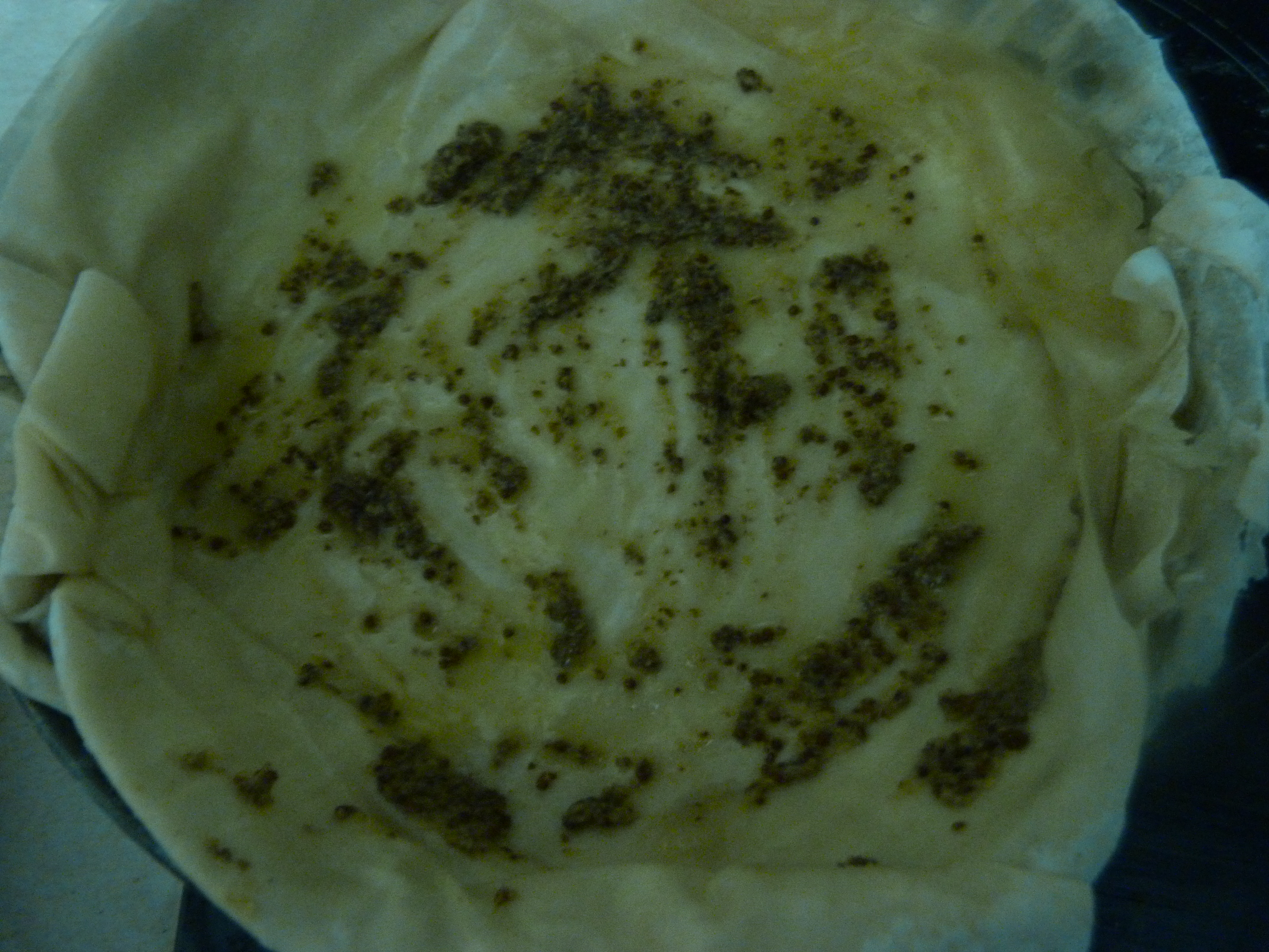 Preheat your oven to 180°C. In a lose bottomedtin arrange your sheets of pastry into a base shape brushing the melted butter on the pastry sheets between layers.
