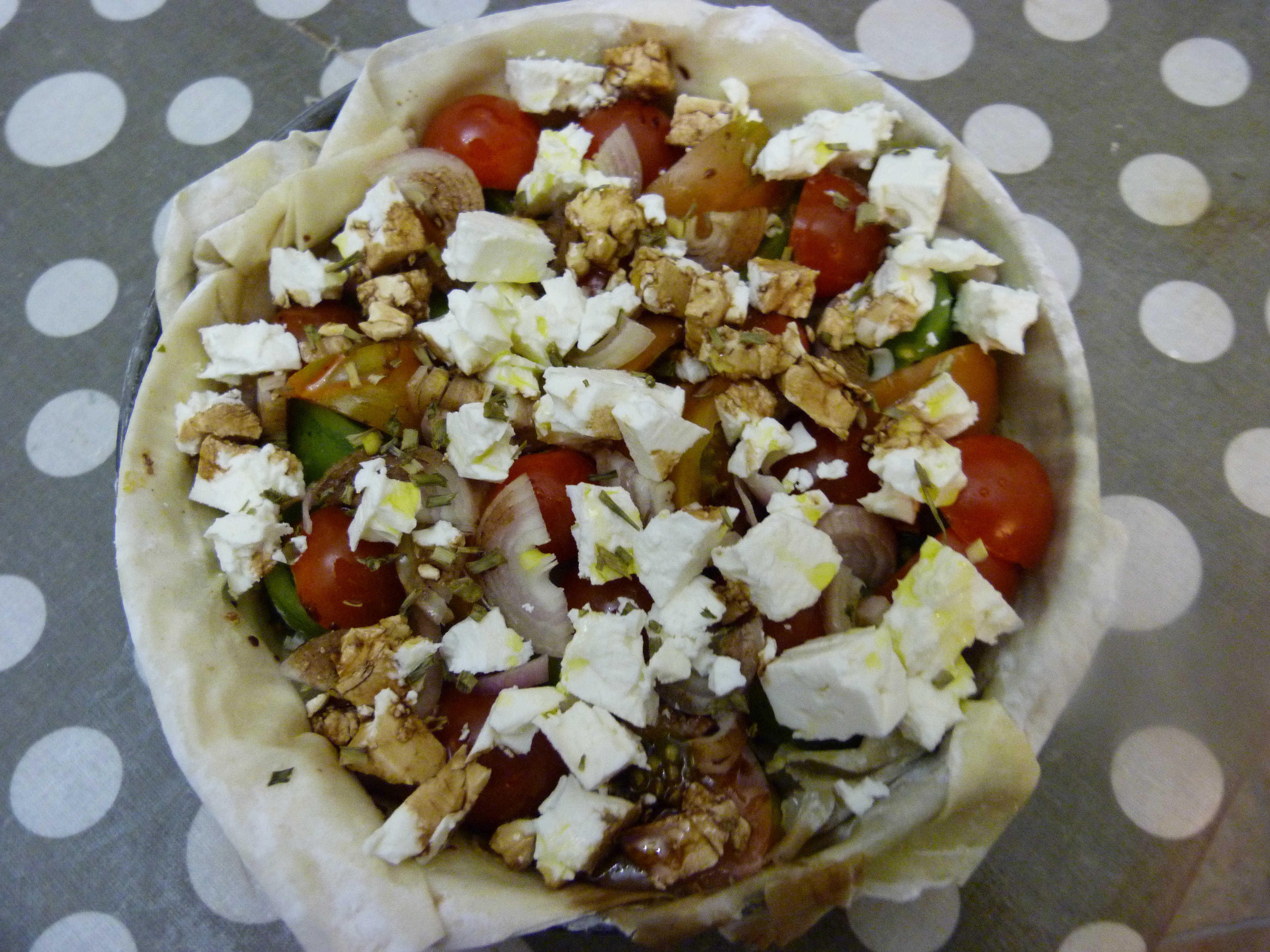 I don’t know why filo pastry makes pastry based goodies look so much prettier; but I think it does. It also works well in this recipe as it is light and an excellent carrier of the different flavours of tomatoes and feta. My mother used to make a similar tart from her French cookery book (which I will blog about at some point as its wonderful) but in this case as with most of my recipes I decided what I fancied and went with it. This is the result.