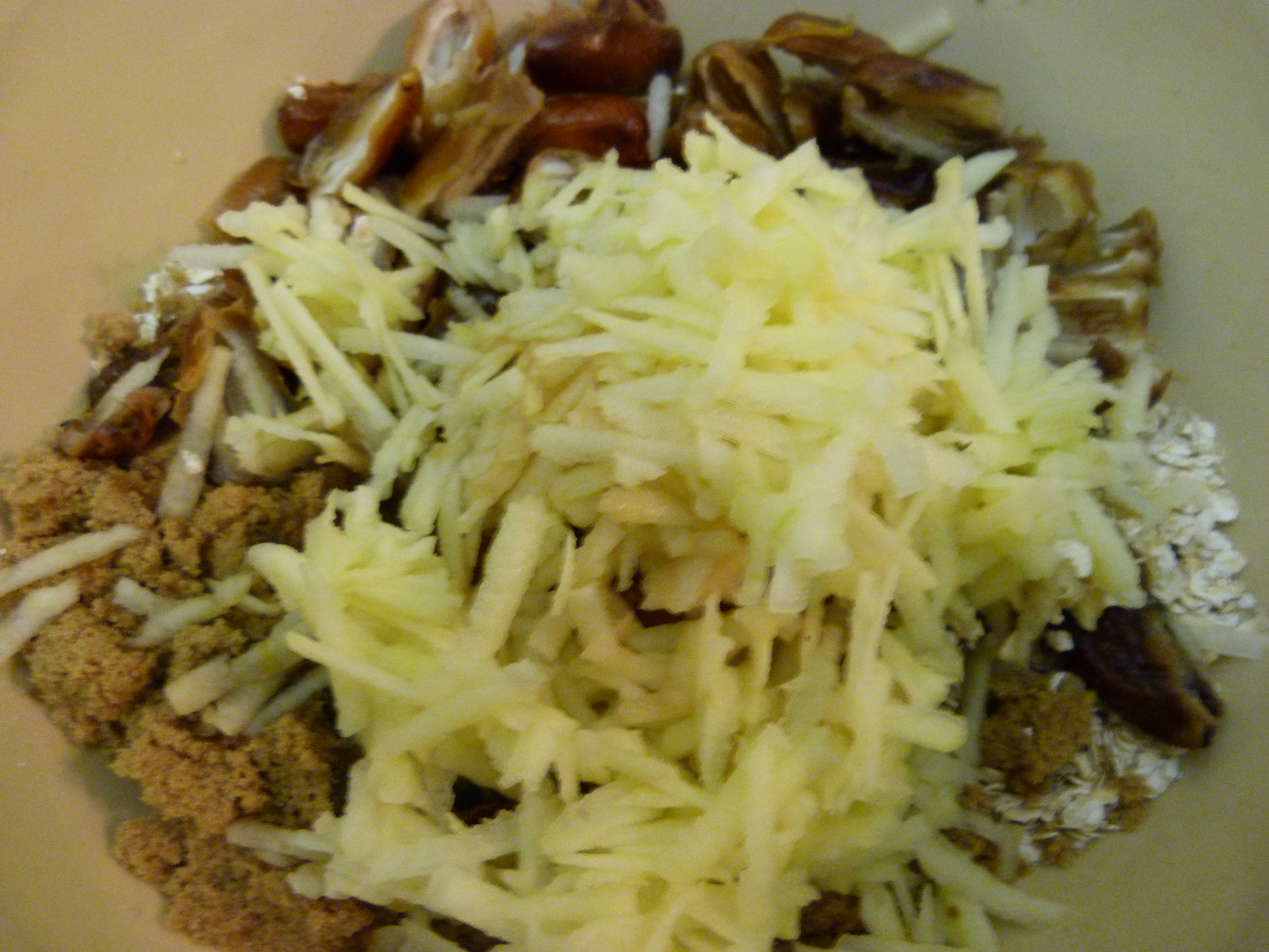 Stone your dates and cut into small pieces. Put these into a bowl with the tea to soak for a few minutes. Grate the apple and add it to the mix and put to one side. At this point grease your baking tray and preheat your oven to 180°C.