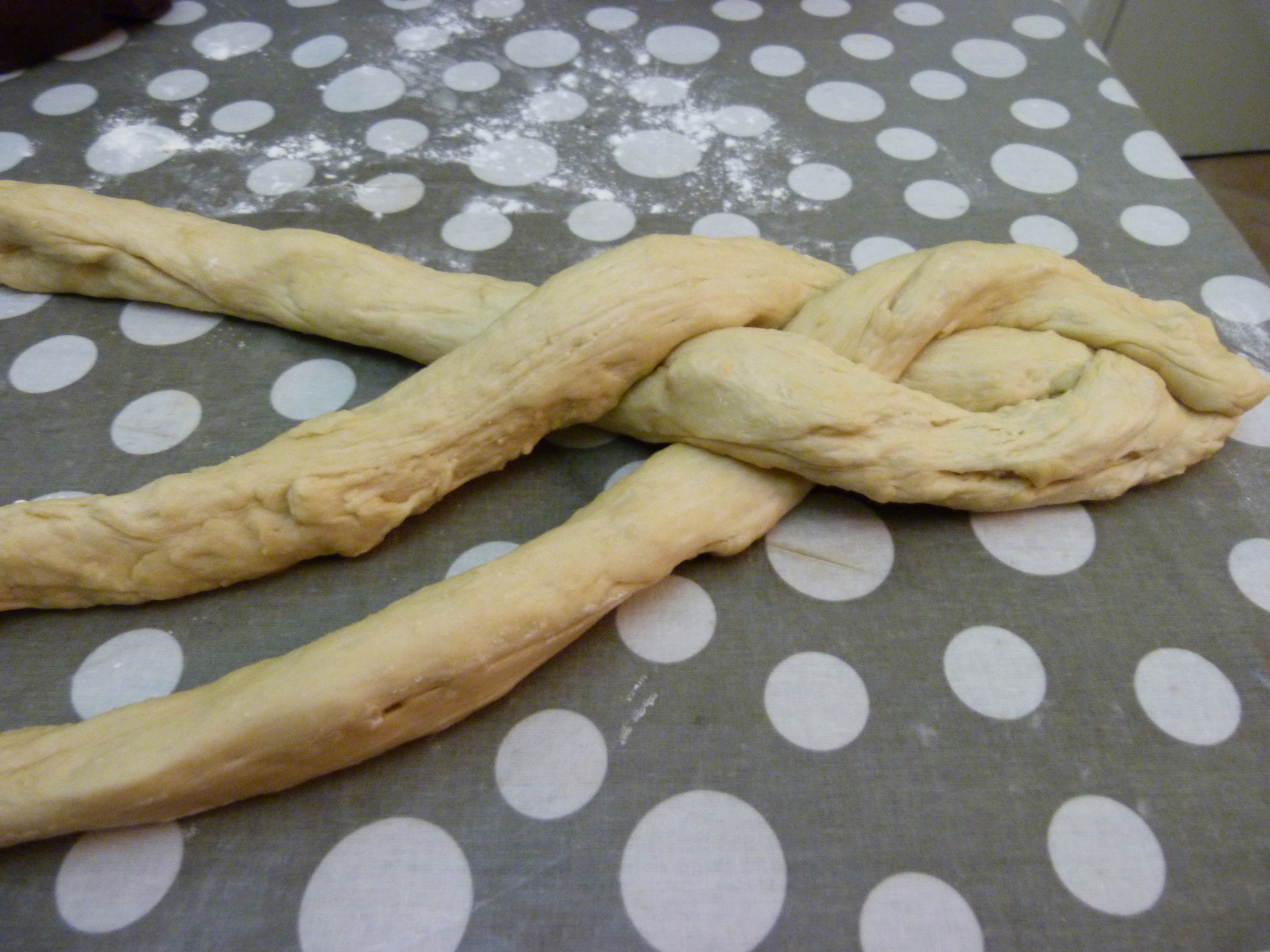 Knock your dough back and divide into three equal pieces (don’t spend ages getting them exactly the same, life is far too short). Roll into long thin sausages of equal length (at least 20cm). Join together the 3 dough sausages at one end and plait like you would plait somebody’s hair. Men, do not be afraid of plaiting! My own father plaited my hair when I was a child! At least your plaiting will result in tasty bread and not me telling you your sandwiches aren’t as nice as when my mum makes them.