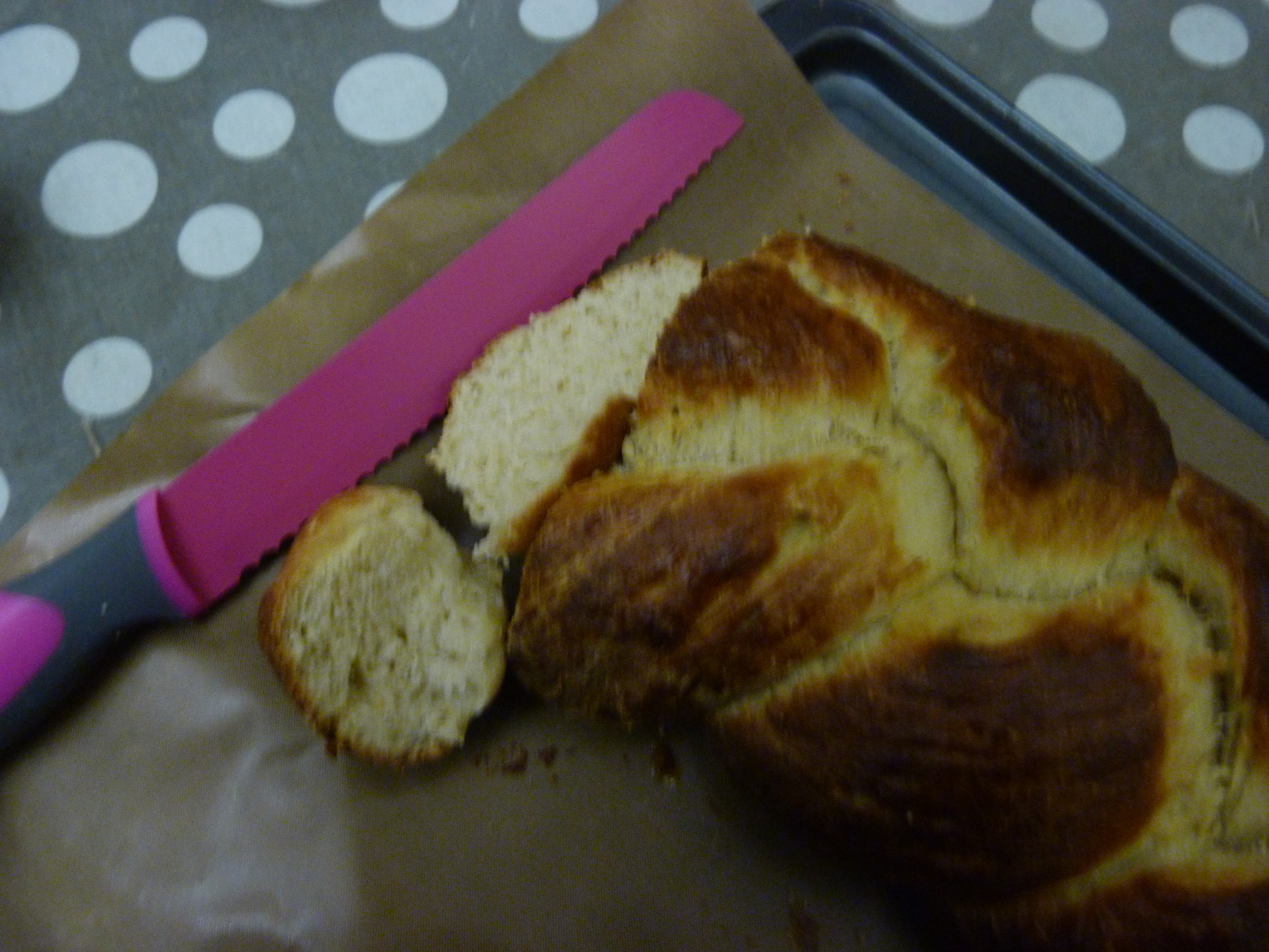 I recall asking one of my parents what on earth challah was. Anyway myself, Miss M and Miss B made challah load as part of our baking club some months ago. However, being short of time meant that it didn’t really have time to rise or prove properly resulting in quite a close texture in the loaf. I made this again on one of my days off from work a few weeks ago and I don’t think I’ve ever eaten a loaf of bread so fast. Half a loaf was gone in 2 days! This bread is delicious with just butter (simple pleasures!) but it also works well with a variety of sweet and savoury toppings. My particular favourites during what is fondly remembered as “bread gorging week” were good quality raspberry jam and (very much not kosher) ham.