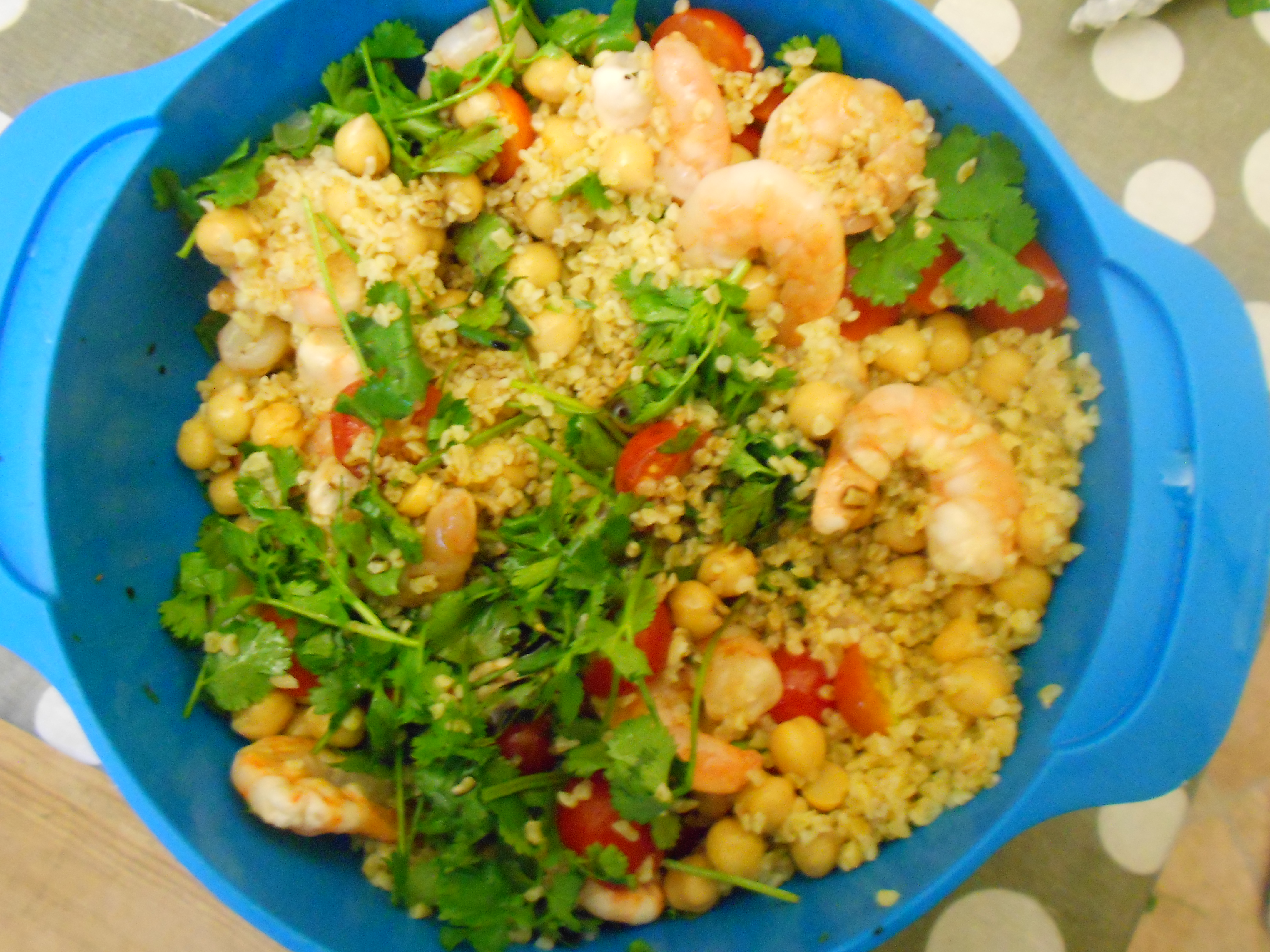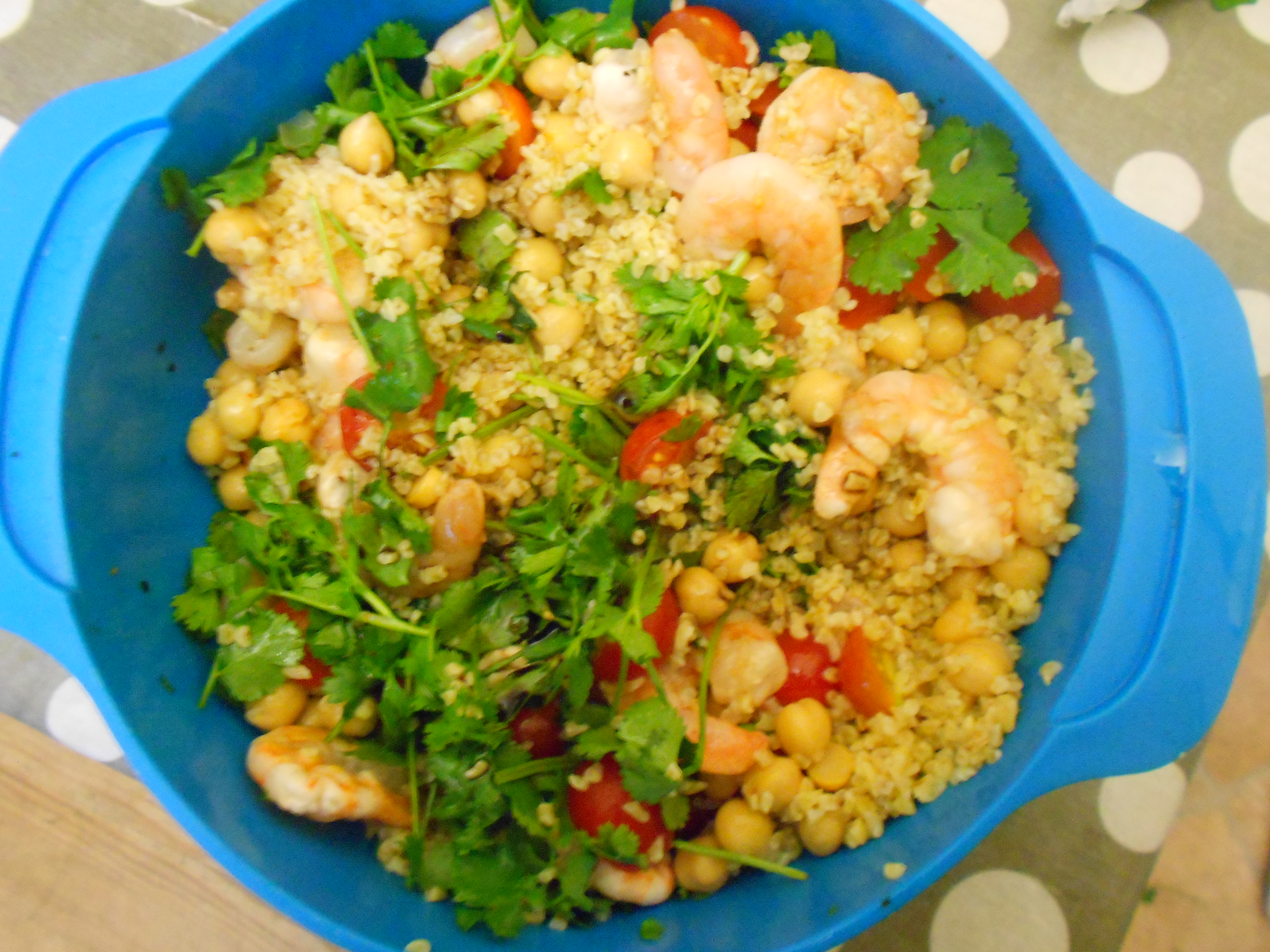 Cook the bulgar wheat following the instructions on the pack (but using your chicken stock). Butterfly your prawns for even cooking. Slice your chilli and peel and rush your garlic and fry or grill alongside the prawns. Slice your tomatoes or if they are smaller halve them. Combine all of the above ingredients in a large bowl with your drained can of chick peas. Add your salt, olive oil and lemon juice to taste. Chop our fresh coriander and use this to top your salad.