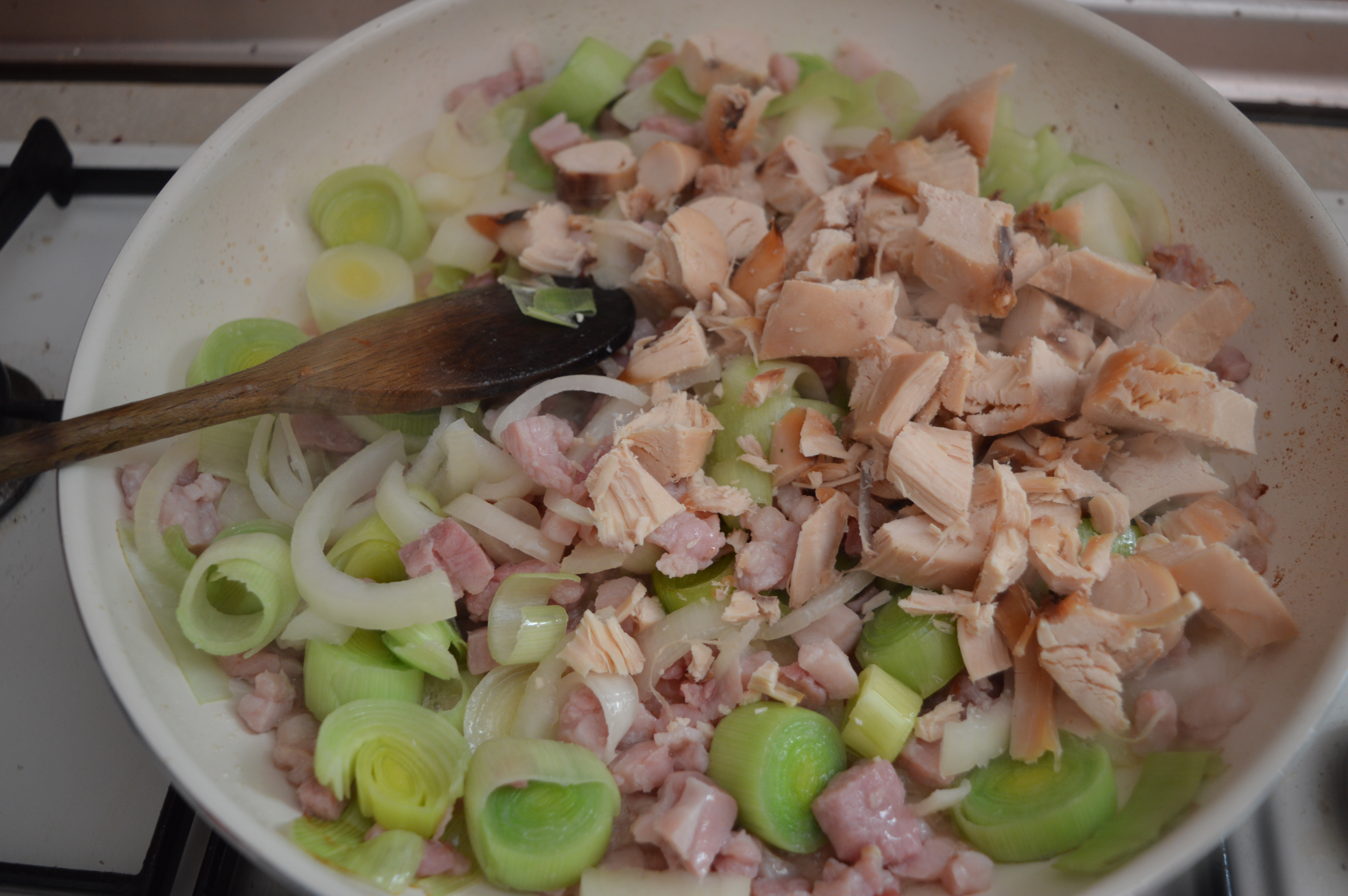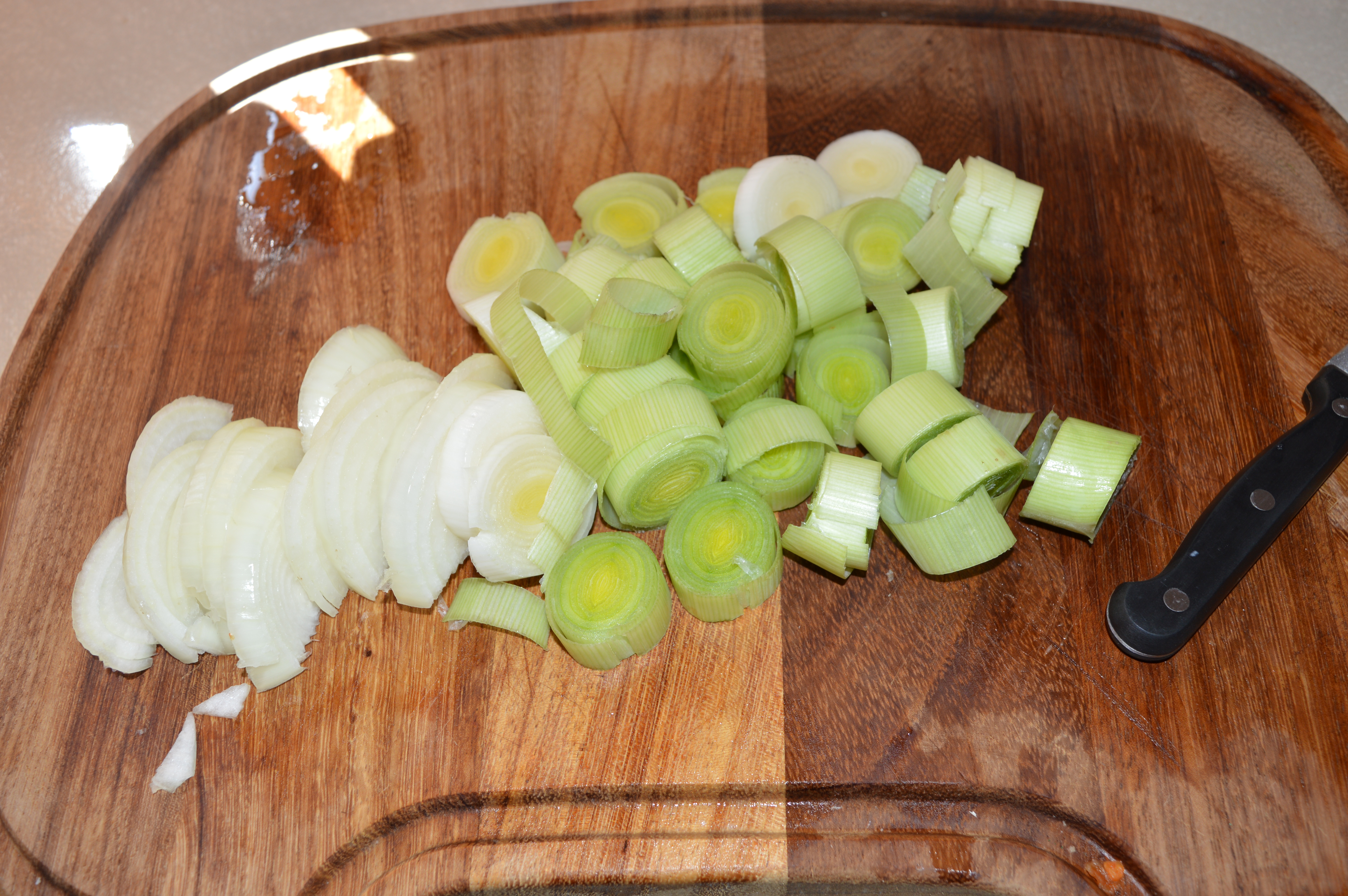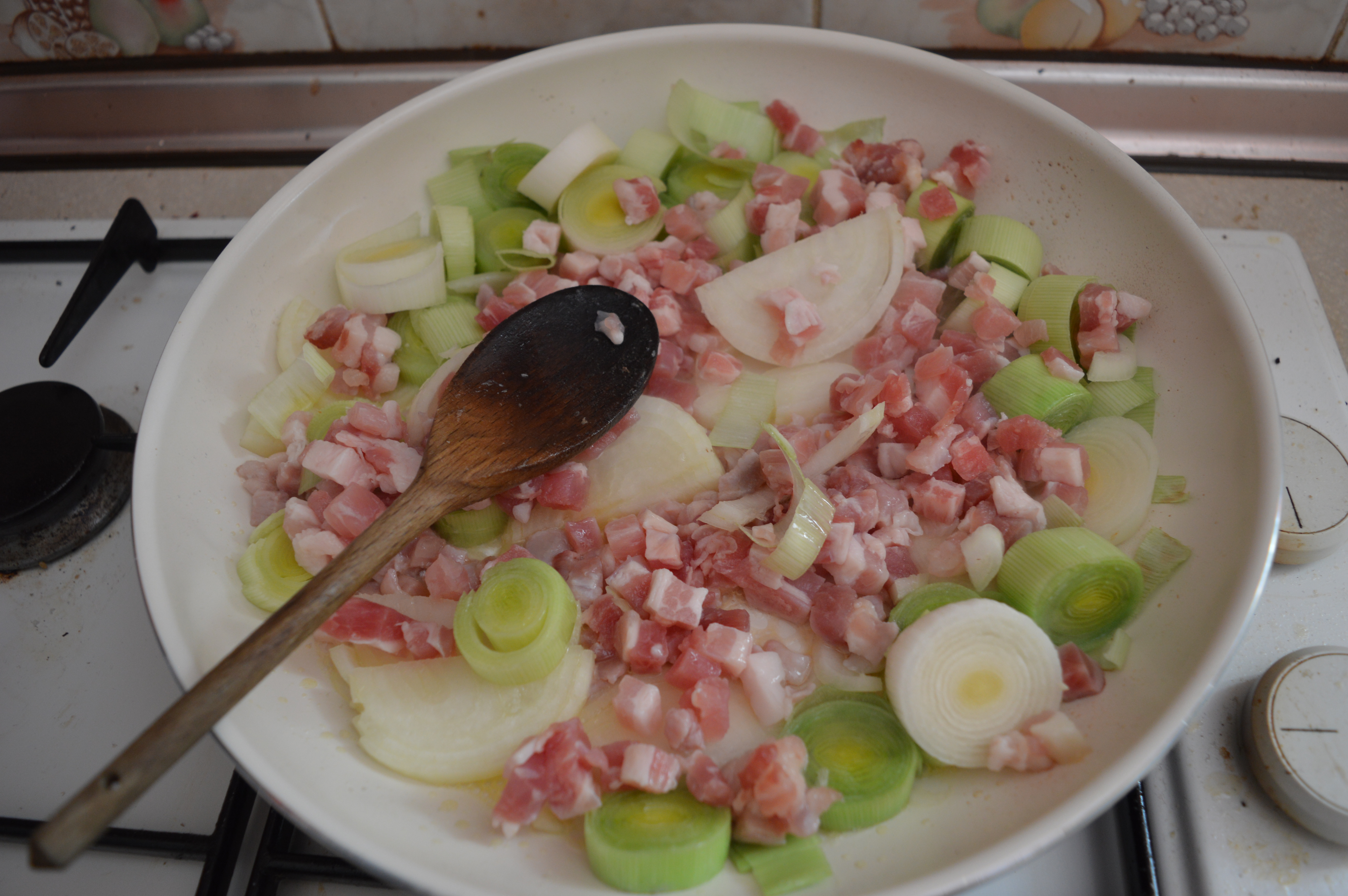 Peel and slice your leek and onions and fry in your butter until soft.