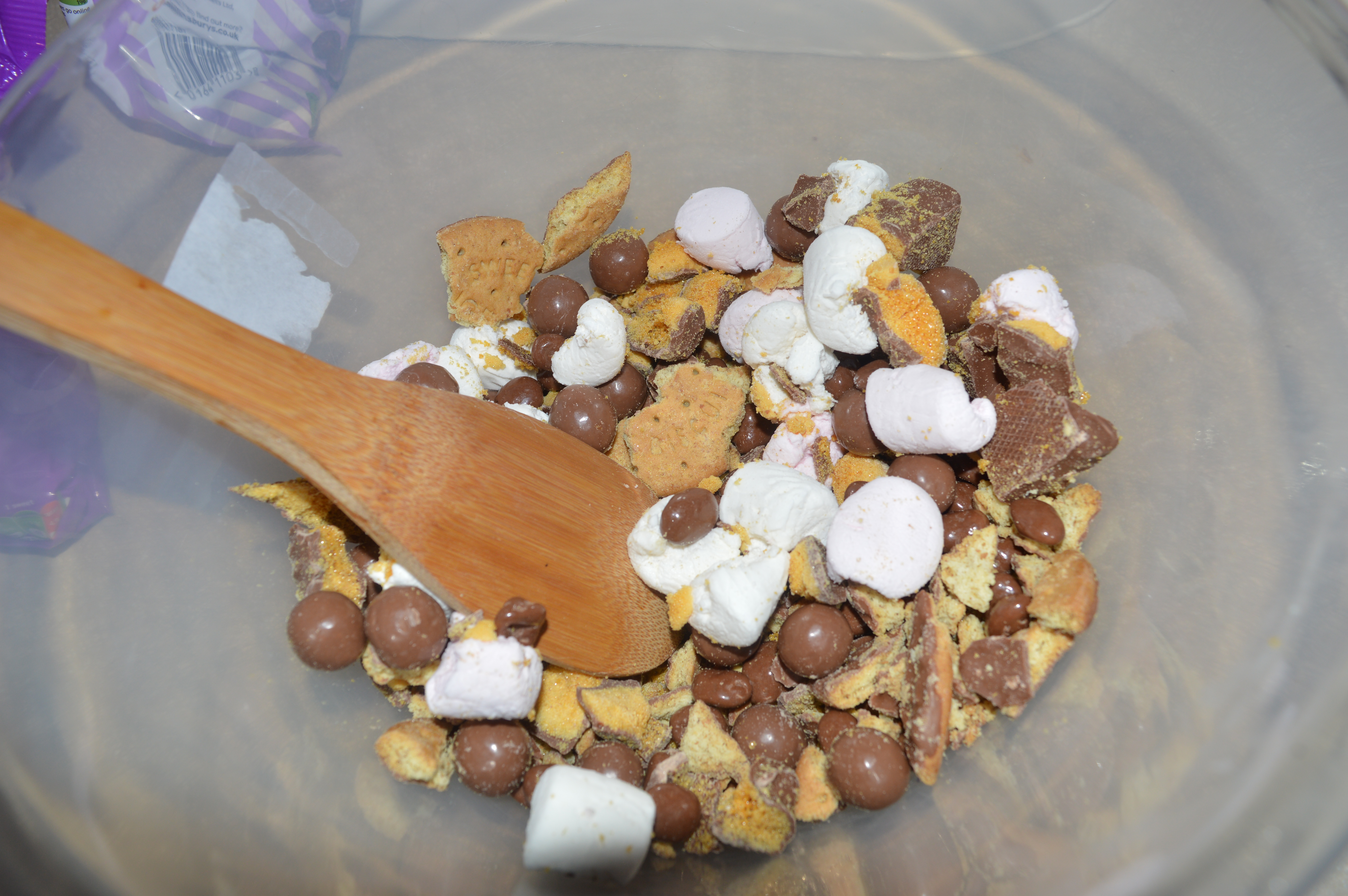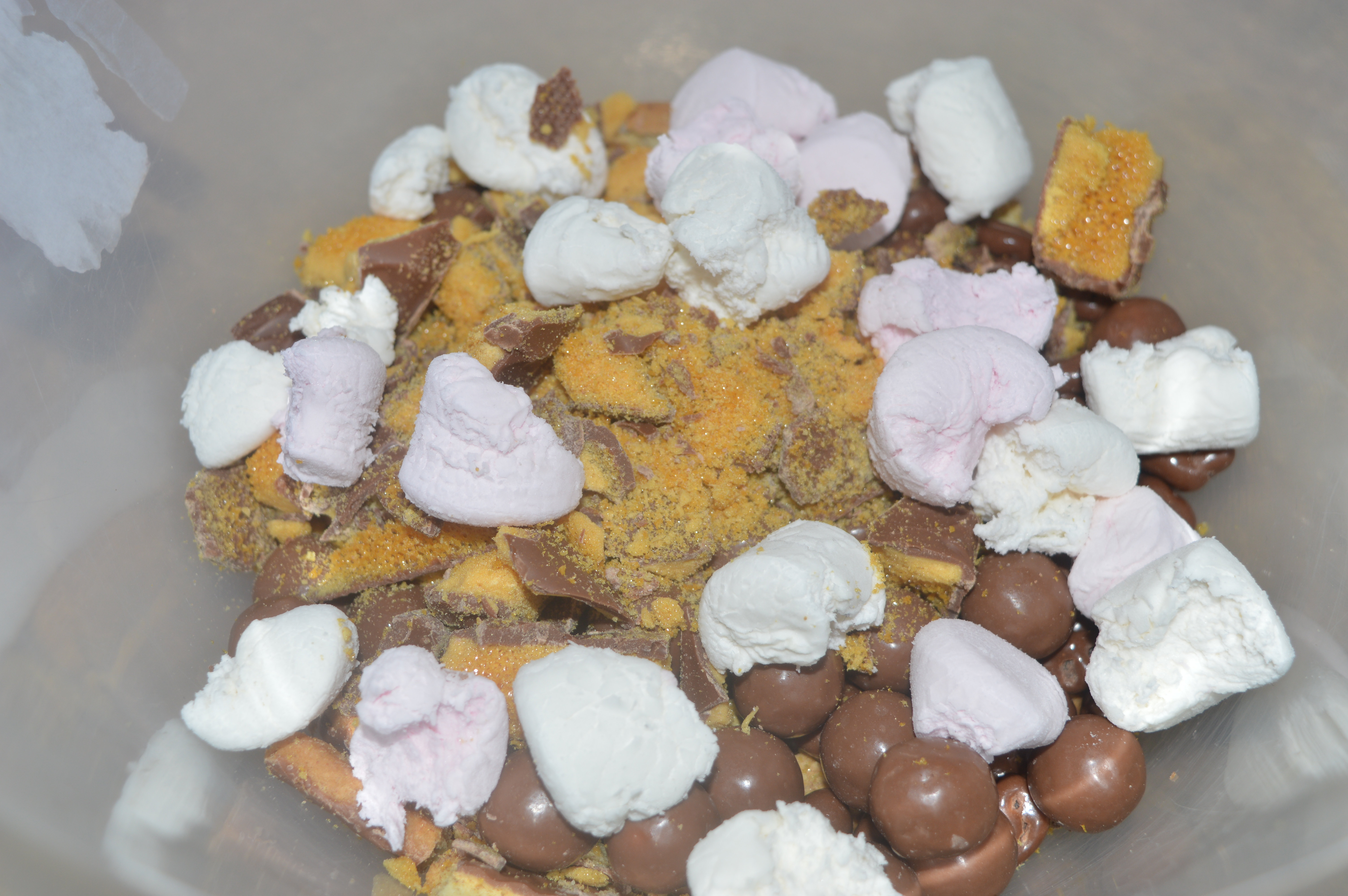 In a large bowl use a rolling pin to crush your biscuits and crunchie bars into small pieces. Cut or tear your marshmallows into small pieces and add to the bowl along with your malteasers and chocolate raisins and mix.